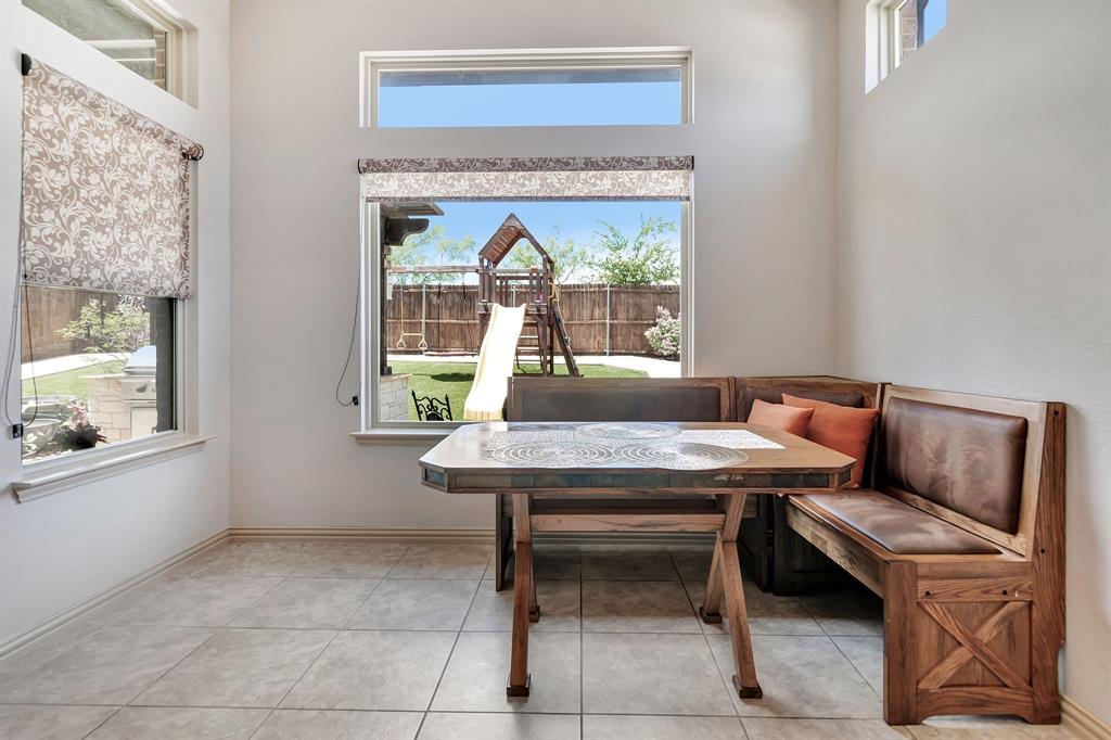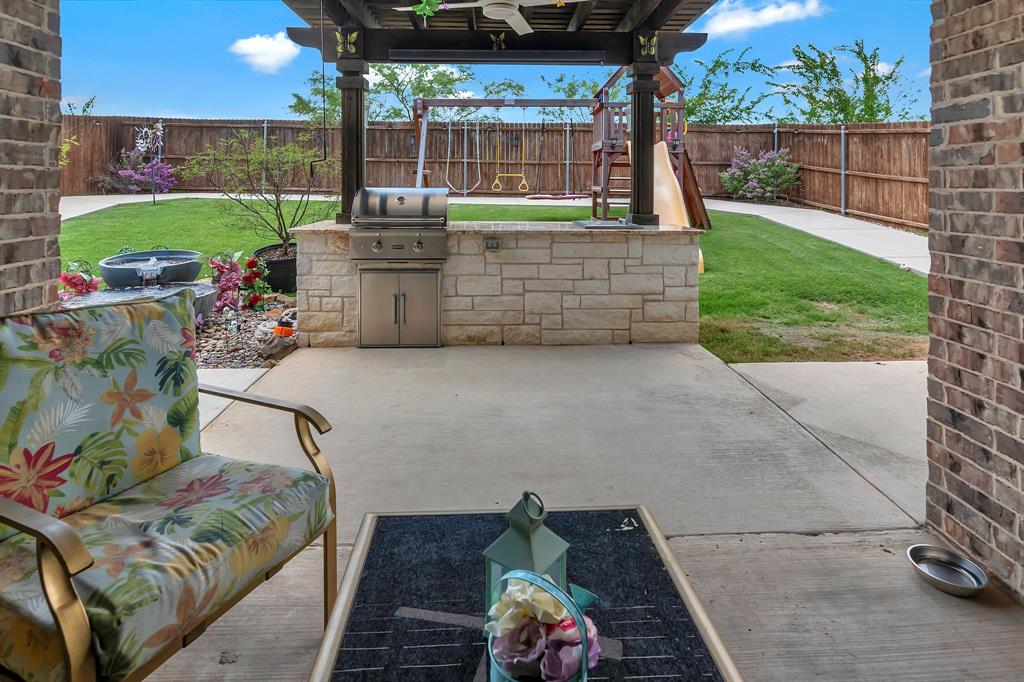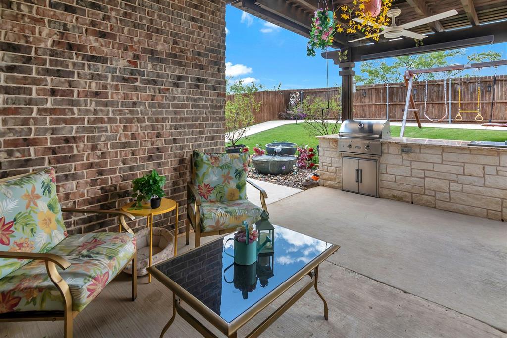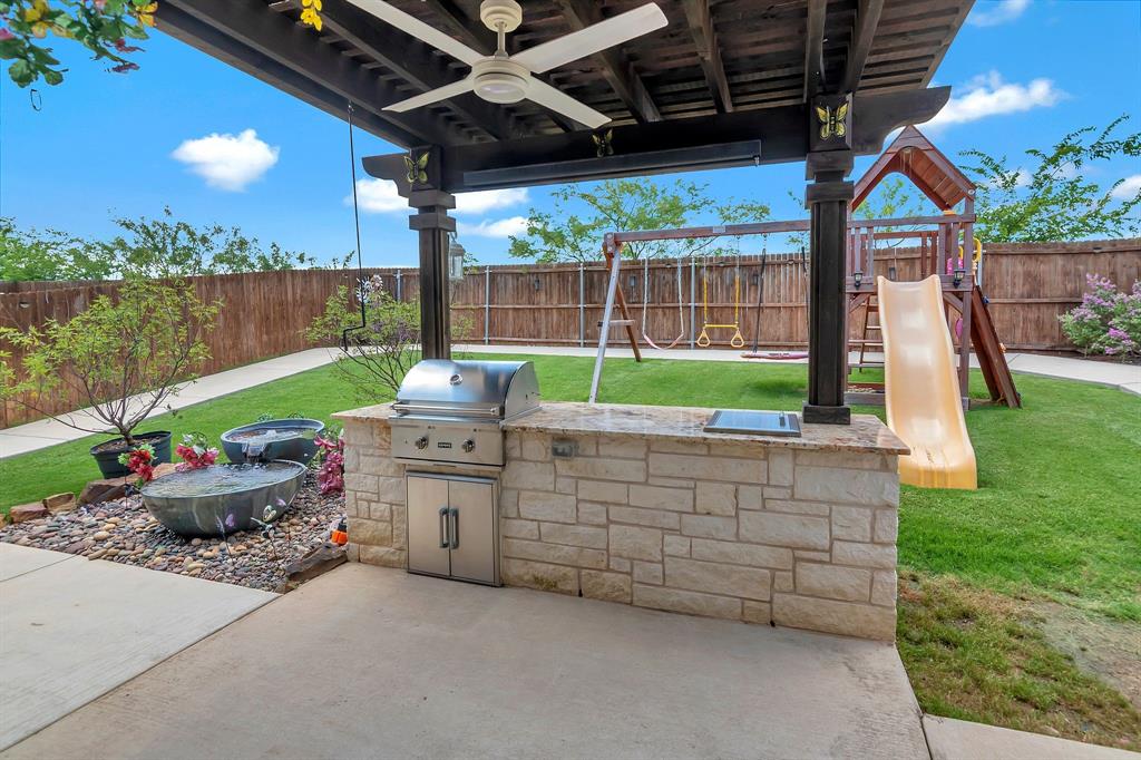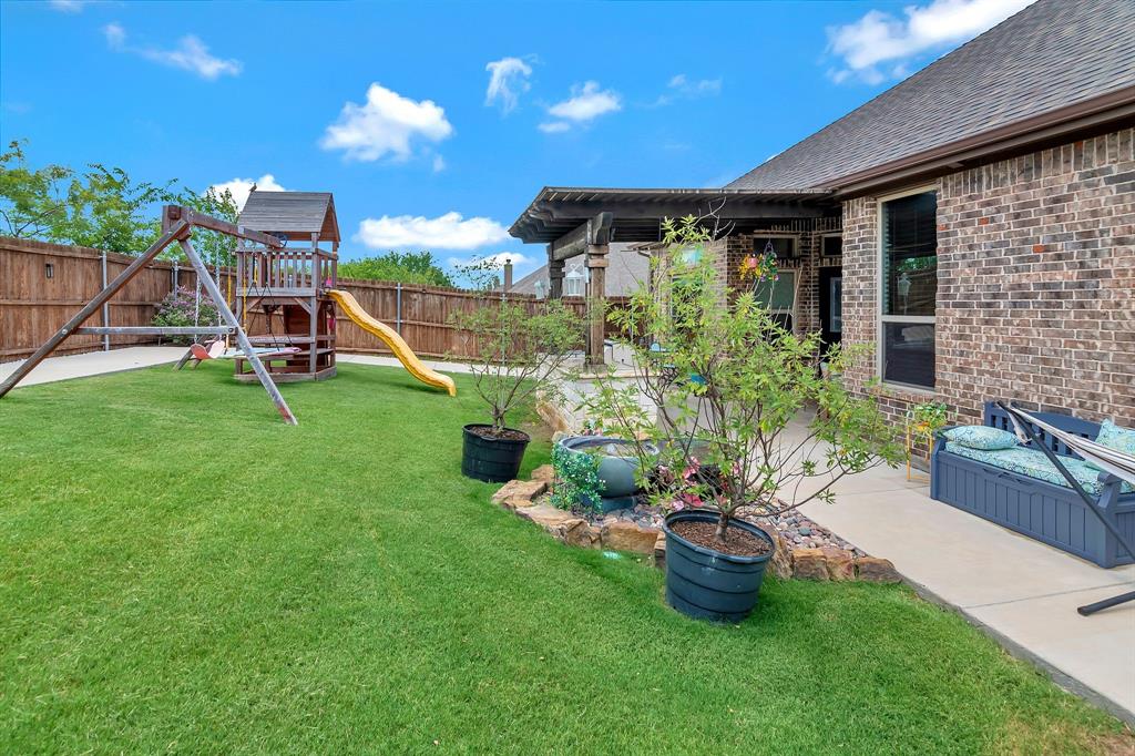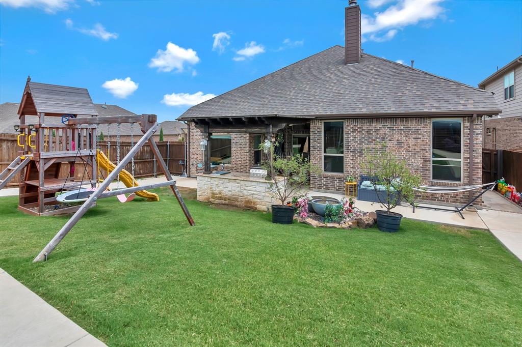 Lovely home located within the Northwest ISD. This home has too many features to list here, so an extensive “Property Features & Upgrades” is uploaded into the MLS Supplements for your review. Beautiful curb appeal leads you into this home. The entry opens to flowing wood floors throughout most of the downstairs. The dedicated office is off to the right with French doors that could be a 5th bedroom if needed. All bedrooms are carpeted & all wet areas are tiled. A secondary bedroom is down for family or guest with a full bath close by. The dining & family rooms are open to the kitchen & breakfast nook for entertaining family & guests. The kitchen & breakfast have tiled floors, granite island & counter tops, 42 inch cabinets, walk-in panty, electric cooktop & oven. The family room has a brick wood burning fireplace with mantel & gas starter. The large primary bedroom is off the family room with an en-suite. The primary bath has a separate shower, garden tub, two sinks, linen closet, enclosed toilet area for privacy & huge walk-in closet that will delight all. The upstairs has two secondary bedrooms, one full bath, one half bath, game room & media room. The game & media rooms are ready for those family events of entertaining, games & movies. The game room also has a dry bar with built-in cabinets. Going outside to the backyard oasis is a delight. The outside has covered patio, pergola, built-in grill, beverage cooler, concrete walk-way around the perimeter & full-size play center for the kids, with plenty of area for the pets to roam. Party, party, party. The garage has custom epoxy floors & custom wall-mounted tool rack. This home is located close to major roads, restaurants, shopping & schools. A must see!