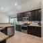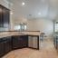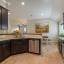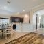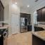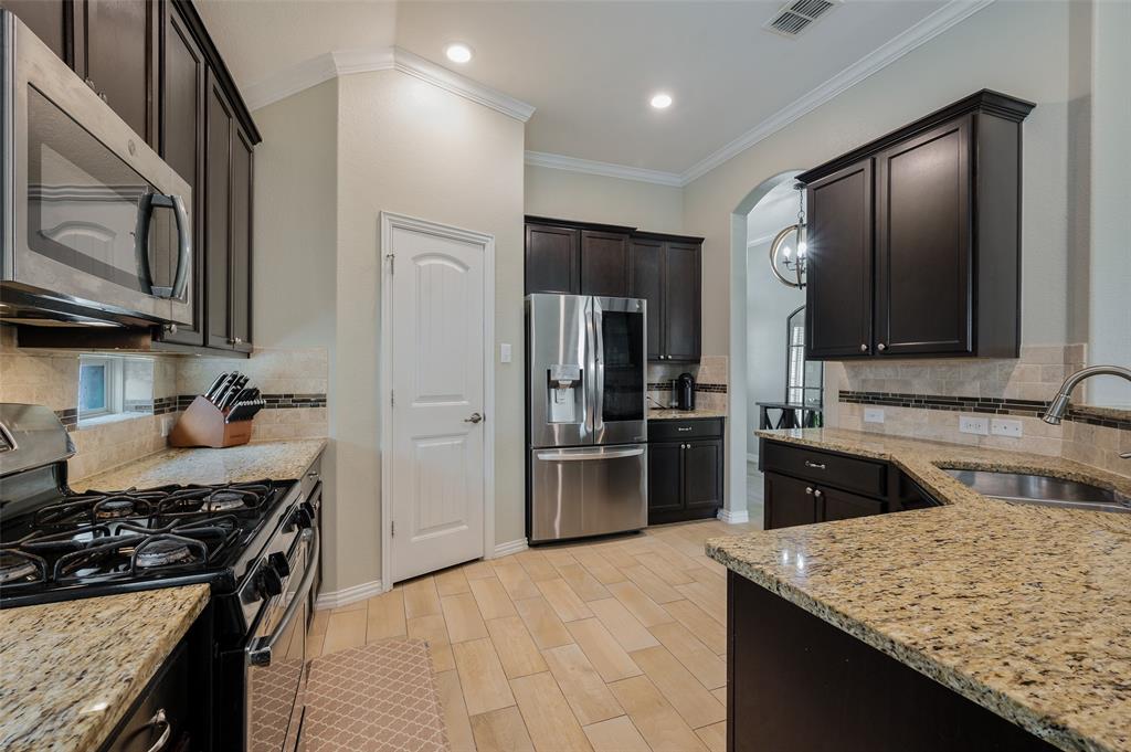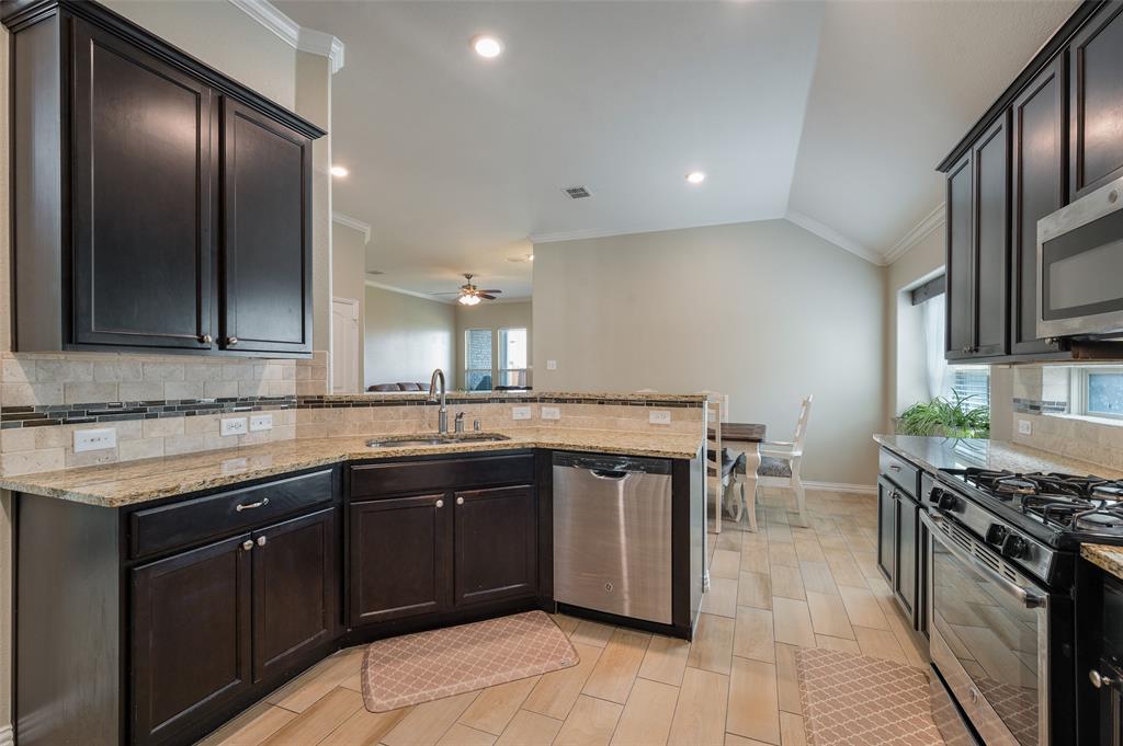 The open-concept kitchen offers rich dark wood cabinetry, granite countertops, stainless steel appliances, and wood-look tile flooring. The living area is filled with natural light and highlighted by crown molding and a cozy wood-burning fireplace. Laminate wood flooring and carpet were updated in 2018.