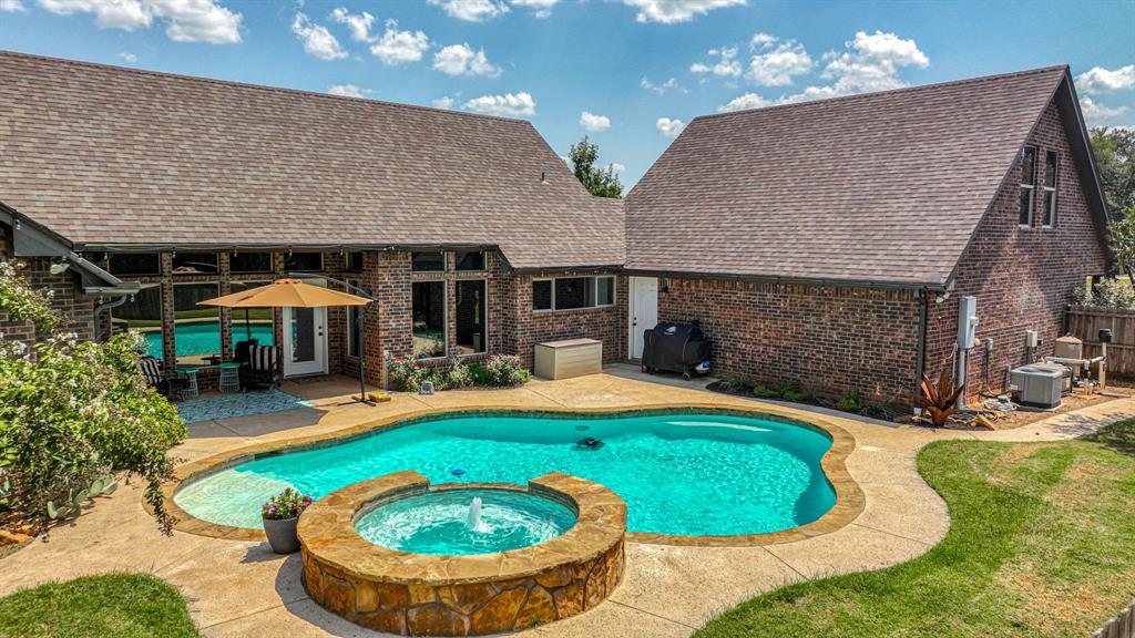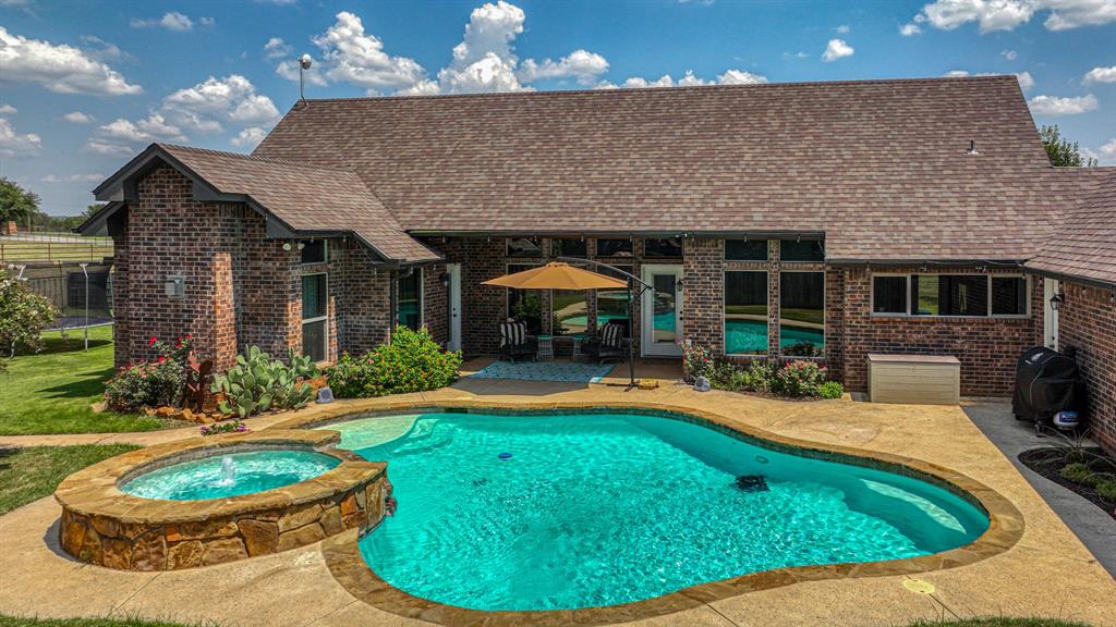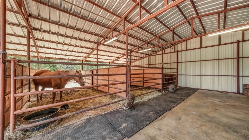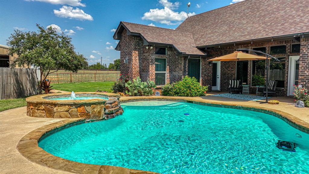 Step outside to a backyard paradise featuring a sparkling pool, heated spa, and a covered patio ideal for Texas evenings. The property is fully fenced with all pipe-and-cable fencing, designed for livestock or horses. Equestrians will appreciate the well-planned barn with stalls plumbed for automatic waterers, ensuring convenience and care for your animals.