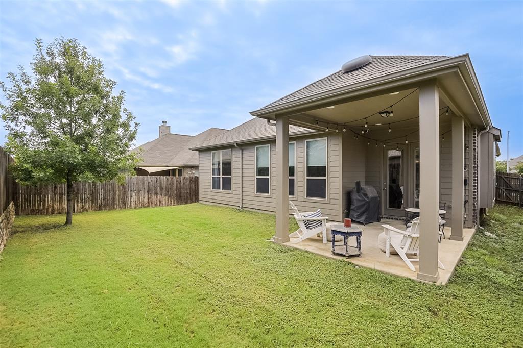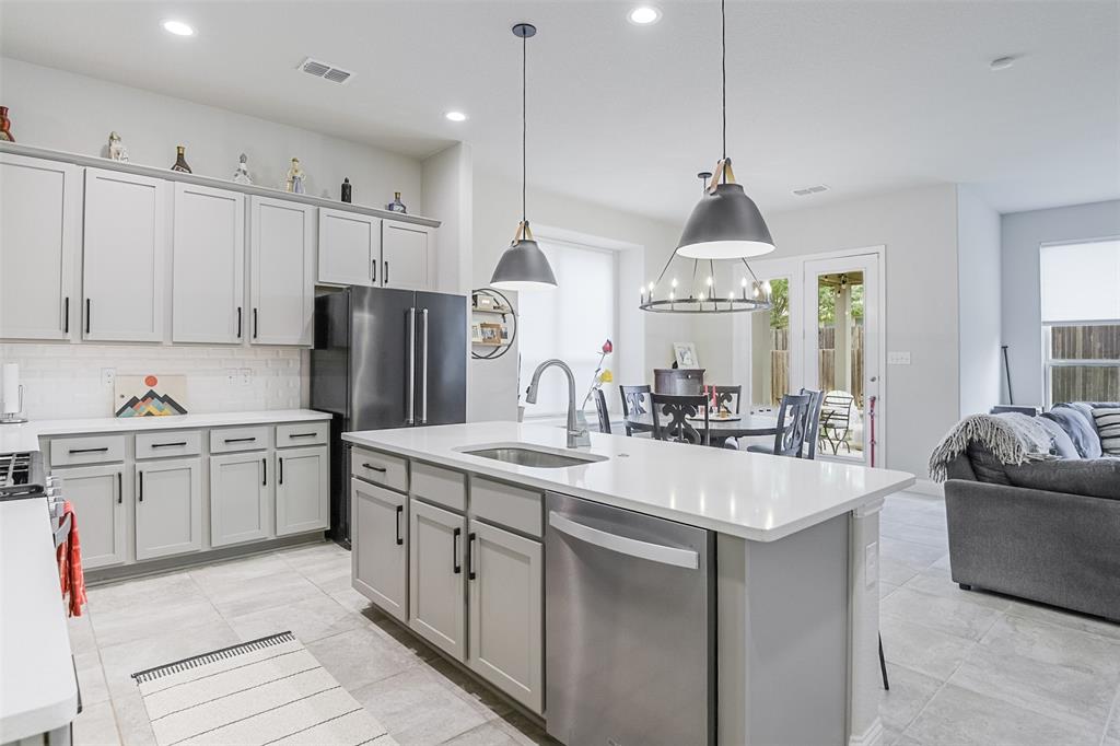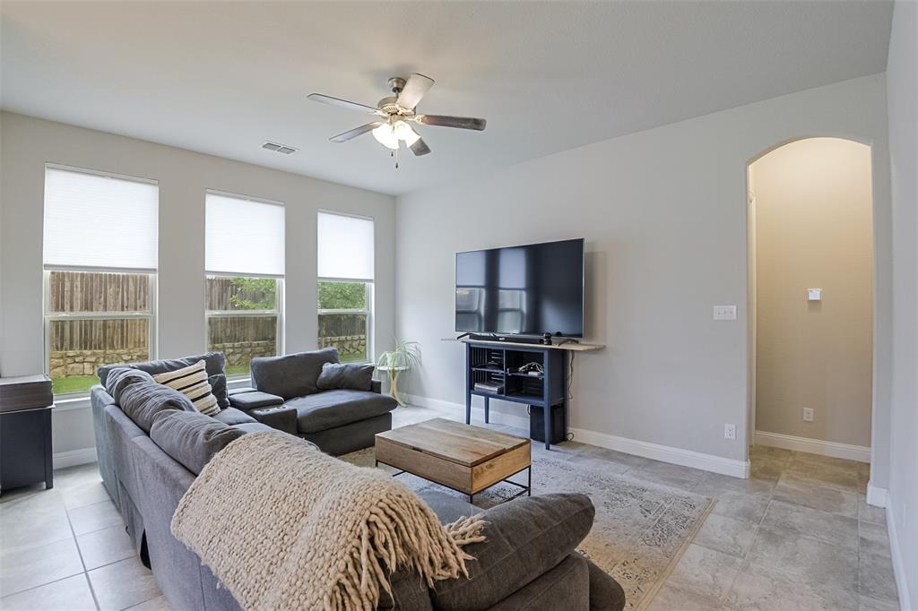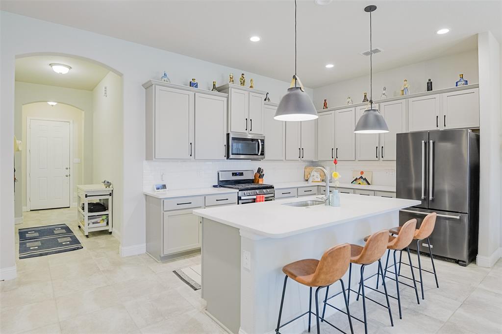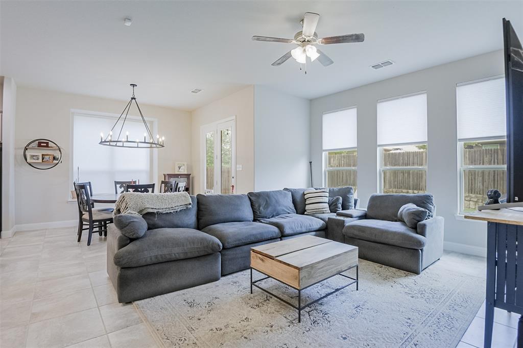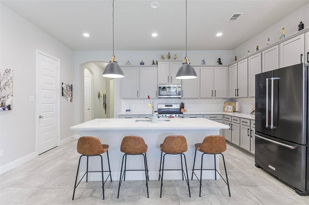 Welcome home to this beautifully maintained stone and brick residence that combines charm, functionality, and comfort. From the moment you arrive, you’ll notice the great curb appeal enhanced by mature landscaping, a welcoming front entry, and sidewalks that make this community perfect for evening strolls or morning jogs. Step inside to find neutral colors throughout, tall ceilings, and rounded corners that give the home a light, open, and inviting feel. The heart of the home is the spacious kitchen, designed with both style and practicality in mind. It features a large island with a sink, breakfast bar seating, stainless steel appliances, and an abundance of counter space for meal prep or entertaining. The bright and open layout allows the kitchen to flow seamlessly into the dining and living areas, making it the ideal setup for gatherings. The primary suite is a true retreat, highlighted by a Texas-sized walk-in closet that offers all the storage you could ever need. The ensuite bathroom provides a relaxing escape after a long day. Secondary bedrooms are well-proportioned, and ceiling fans throughout the home help keep energy costs efficient while providing added comfort. Additional upgrades include ceramic tile flooring throughout, a covered back patio perfect for outdoor living, gutters for peace of mind, and a privacy fence for your own backyard oasis. The 2-car garage adds both convenience and storage space. This home is move-in ready, meticulously cared for, and located in a desirable neighborhood with a community pool to enjoy on those warm Texas days. Don’t miss your opportunity to make this beautiful property your own and start creating memories here—it’s the perfect blend of comfort, style, and location.