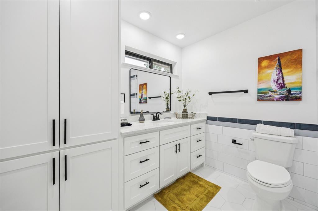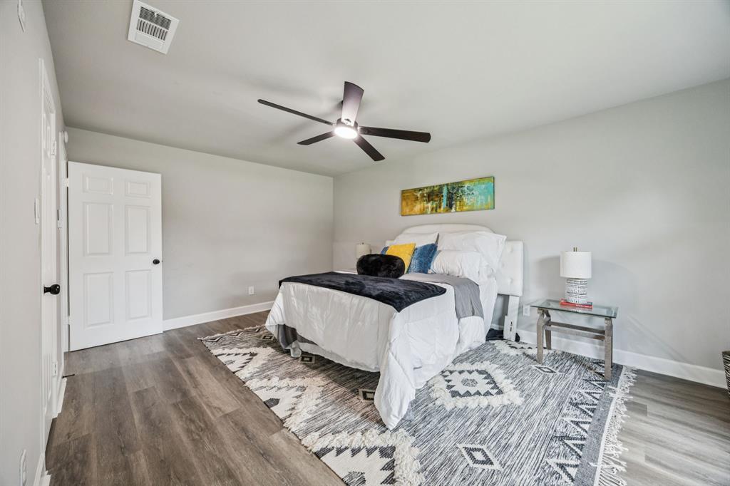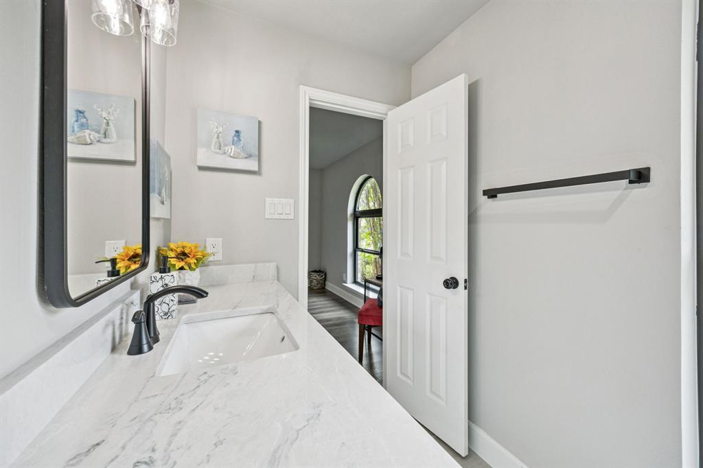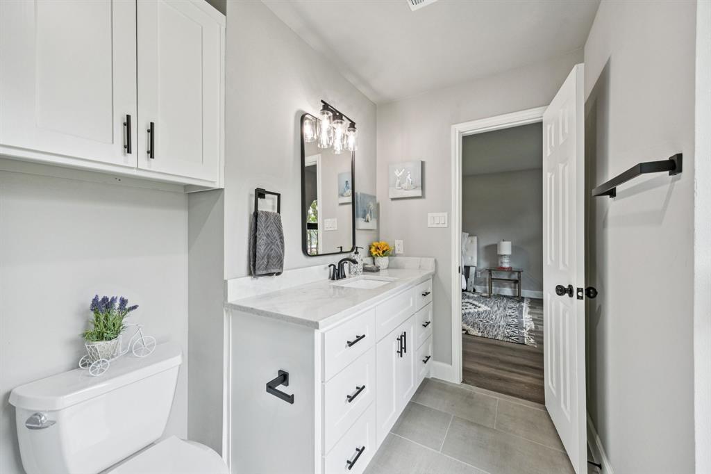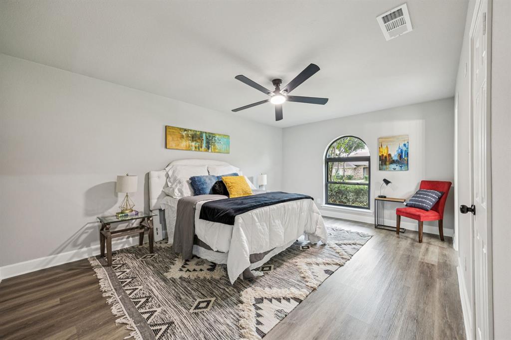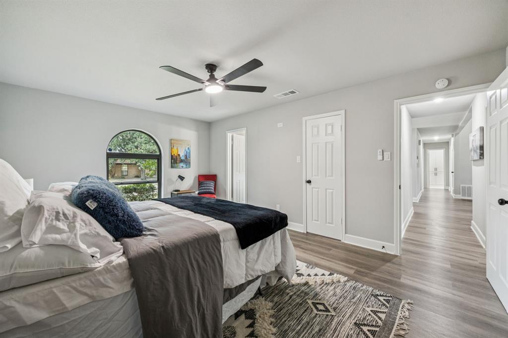 The thoughtful split-bedroom floor plan ensures privacy, with the large primary suite tucked away for peace and quiet. The custom walk-in closet offers generous storage, while the completely remodeled ensuite bathroom features a luxurious walk-in shower, quartz countertops, and modern finishes. Two additional oversized bedrooms share a beautifully updated bath with a split bedroom concept allowing for true privacy for all occupants.