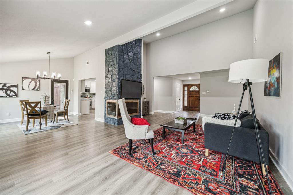 Inside, soaring ceilings create an open and airy feel, while the spacious living room centers around a cozy stone, gas logs fireplace with a gas starter—perfect for both quiet evenings and entertaining guests. The newly redesigned kitchen offers sleek quartz countertops, new cabinetry, and brand-new stainless steel gas appliances. Whether you enjoy cooking, hosting, or simply gathering with friends, this space is designed to impress.