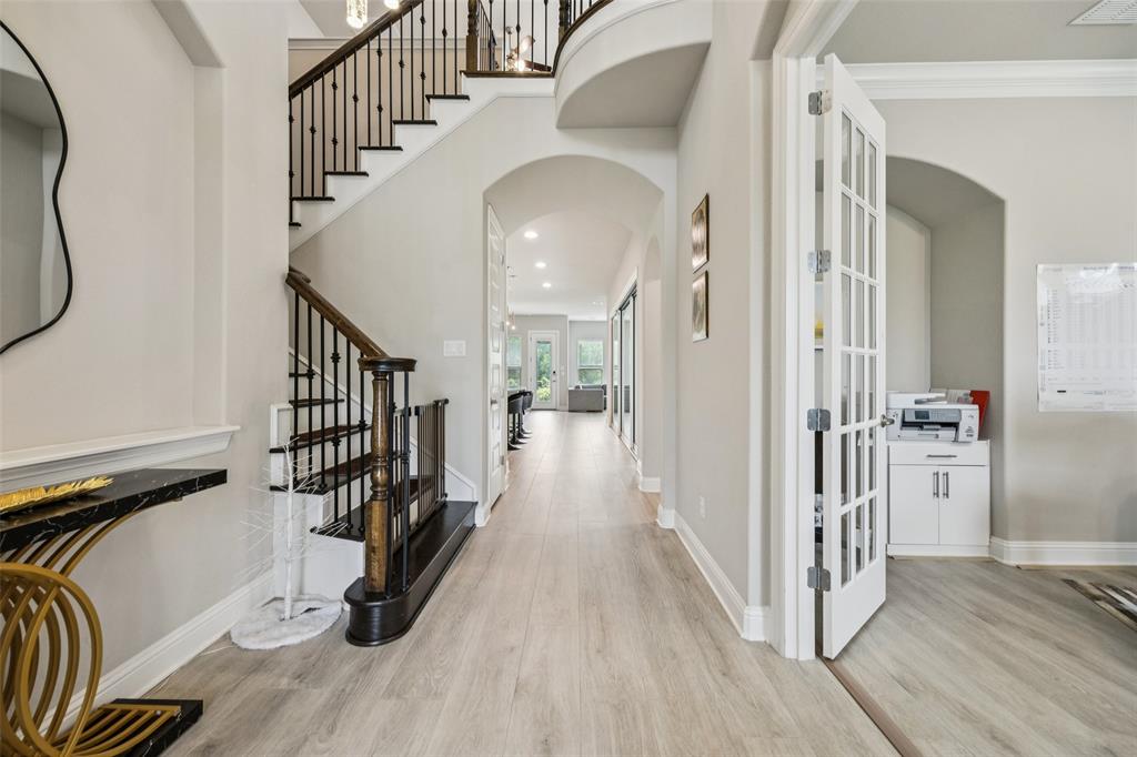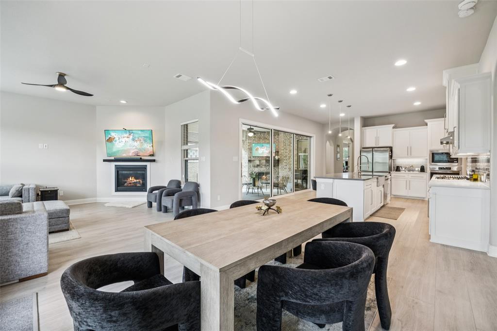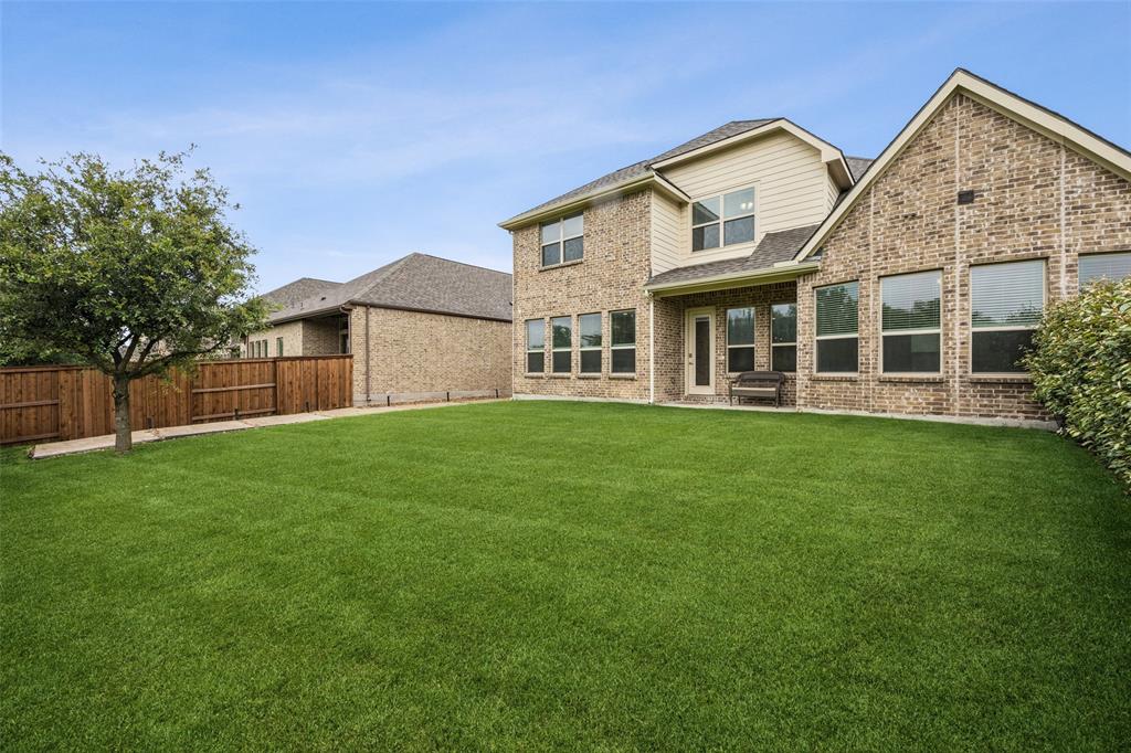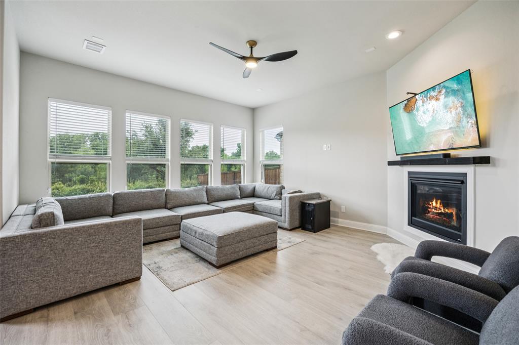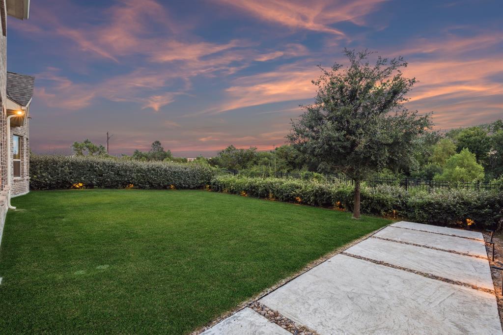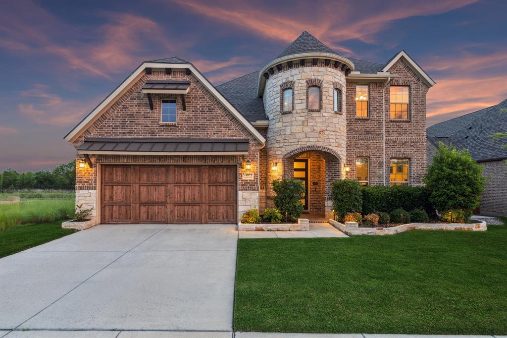 Welcome to Windsong Ranch! Prime Prosper Location — This breathtaking 4-bed, 3.5-bath home sits on a premium corner lot with only one neighboring home and peaceful treetop views. The backyard backs to a greenbelt and features a cozy outdoor fireplace plus a side yard—ideal for pets, or weekend barbecues. A park is right across the street for quiet morning reflection, playdates, and social time. The heart of the home is the gourmet kitchen, which opens to the living area and slides wide through a Texas-sized glass door to a covered outdoor living space—perfect for casual meals and year-round entertaining. The main-floor primary suite is a convenient private retreat with a spa-inspired en-suite, roomy walk-in closet, and direct laundry access. A dedicated home office with built-ins and French doors makes working from home easy, while the upstairs loft provides flexible space for movies, games, or homework. Additional upgrades and features include smart-home automation, an ADT security system with three live-monitoring cameras, optional water softener and under-sink reverse-osmosis system, professional landscaping with dramatic exterior lighting, a new roof, and attic storage & much more. Don't miss out! . Price to sell!