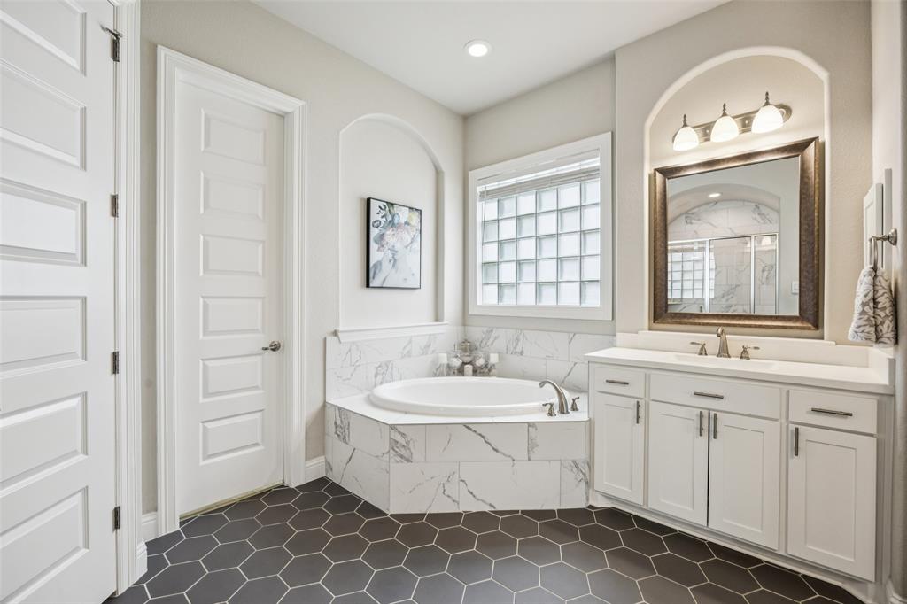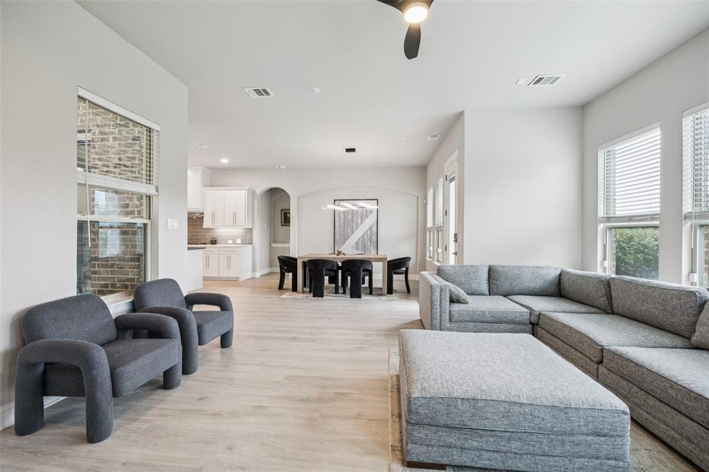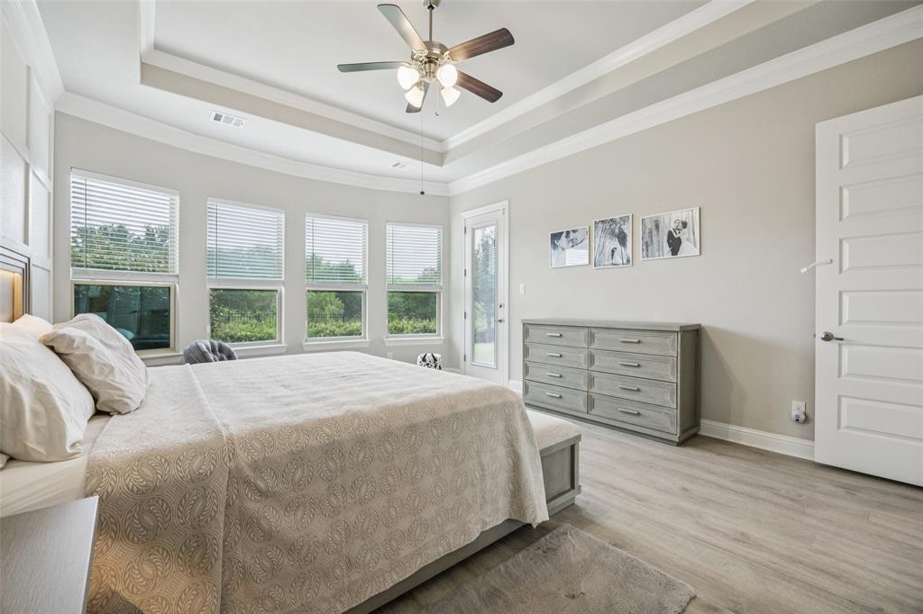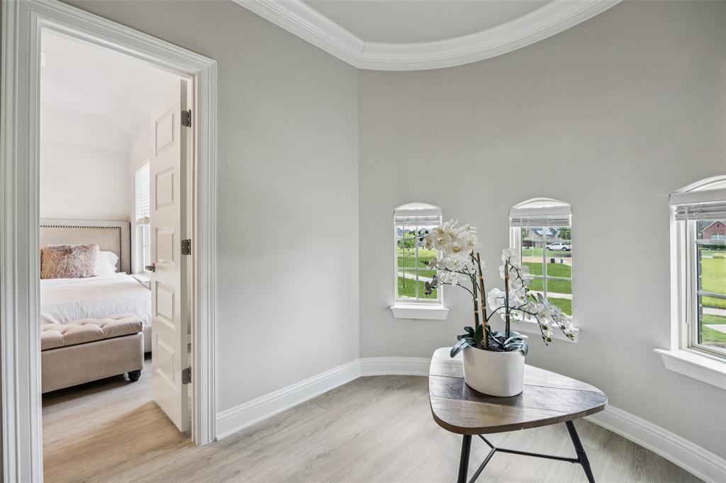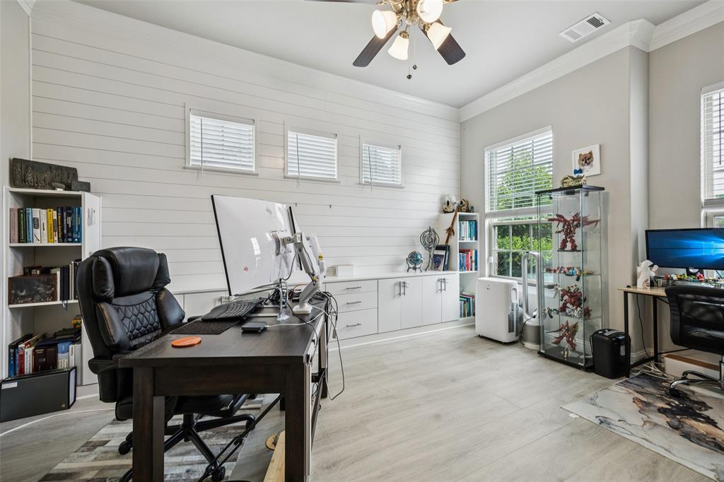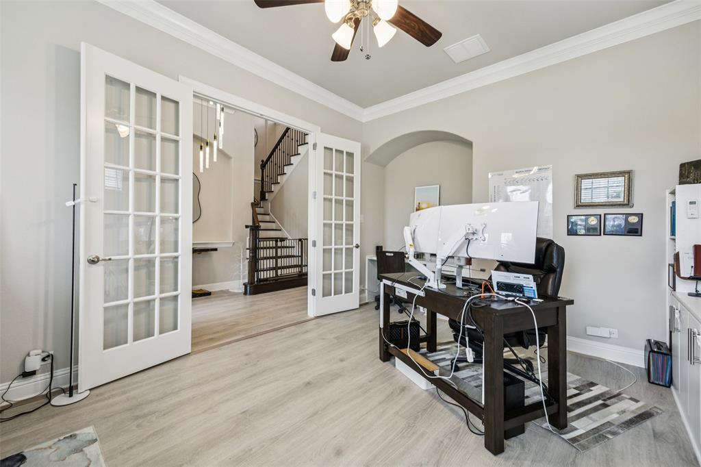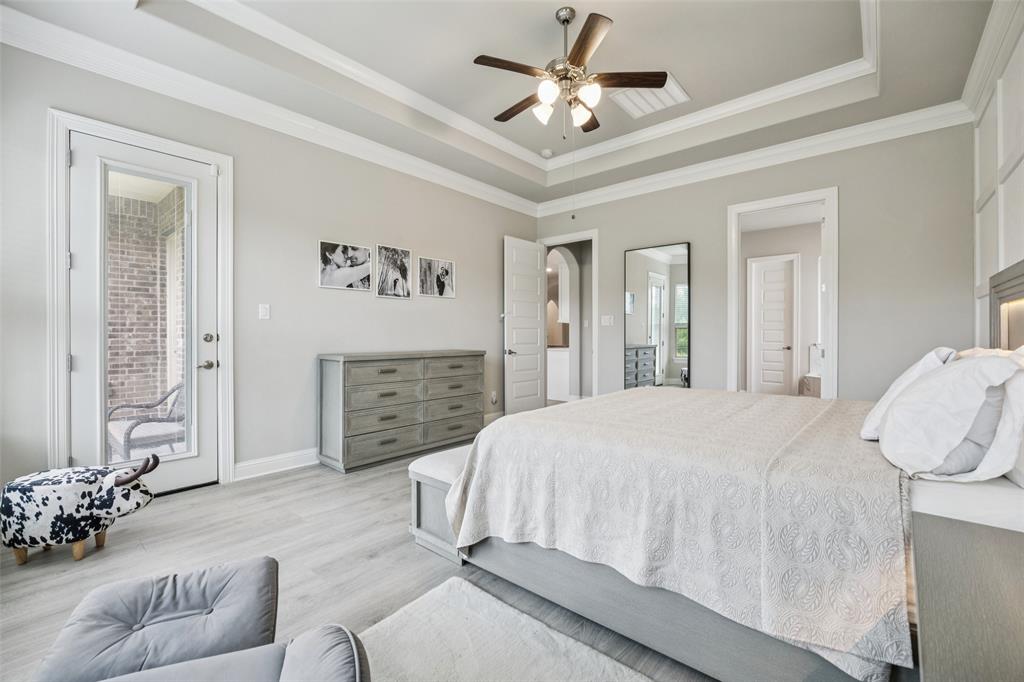 Welcome to Windsong Ranch! Prime Prosper Location — This breathtaking 4-bed, 3.5-bath home sits on a premium corner lot with only one neighboring home and peaceful treetop views. The backyard backs to a greenbelt and features a cozy outdoor fireplace plus a side yard—ideal for pets, or weekend barbecues. A park is right across the street for quiet morning reflection, playdates, and social time. The heart of the home is the gourmet kitchen, which opens to the living area and slides wide through a Texas-sized glass door to a covered outdoor living space—perfect for casual meals and year-round entertaining. The main-floor primary suite is a convenient private retreat with a spa-inspired en-suite, roomy walk-in closet, and direct laundry access. A dedicated home office with built-ins and French doors makes working from home easy, while the upstairs loft provides flexible space for movies, games, or homework. Additional upgrades and features include smart-home automation, an ADT security system with three live-monitoring cameras, optional water softener and under-sink reverse-osmosis system, professional landscaping with dramatic exterior lighting, a new roof, and attic storage & much more. Don't miss out! . Price to sell!