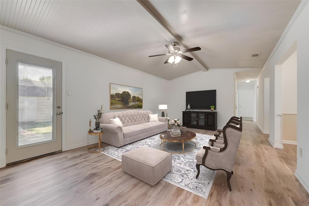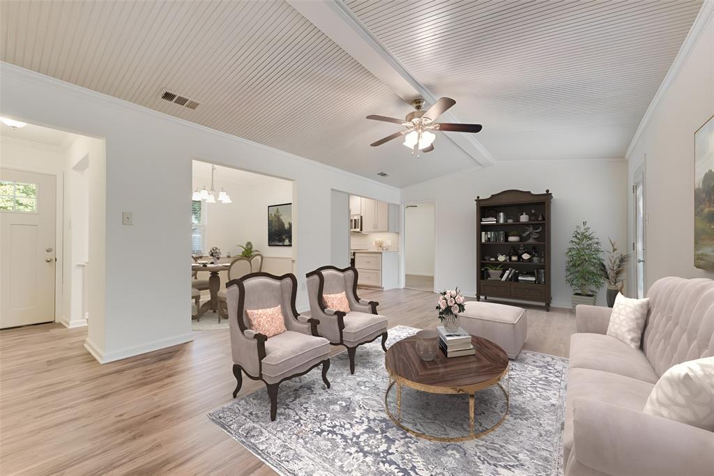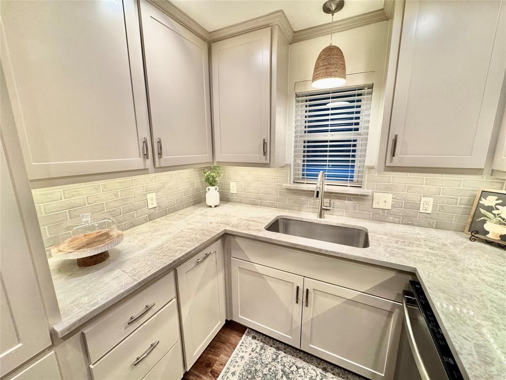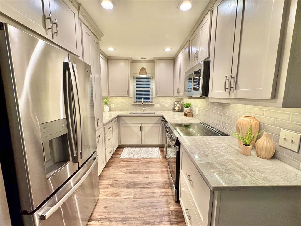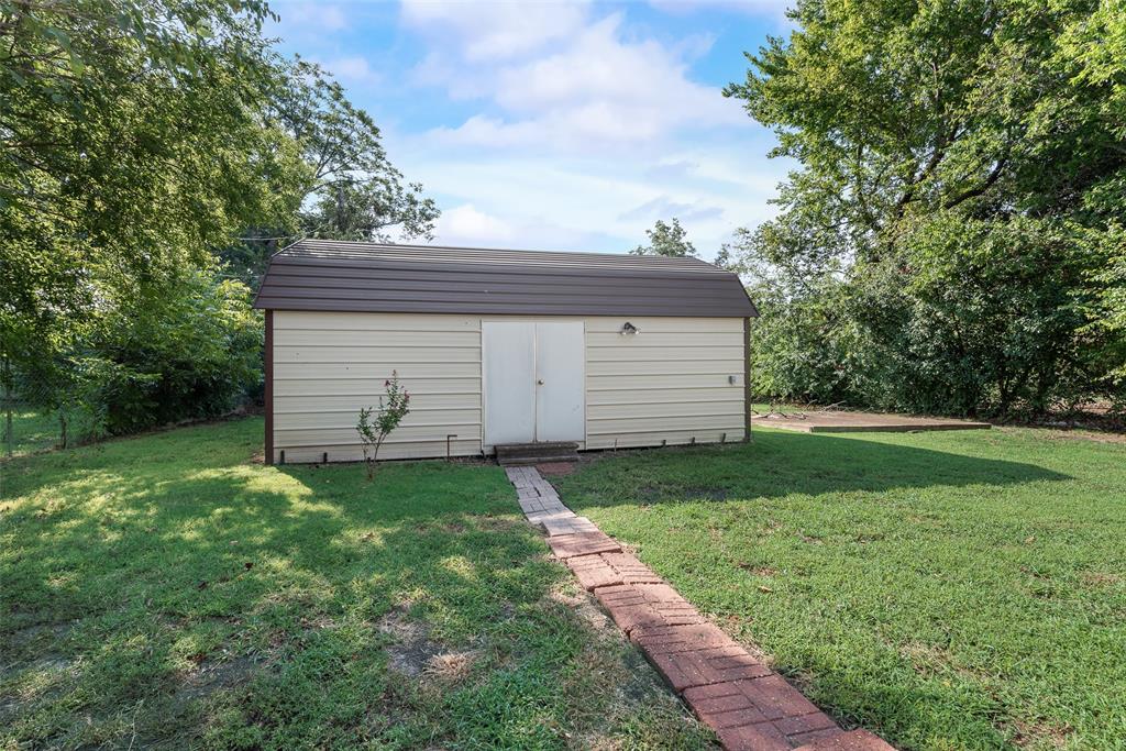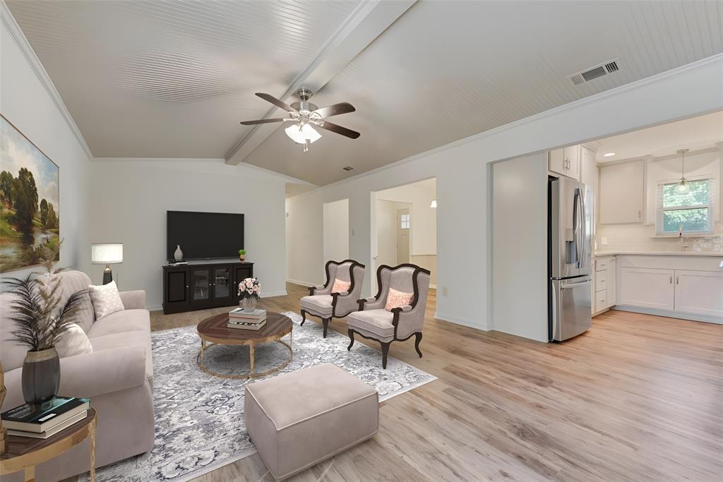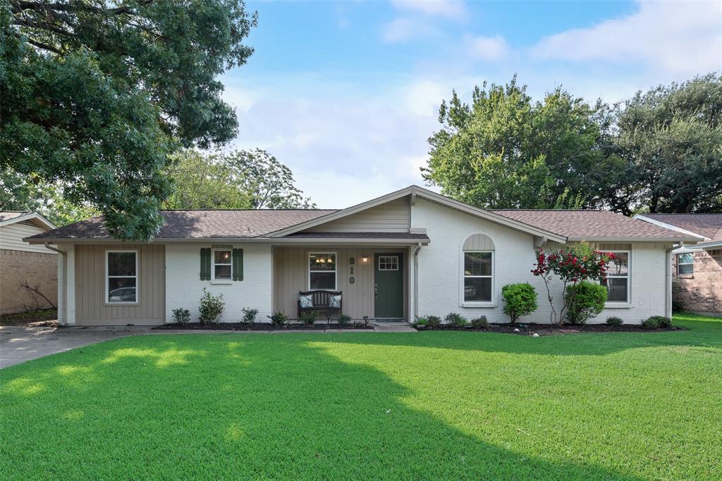 BEAUTIFULLY UPDATED home nestled in the well-established Pinson Addition with a nice front porch that welcomes you home! Open floor plan with spacious living room with cathedral ceiling! 2nd living could be office or game room and has barn door! The primary bedroom has a half bath! The secondary bedrooms share a hall bath that has a built-in linen cabinet. The kitchen is the heart of the home and this one is a show stopper! Custom cabinetry with Taj Mahal quartzite and tiled backsplash, upper cabinets to the ceiling, built-in pantry, trash drawer pull out and large drawers for pots and pans! The appliances were updated in July 2025 and include an electric range, microwave oven, dishwasher, disposal, and counter-depth French door refrigerator freezer! The utility room is spacious and features additional storage, a folding area, cabinetry, and hanging space. Both bathroom vanities also have Taj Mahal quartzite vanity tops with updated sinks! The home has luxury vinyl plank flooring and carpet (both updated 2025), fresh interior paint, and updated sink faucets! There is a workshop, with electricity, in the back yard, that measures approximately 24x14, which is great for hobbies or extra storage! There is patio space plus an additional concrete slab, in the back yard, which could be used for a firepit or BBQ area. In 2025, the sewer lines under the home were replaced. Attends Criswell, Jones, Warren, and Forney High School! Easy access to shopping, dining, and Highway 80! The complete list of upgrades is attached in the transaction desk.