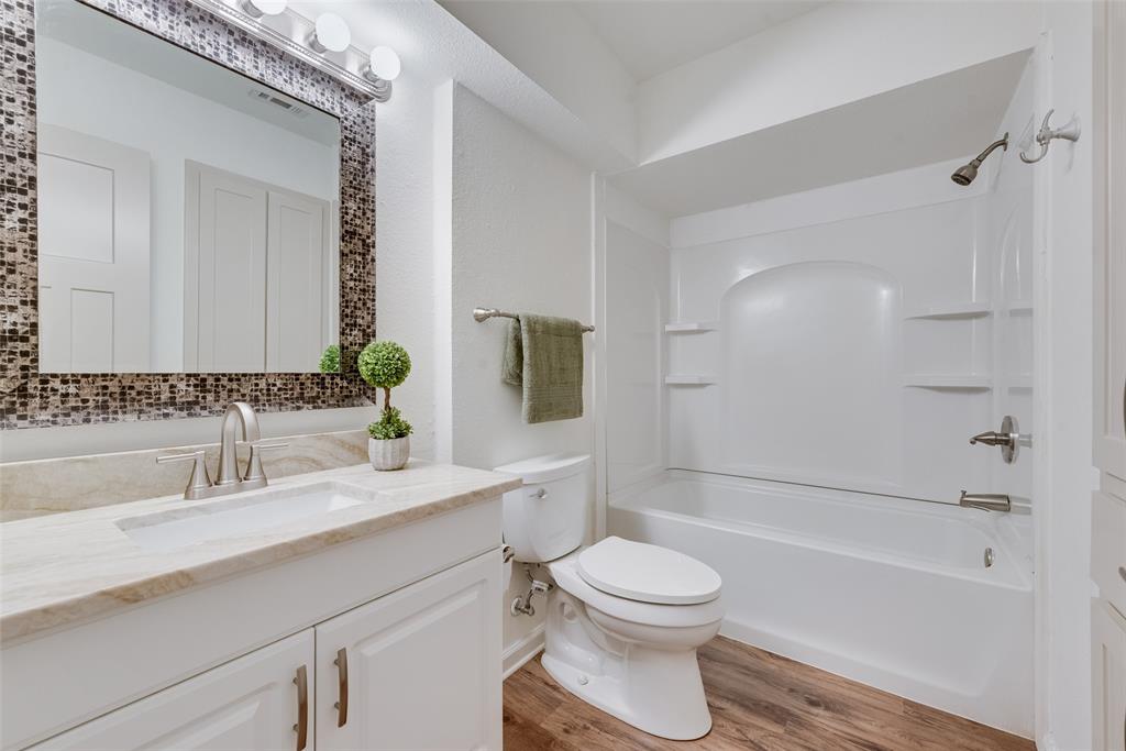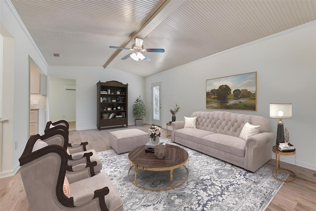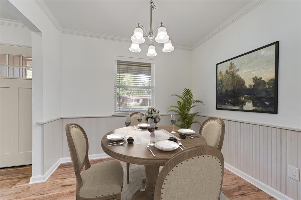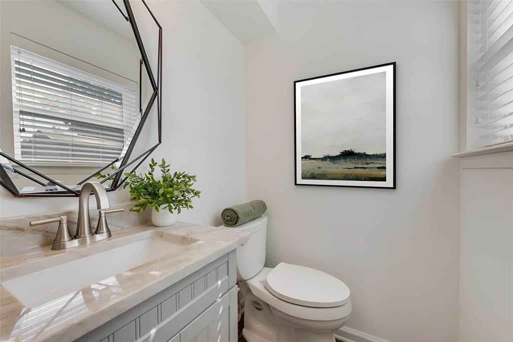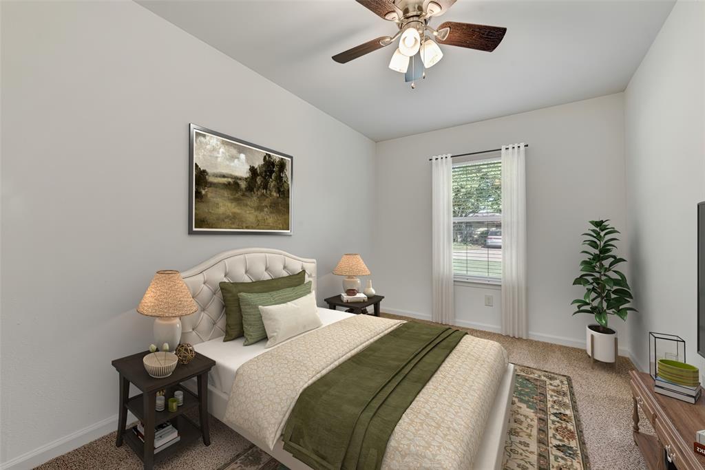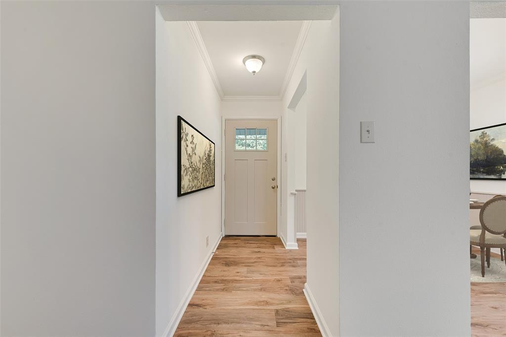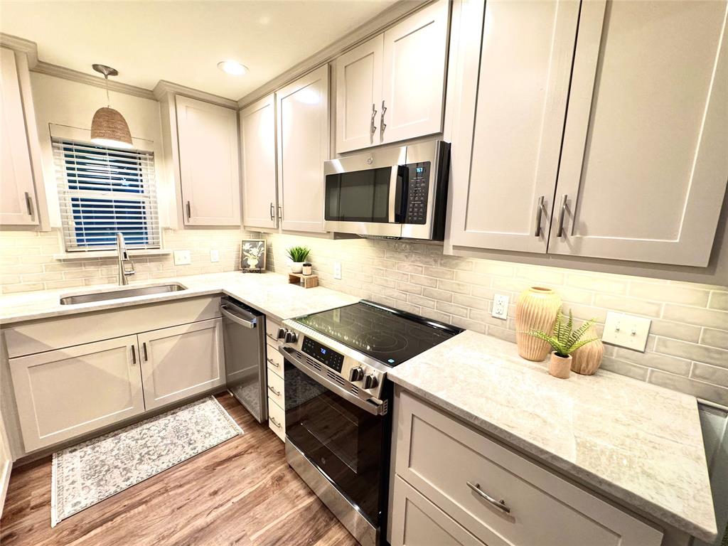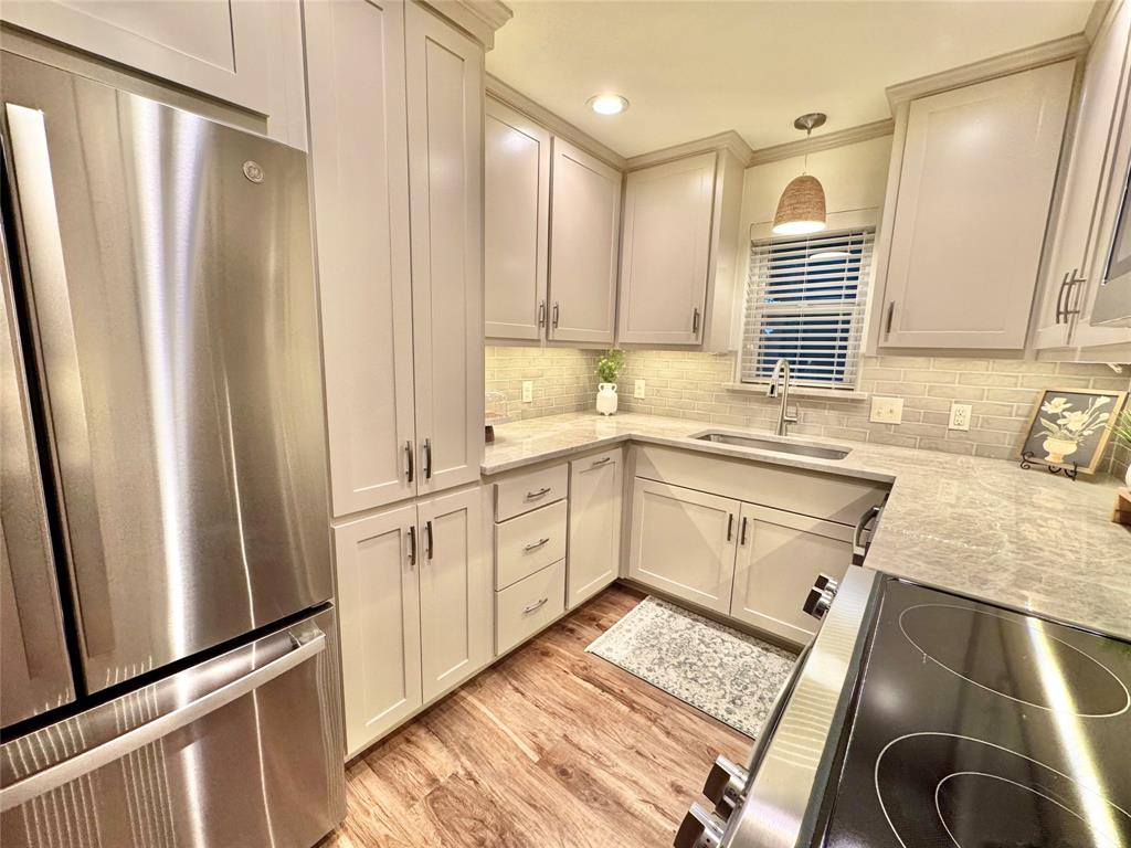 BEAUTIFULLY UPDATED home nestled in the well-established Pinson Addition with a nice front porch that welcomes you home! Open floor plan with spacious living room with cathedral ceiling! 2nd living could be office or game room and has barn door! The primary bedroom has a half bath! The secondary bedrooms share a hall bath that has a built-in linen cabinet. The kitchen is the heart of the home and this one is a show stopper! Custom cabinetry with Taj Mahal quartzite and tiled backsplash, upper cabinets to the ceiling, built-in pantry, trash drawer pull out and large drawers for pots and pans! The appliances were updated in July 2025 and include an electric range, microwave oven, dishwasher, disposal, and counter-depth French door refrigerator freezer! The utility room is spacious and features additional storage, a folding area, cabinetry, and hanging space. Both bathroom vanities also have Taj Mahal quartzite vanity tops with updated sinks! The home has luxury vinyl plank flooring and carpet (both updated 2025), fresh interior paint, and updated sink faucets! There is a workshop, with electricity, in the back yard, that measures approximately 24x14, which is great for hobbies or extra storage! There is patio space plus an additional concrete slab, in the back yard, which could be used for a firepit or BBQ area. In 2025, the sewer lines under the home were replaced. Attends Criswell, Jones, Warren, and Forney High School! Easy access to shopping, dining, and Highway 80! The complete list of upgrades is attached in the transaction desk.