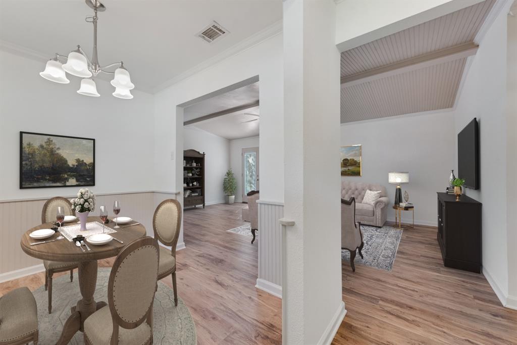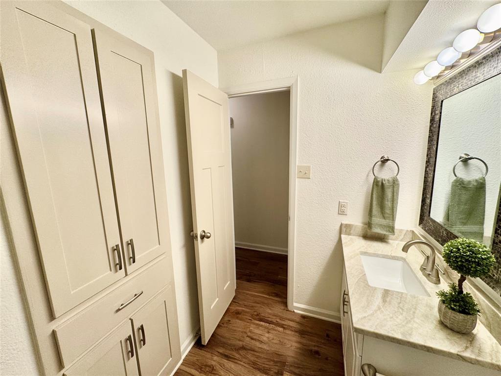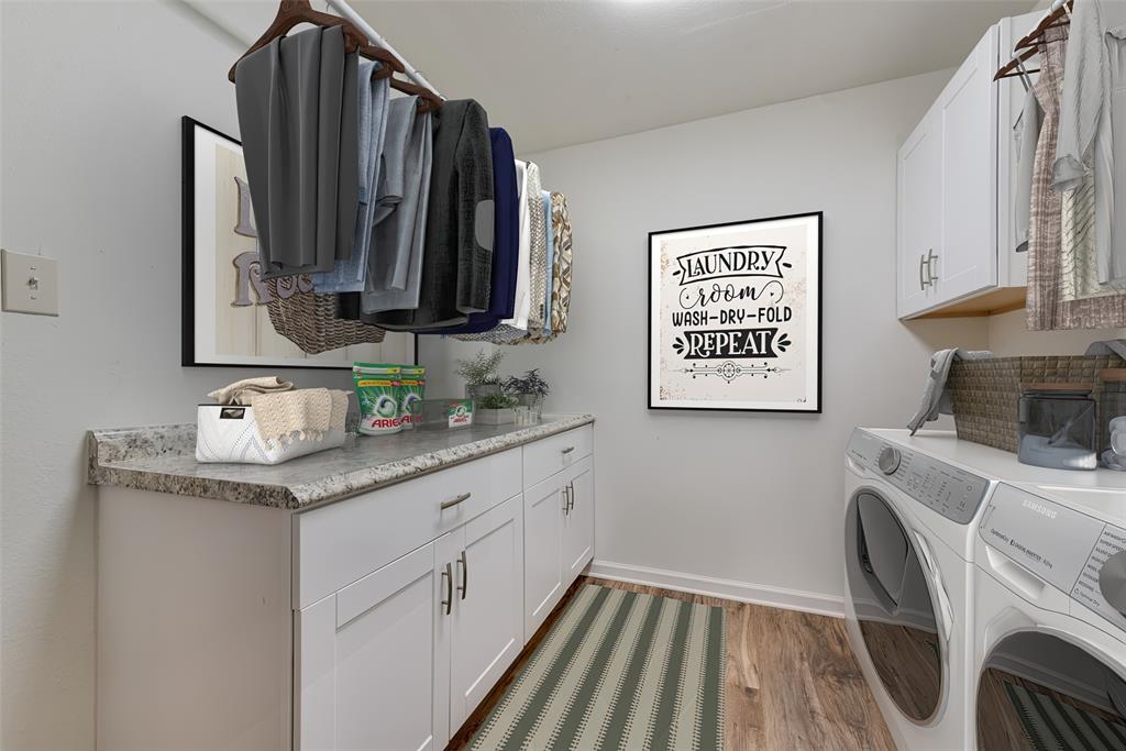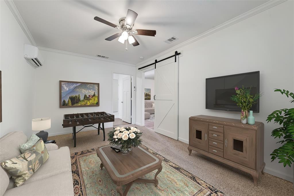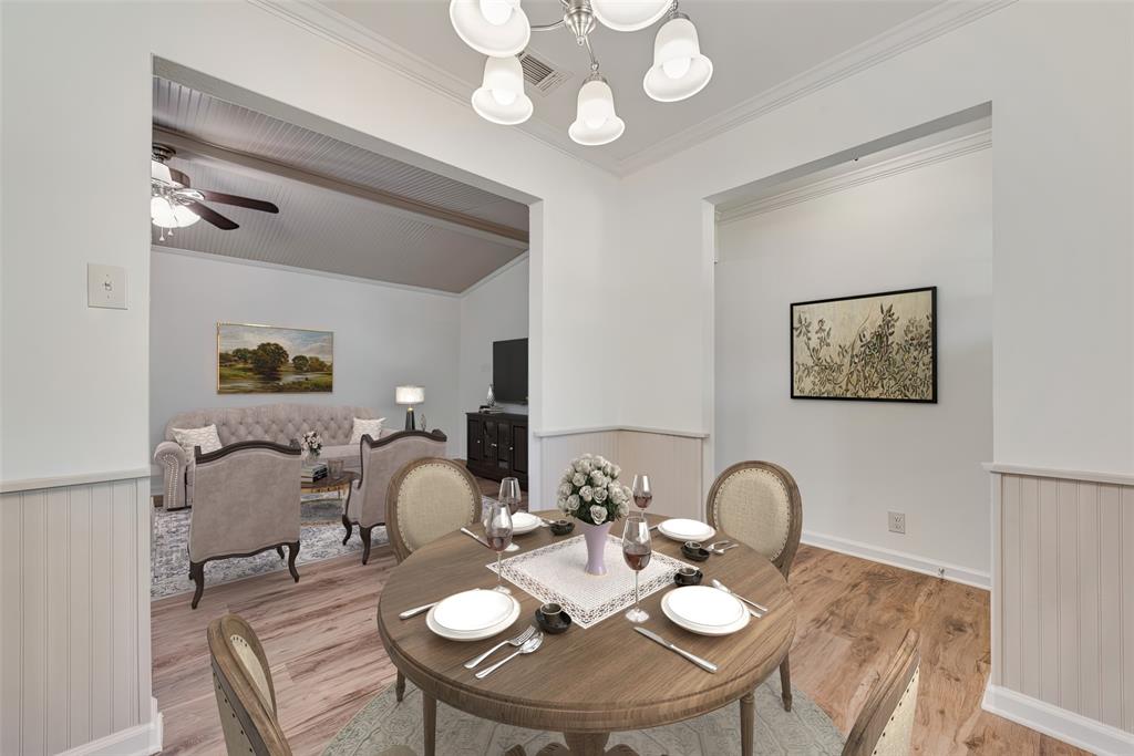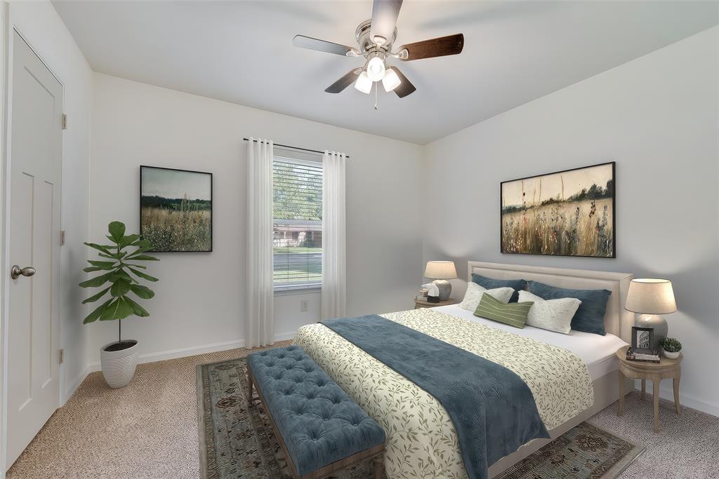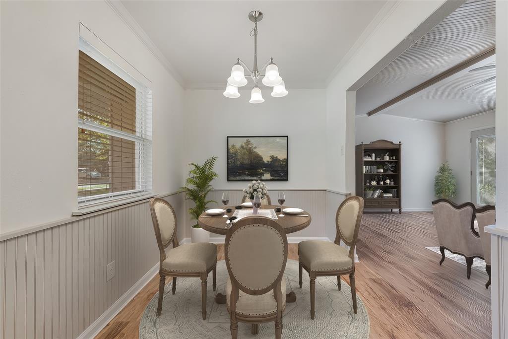 BEAUTIFULLY UPDATED home nestled in the well-established Pinson Addition with a nice front porch that welcomes you home! Open floor plan with spacious living room with cathedral ceiling! 2nd living could be office or game room and has barn door! The primary bedroom has a half bath! The secondary bedrooms share a hall bath that has a built-in linen cabinet. The kitchen is the heart of the home and this one is a show stopper! Custom cabinetry with Taj Mahal quartzite and tiled backsplash, upper cabinets to the ceiling, built-in pantry, trash drawer pull out and large drawers for pots and pans! The appliances were updated in July 2025 and include an electric range, microwave oven, dishwasher, disposal, and counter-depth French door refrigerator freezer! The utility room is spacious and features additional storage, a folding area, cabinetry, and hanging space. Both bathroom vanities also have Taj Mahal quartzite vanity tops with updated sinks! The home has luxury vinyl plank flooring and carpet (both updated 2025), fresh interior paint, and updated sink faucets! There is a workshop, with electricity, in the back yard, that measures approximately 24x14, which is great for hobbies or extra storage! There is patio space plus an additional concrete slab, in the back yard, which could be used for a firepit or BBQ area. In 2025, the sewer lines under the home were replaced. Attends Criswell, Jones, Warren, and Forney High School! Easy access to shopping, dining, and Highway 80! The complete list of upgrades is attached in the transaction desk.