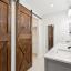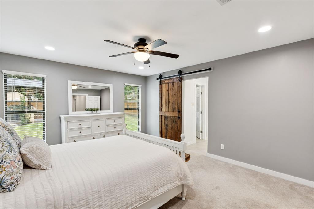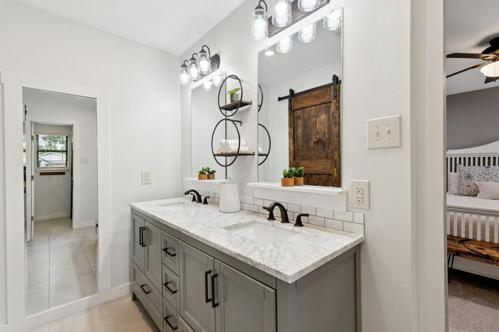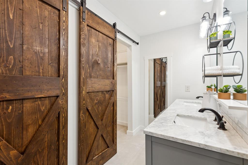 The primary suite is a private retreat with dual walk-in closets enhanced by custom barn doors, dual vanities with marble countertops, ceramic tile flooring, and an ensuite bath complete with a built-in ceiling speaker. The spacious secondary bedrooms each offer large walk-in closets.
