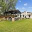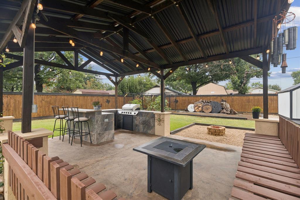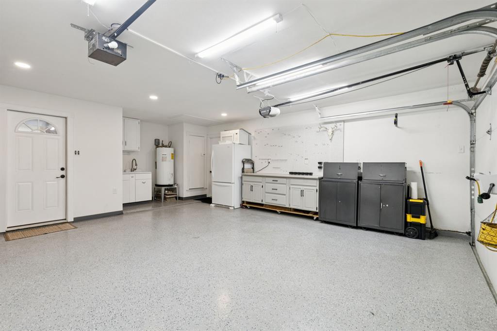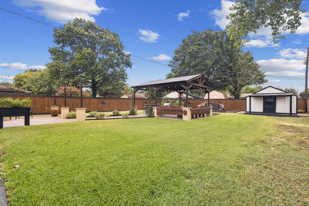 The backyard is designed for both relaxation and entertaining, featuring a large patio space, a beautiful gazebo with an outdoor living and kitchen area, a dedicated garden patch, and a well-equipped shed with lighting and electrical outlets. The garage is a craftsman’s dream, outfitted with a workshop setup, built-in cabinetry, pegboard organization, counterspace, a utility sink, and stunning epoxy flooring.