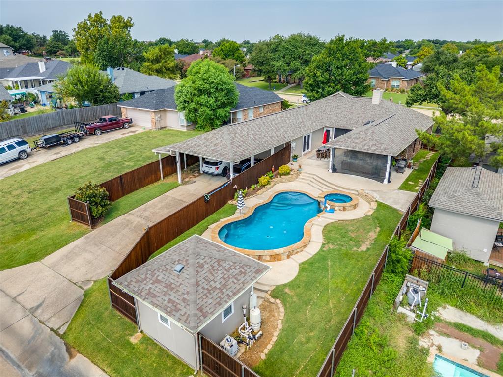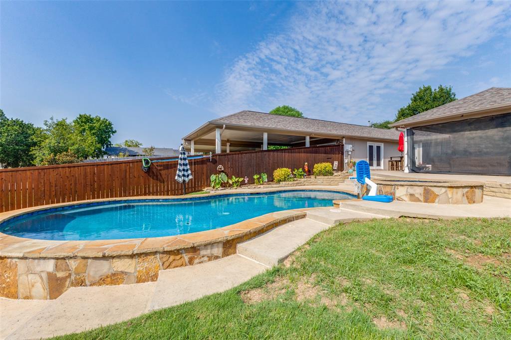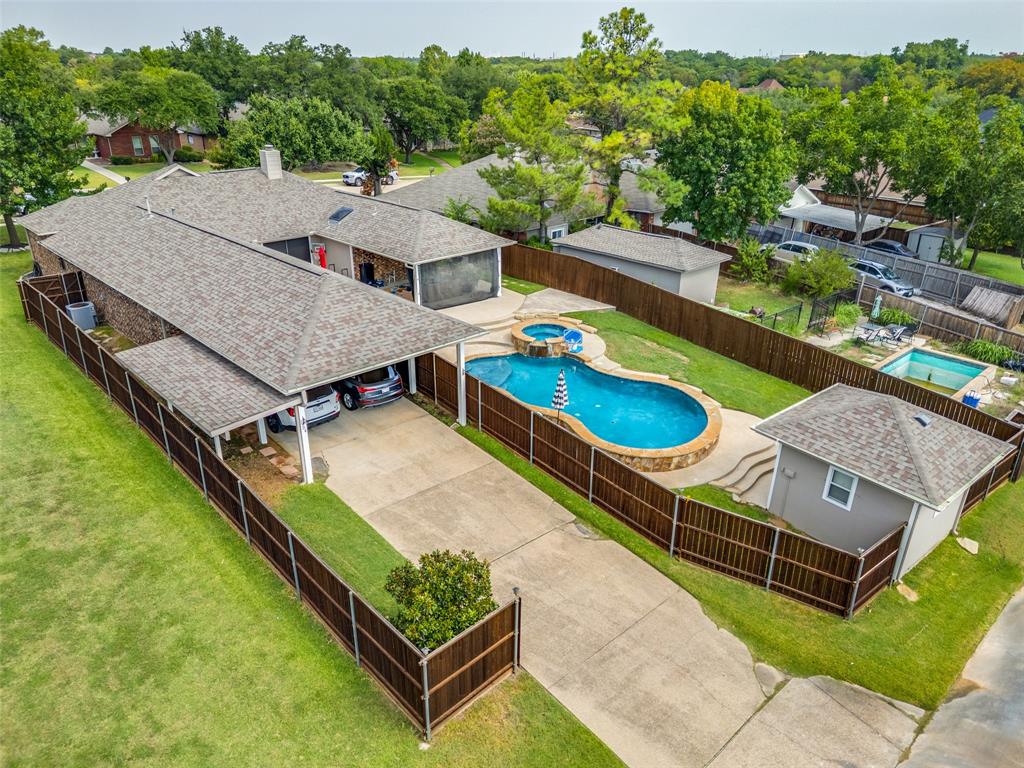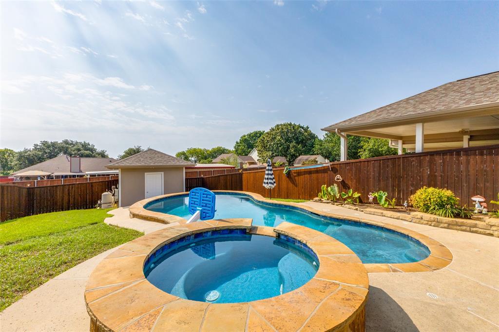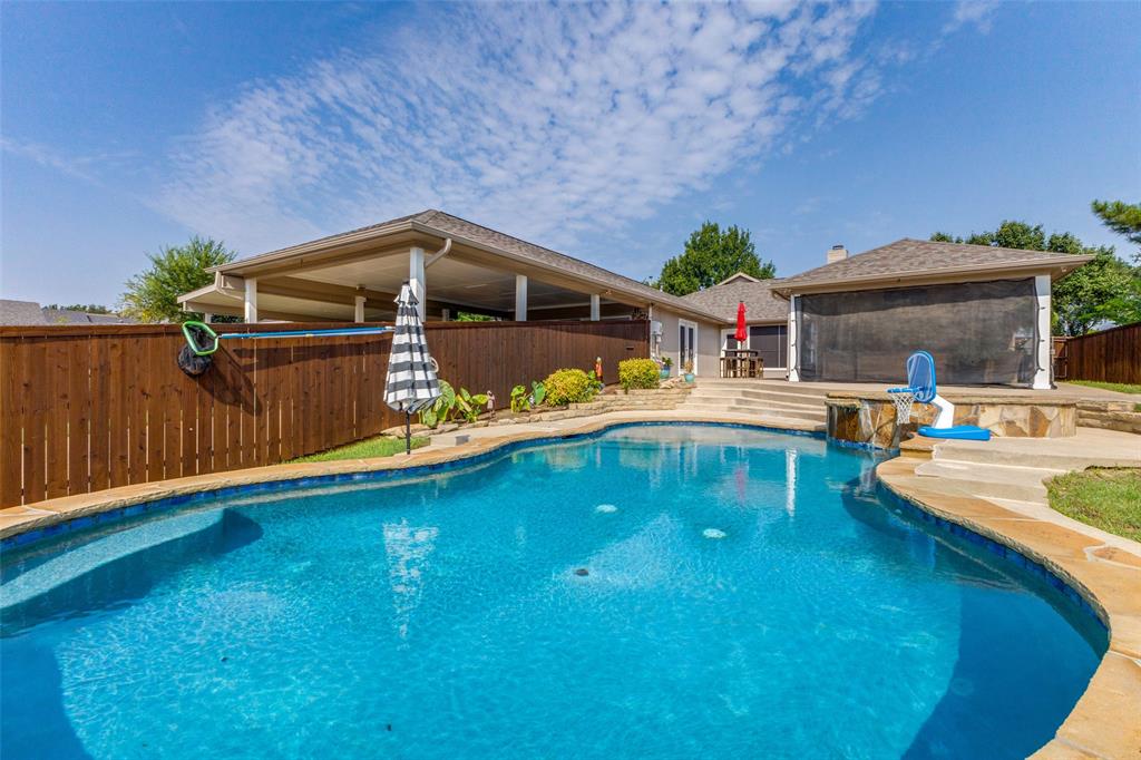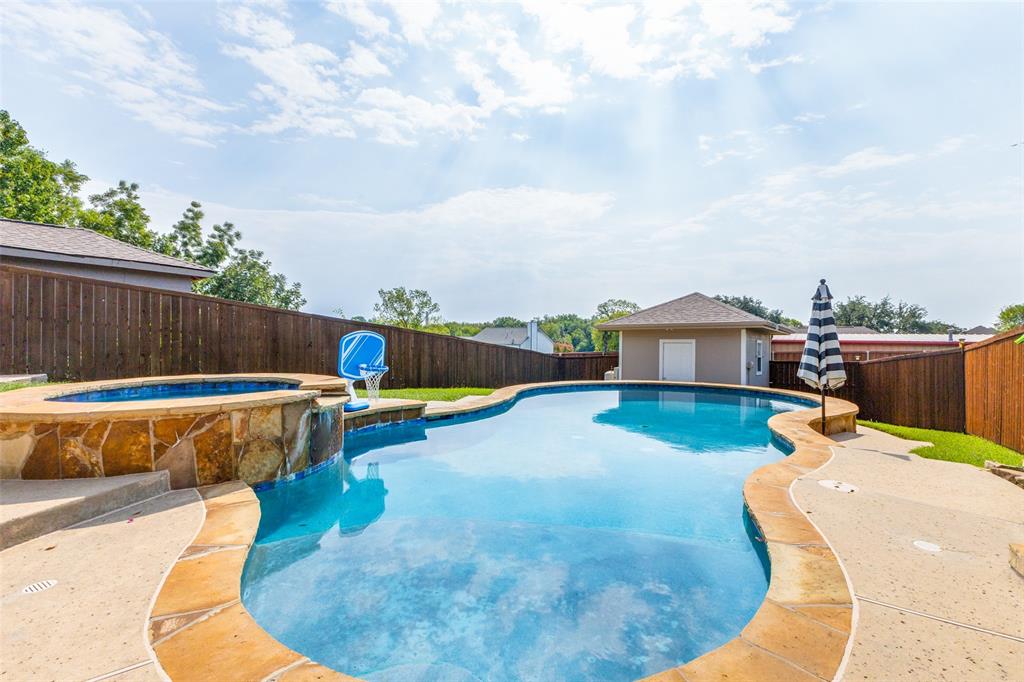 Beautiful, 1 story, move in ready home in Indian Trails of Mesquite. Marvel at the backyard oasis. On an expanded lot, enjoy your pool, spa, and covered outdoor living area. Your screened patio is perfect for this fall to watch football games while grilling. The pool or spa is the perfect place to unwind. Need extra space, there is a shed that conveys with the sale as well as extensive storage above the expanded carport. One can fit 4 cars under roof in the carport. You won't find another backyard like this in the area. Inside, stretch out across over 2,100 square feet. This light filled 3 bedroom, 2 bathroom set up has a primary bedroom with ensuite bath, separate tub and shower, as well as a walk in closet. Multiple living spaces include a large, finished garage that can be your family, exercise, or media room. The sun room is the perfect place to set up as an office. Use the formal dining room for those special meals or grab a quick bite in the breakfast room adjacent to the kitchen. Smith Elementary School is just a few short steps away. Copeland Park can be reached with a short walk. You are only minutes to major highways that can take you all across the DFW area. You get so much with this home, it is a great value. This house is a must see.