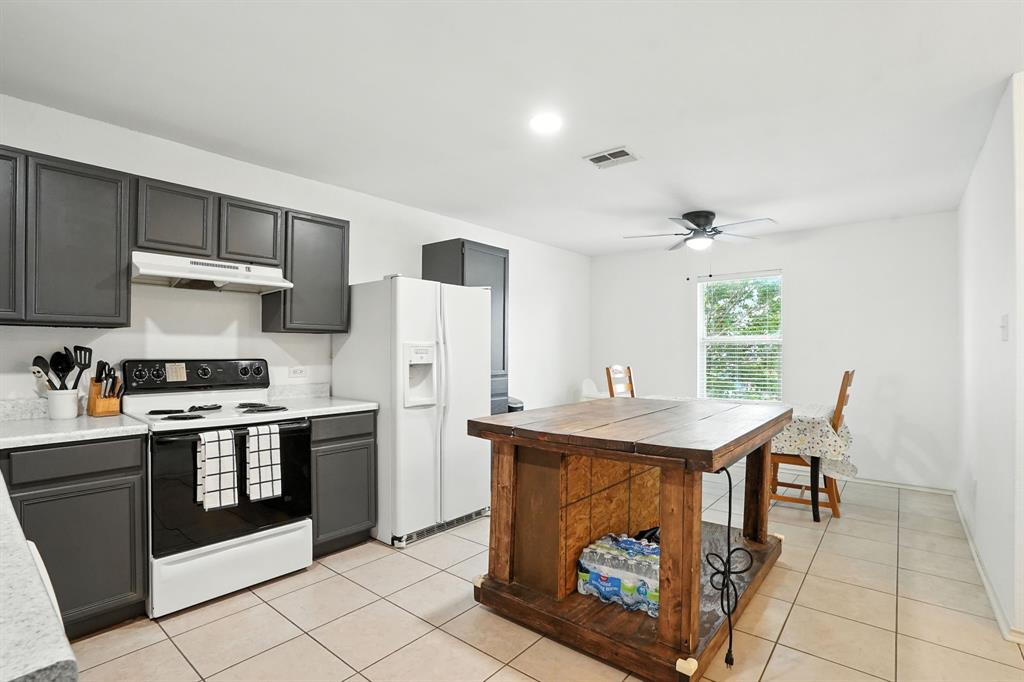 This 4-bedroom, 2-bath home offers a spacious and functional layout perfect for everyday living. The open living and dining areas flow into the kitchen, which features epoxy-coated countertops, dark-painted cabinets for a modern touch, and a large standalone island that adds extra prep space and casual seating options. A bright dining area sits just off the kitchen, ideal for family meals or entertaining.