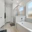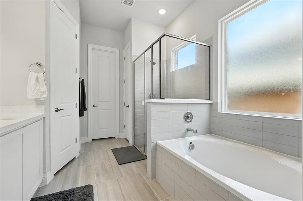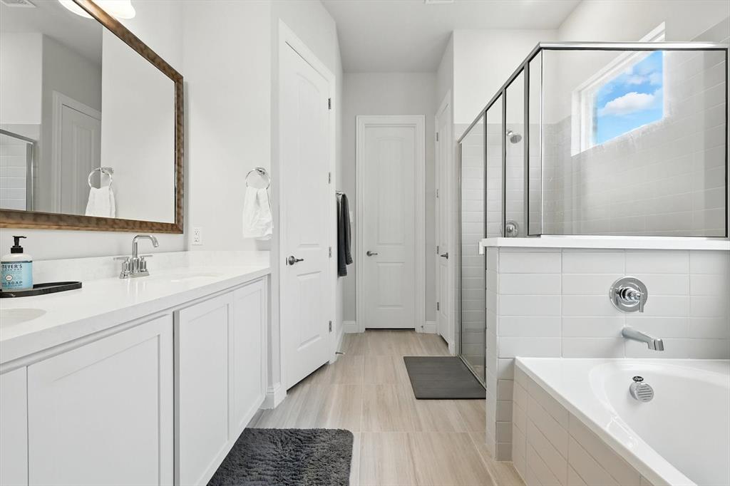 The spacious primary suite offers a peaceful retreat, complete with a luxurious ensuite bath featuring dual vanities, a large soaking tub, a separate shower, and a generous walk-in closet. Two additional bedrooms are thoughtfully separated from the primary suite, sharing a full bath—ideal for family or guests.