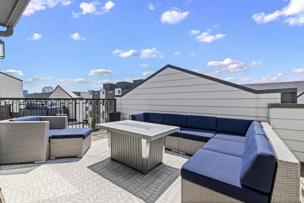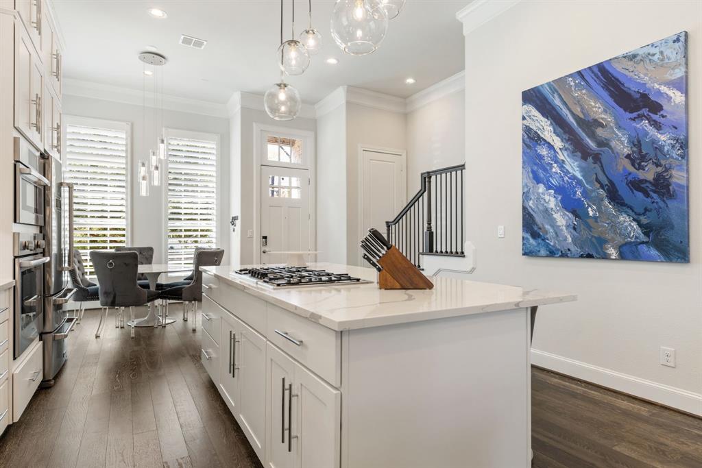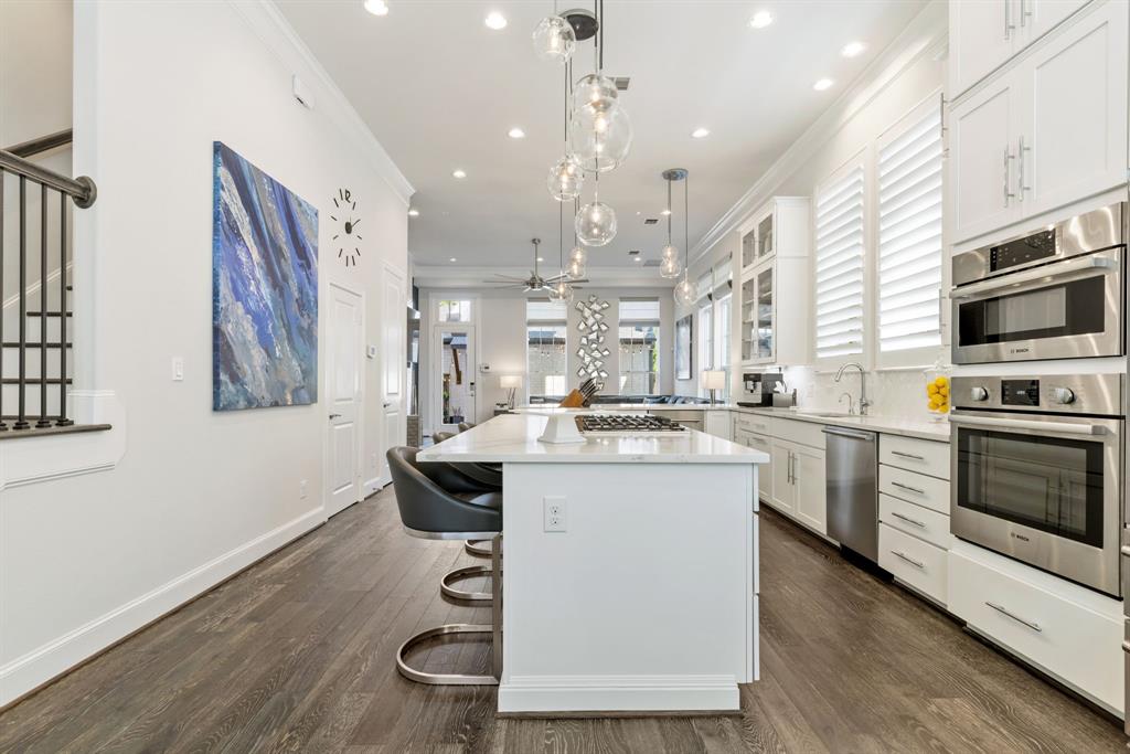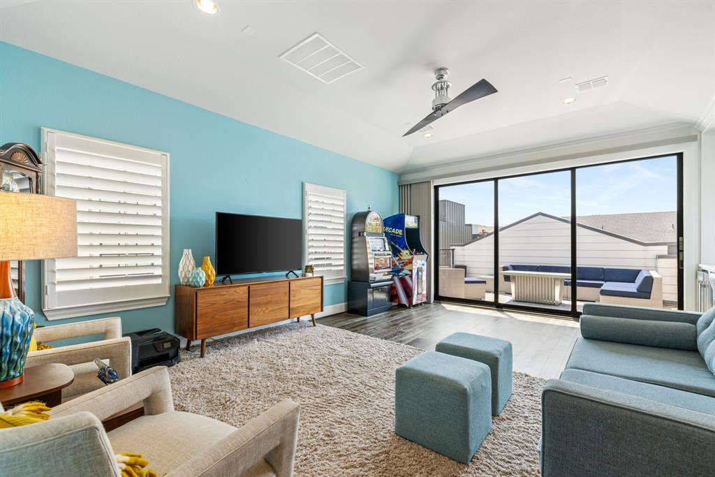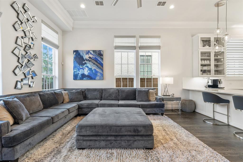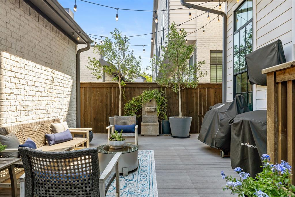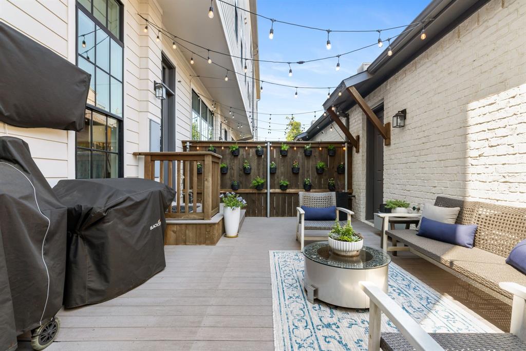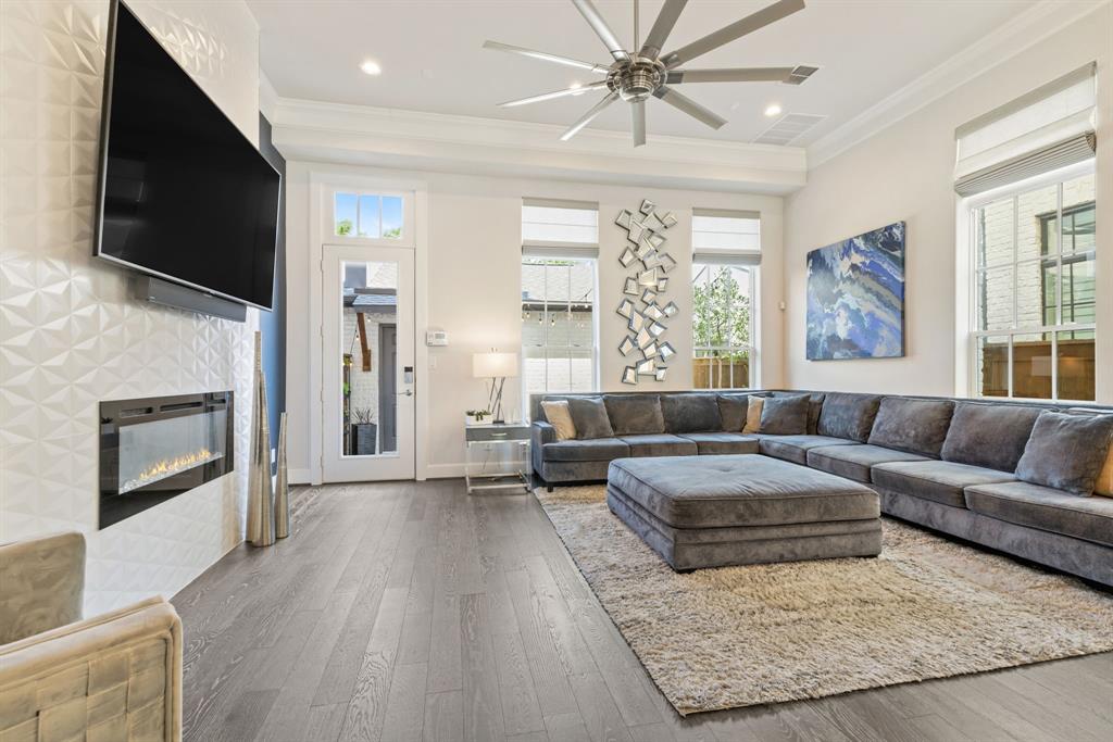 Immaculate three-story end-unit townhome filled with natural light and designed for first-floor living. The open-concept main level boasts soaring 12-foot ceilings, a custom tile accent wall with electric fireplace in the living area, and a chef’s kitchen featuring stacked upper cabinetry, a Bosch appliance package, Thor undercabinet double drawer refrigerator, oversized island, and breakfast bar. Custom pendant lighting in the kitchen and dining areas add elegance and depth to the space. Step out the back door to a charming fenced backyard patio leading to the detached two-car garage. The second floor showcases a luxurious primary suite with spa-like bath and huge walk-in closet, along with a secondary bedroom with ensuite bath and a convenient laundry area. The third floor offers a third bedroom with private bath and a spacious game room with a built-in work space and stunning sliding glass doors by Western Window Systems that open to a private roof terrace. Designer paint and wallpaper accents, custom wood shutters and window coverings, and engineered hardwood floors run throughout this immaculately maintained home. With exceptional curb appeal and thoughtful upgrades, this townhome is truly move-in ready.