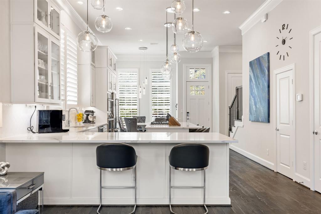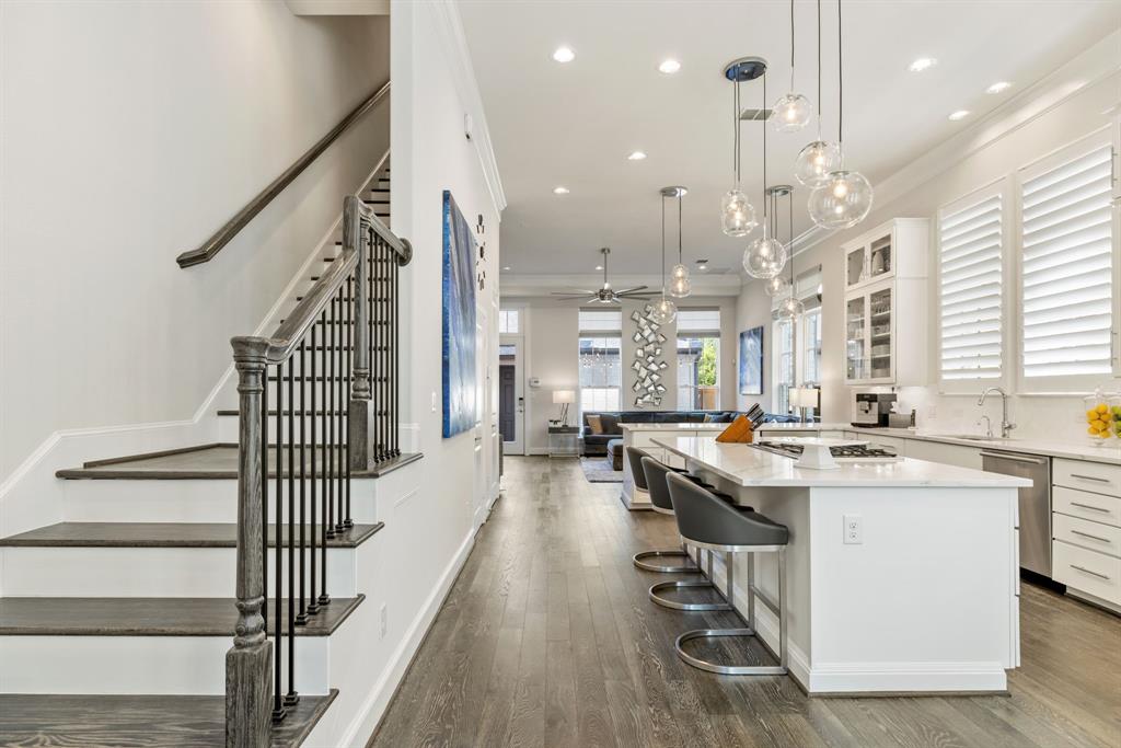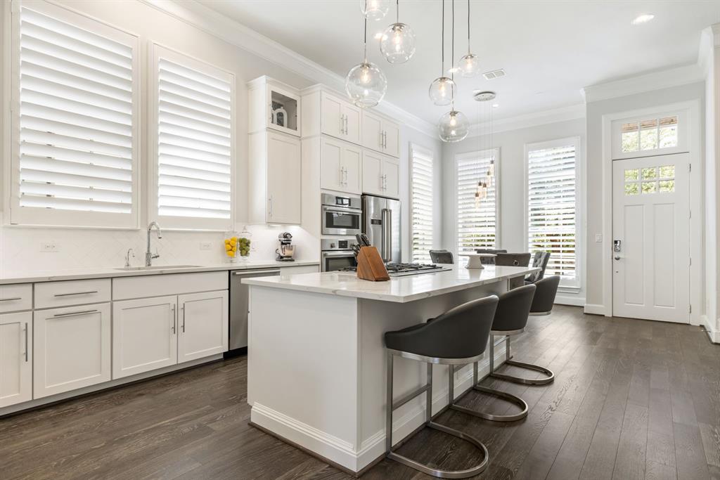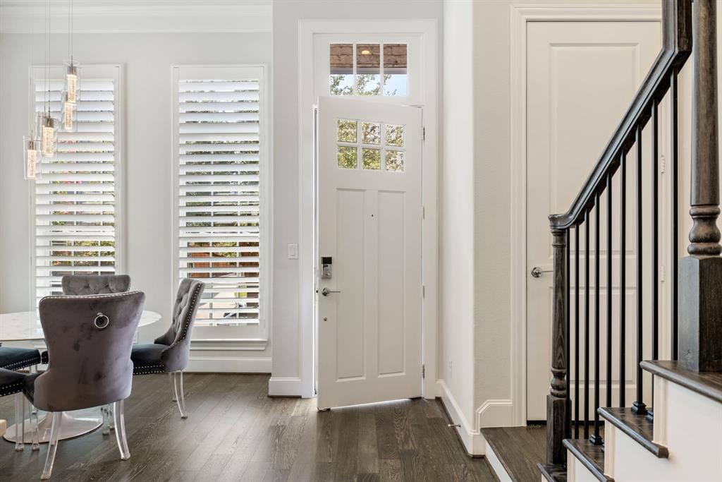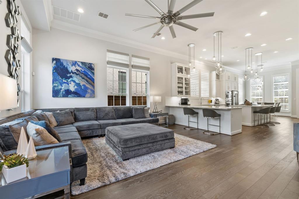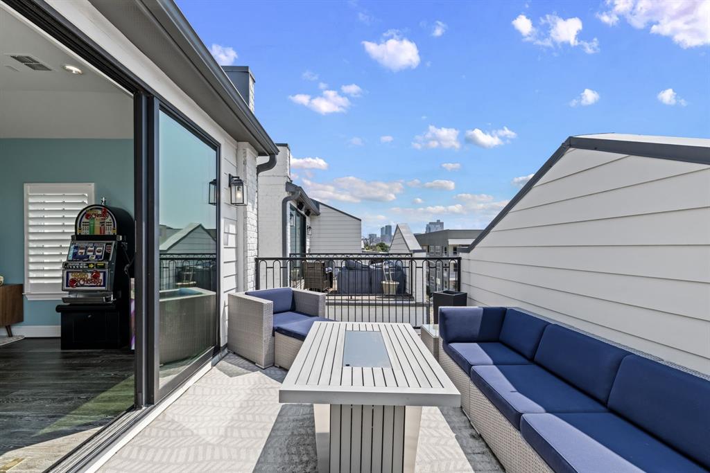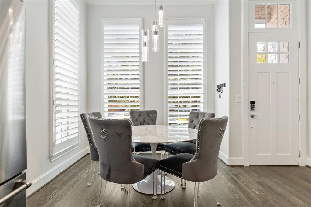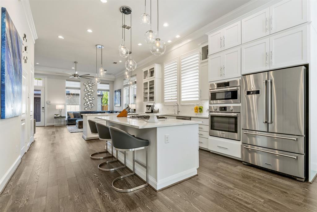 Immaculate three-story end-unit townhome filled with natural light and designed for first-floor living. The open-concept main level boasts soaring 12-foot ceilings, a custom tile accent wall with electric fireplace in the living area, and a chef’s kitchen featuring stacked upper cabinetry, a Bosch appliance package, Thor undercabinet double drawer refrigerator, oversized island, and breakfast bar. Custom pendant lighting in the kitchen and dining areas add elegance and depth to the space. Step out the back door to a charming fenced backyard patio leading to the detached two-car garage. The second floor showcases a luxurious primary suite with spa-like bath and huge walk-in closet, along with a secondary bedroom with ensuite bath and a convenient laundry area. The third floor offers a third bedroom with private bath and a spacious game room with a built-in work space and stunning sliding glass doors by Western Window Systems that open to a private roof terrace. Designer paint and wallpaper accents, custom wood shutters and window coverings, and engineered hardwood floors run throughout this immaculately maintained home. With exceptional curb appeal and thoughtful upgrades, this townhome is truly move-in ready.