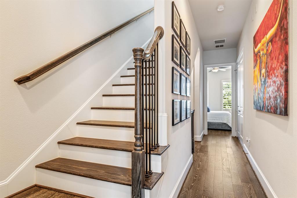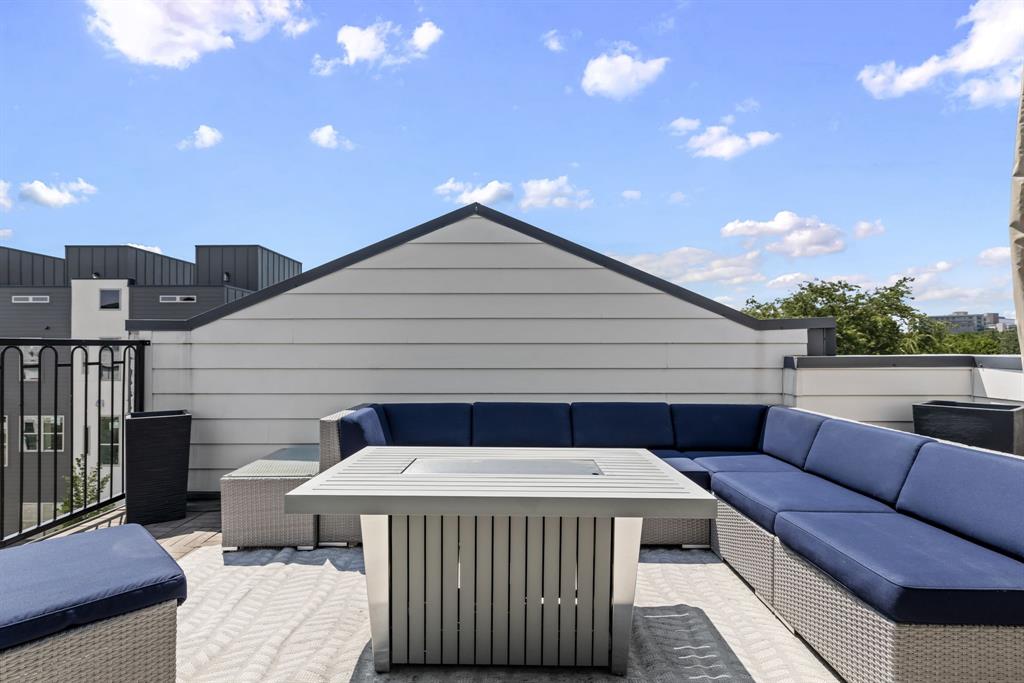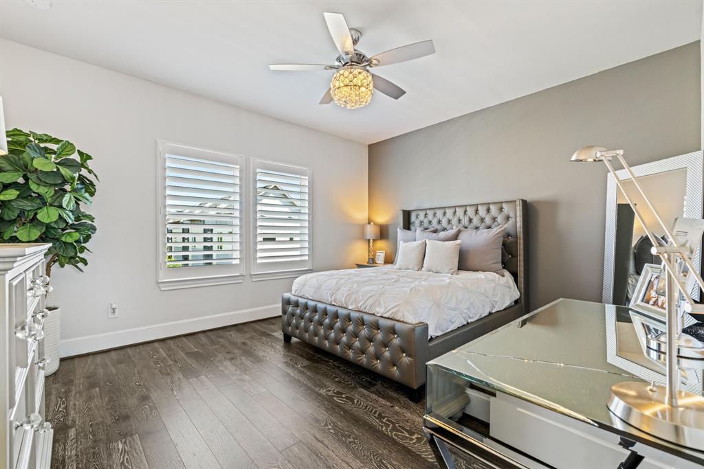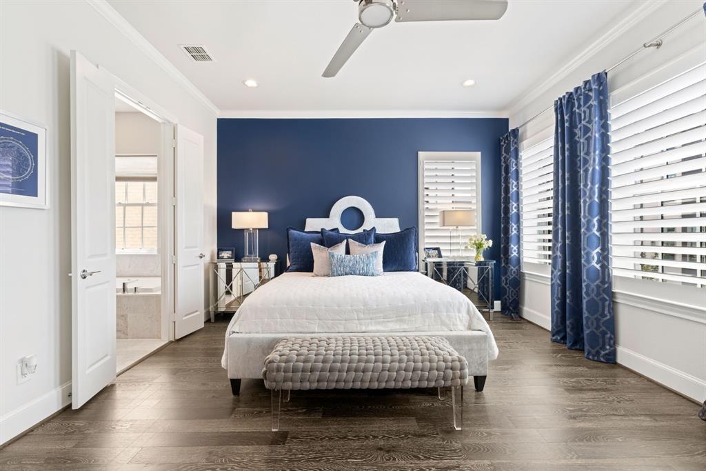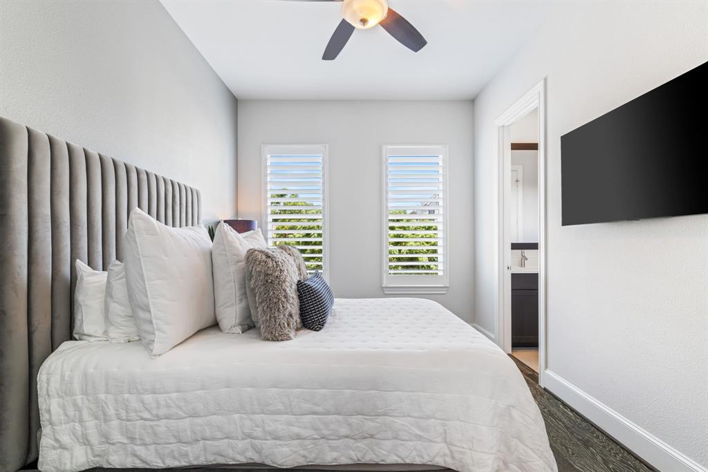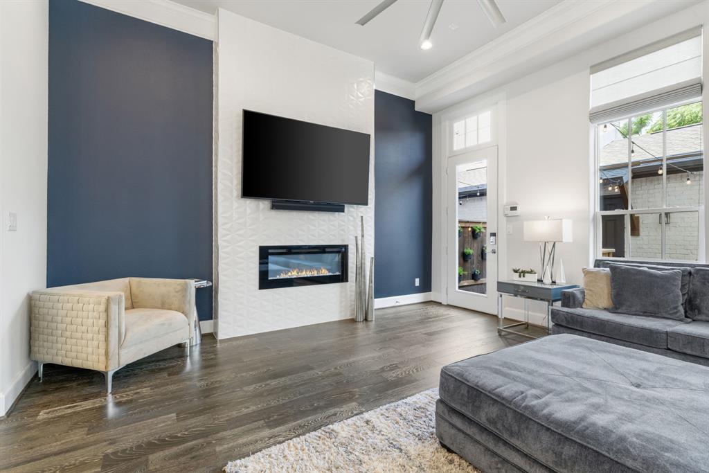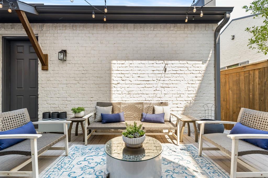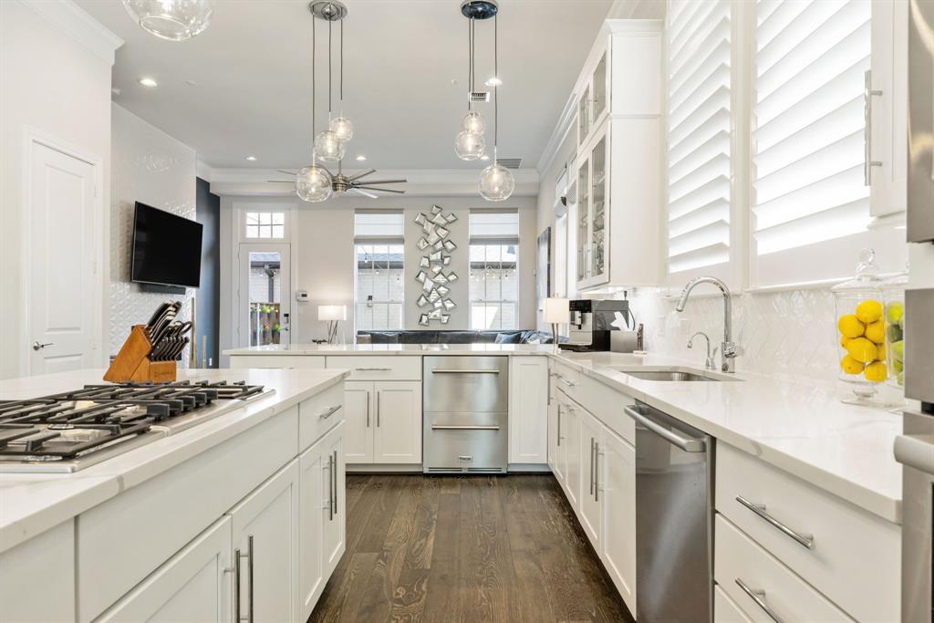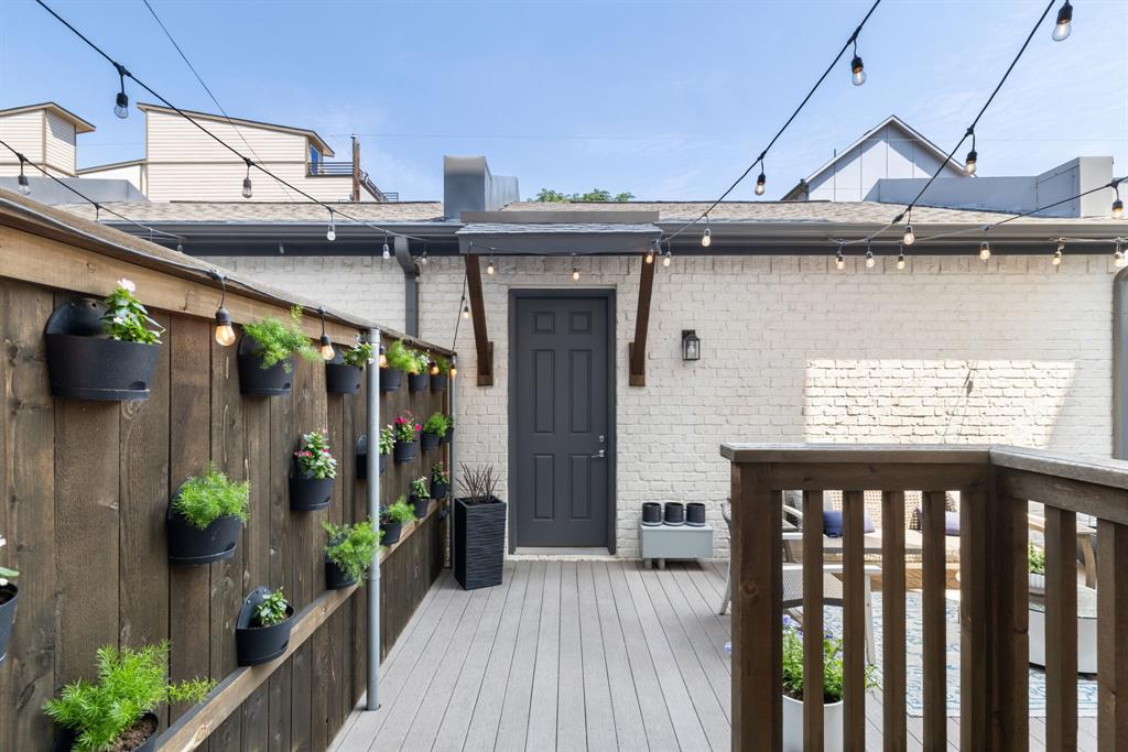 Immaculate three-story end-unit townhome filled with natural light and designed for first-floor living. The open-concept main level boasts soaring 12-foot ceilings, a custom tile accent wall with electric fireplace in the living area, and a chef’s kitchen featuring stacked upper cabinetry, a Bosch appliance package, Thor undercabinet double drawer refrigerator, oversized island, and breakfast bar. Custom pendant lighting in the kitchen and dining areas add elegance and depth to the space. Step out the back door to a charming fenced backyard patio leading to the detached two-car garage. The second floor showcases a luxurious primary suite with spa-like bath and huge walk-in closet, along with a secondary bedroom with ensuite bath and a convenient laundry area. The third floor offers a third bedroom with private bath and a spacious game room with a built-in work space and stunning sliding glass doors by Western Window Systems that open to a private roof terrace. Designer paint and wallpaper accents, custom wood shutters and window coverings, and engineered hardwood floors run throughout this immaculately maintained home. With exceptional curb appeal and thoughtful upgrades, this townhome is truly move-in ready.