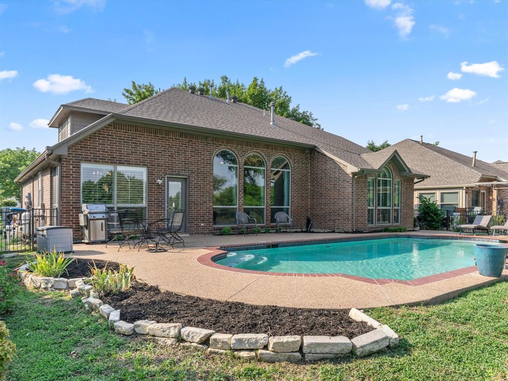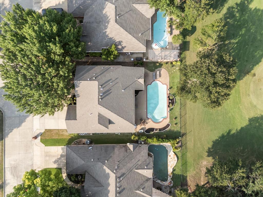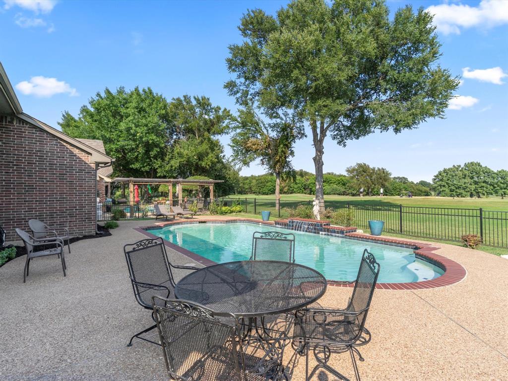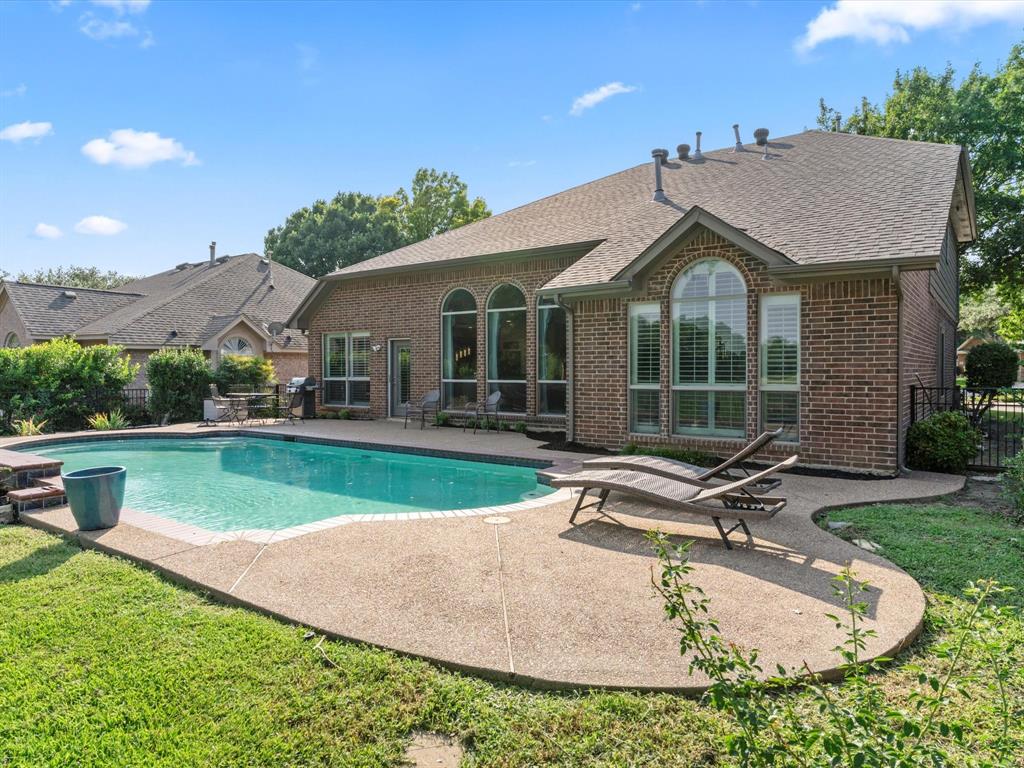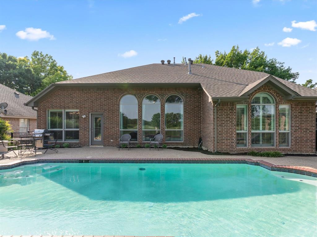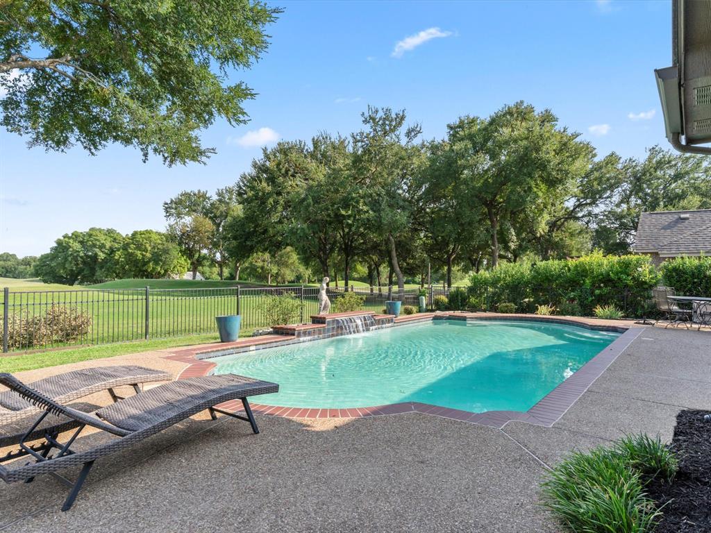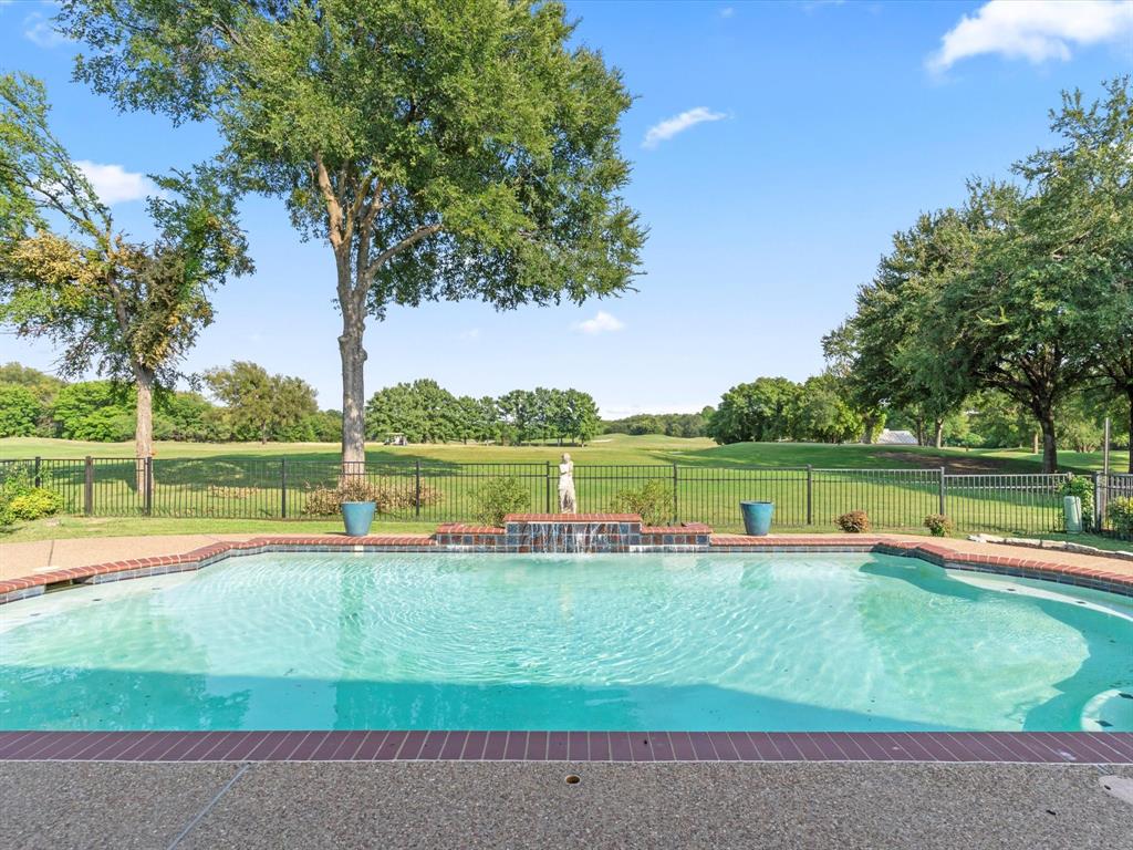 Situated on the 16th tee box of The Golf Club at Fossil Creek with exceptional water views is this 4-bedroom, 3.5-bathroom home that offers both comfort and elegance with thoughtful details throughout. Mature oak trees welcome you to this well cared for and appointed addition. Step inside to find plantation shutters, flexible living and dining spaces, and a light-filled central family room with custom built-ins, a cozy gas fireplace, and expansive views of the golf course. The breakfast room flows seamlessly into the oversized kitchen, featuring granite counters, an abundance of cabinet and counter space, stainless steel appliances including a VIKING oven and microwave, a central island with electric cooktop, and plenty of space to gather. The generously size primary suite is tucked on the first floor with high ceilings and a spa-like bath complete with a Texas-sized walk-in shower, dual sinks, extended vanity, and huge walk-in closet. Upstairs, secondary bedrooms with ceiling fans surround a versatile loft area, perfect as a game or media room. The backyard oasis is designed for entertaining with extended decking and an inviting in-ground pool—all set against the backdrop of the golf course. Additional highlights include a large utility room with space for an extra fridge or freezer, a convenient half bath downstairs, and easy access to highways, shopping, dining, and entertainment. Available for quick possession, make sure to come see it today!