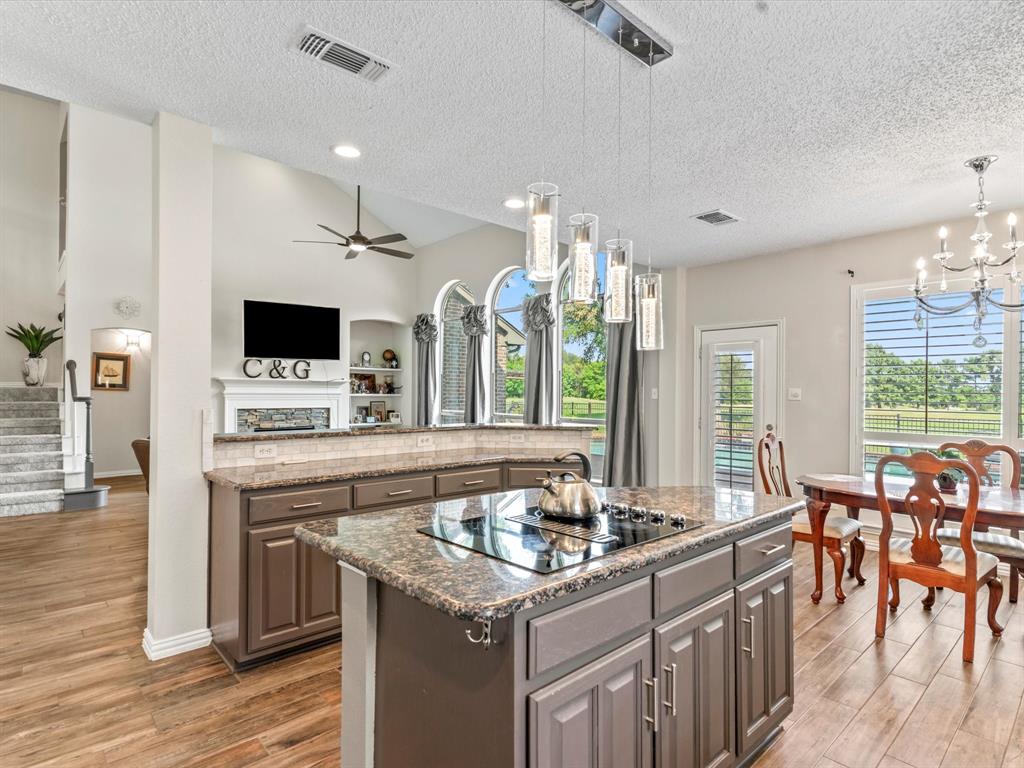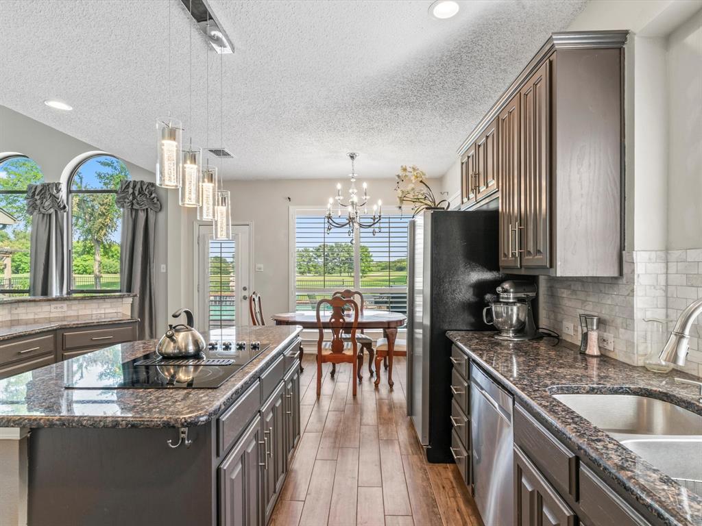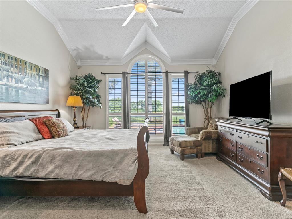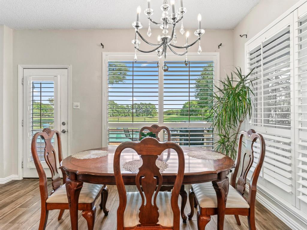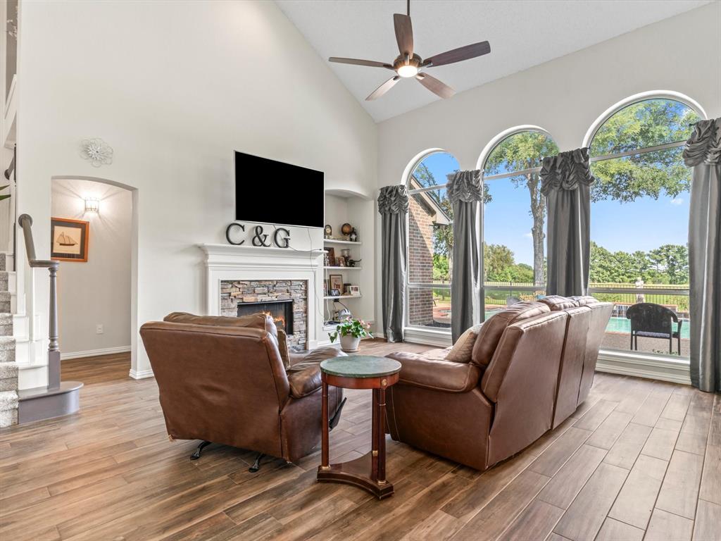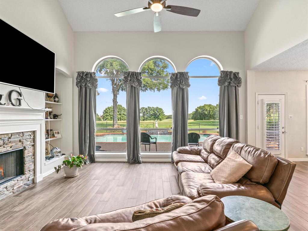 Situated on the 16th tee box of The Golf Club at Fossil Creek with exceptional water views is this 4-bedroom, 3.5-bathroom home that offers both comfort and elegance with thoughtful details throughout. Mature oak trees welcome you to this well cared for and appointed addition. Step inside to find plantation shutters, flexible living and dining spaces, and a light-filled central family room with custom built-ins, a cozy gas fireplace, and expansive views of the golf course. The breakfast room flows seamlessly into the oversized kitchen, featuring granite counters, an abundance of cabinet and counter space, stainless steel appliances including a VIKING oven and microwave, a central island with electric cooktop, and plenty of space to gather. The generously size primary suite is tucked on the first floor with high ceilings and a spa-like bath complete with a Texas-sized walk-in shower, dual sinks, extended vanity, and huge walk-in closet. Upstairs, secondary bedrooms with ceiling fans surround a versatile loft area, perfect as a game or media room. The backyard oasis is designed for entertaining with extended decking and an inviting in-ground pool—all set against the backdrop of the golf course. Additional highlights include a large utility room with space for an extra fridge or freezer, a convenient half bath downstairs, and easy access to highways, shopping, dining, and entertainment. Available for quick possession, make sure to come see it today!