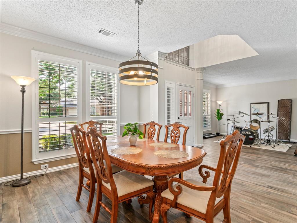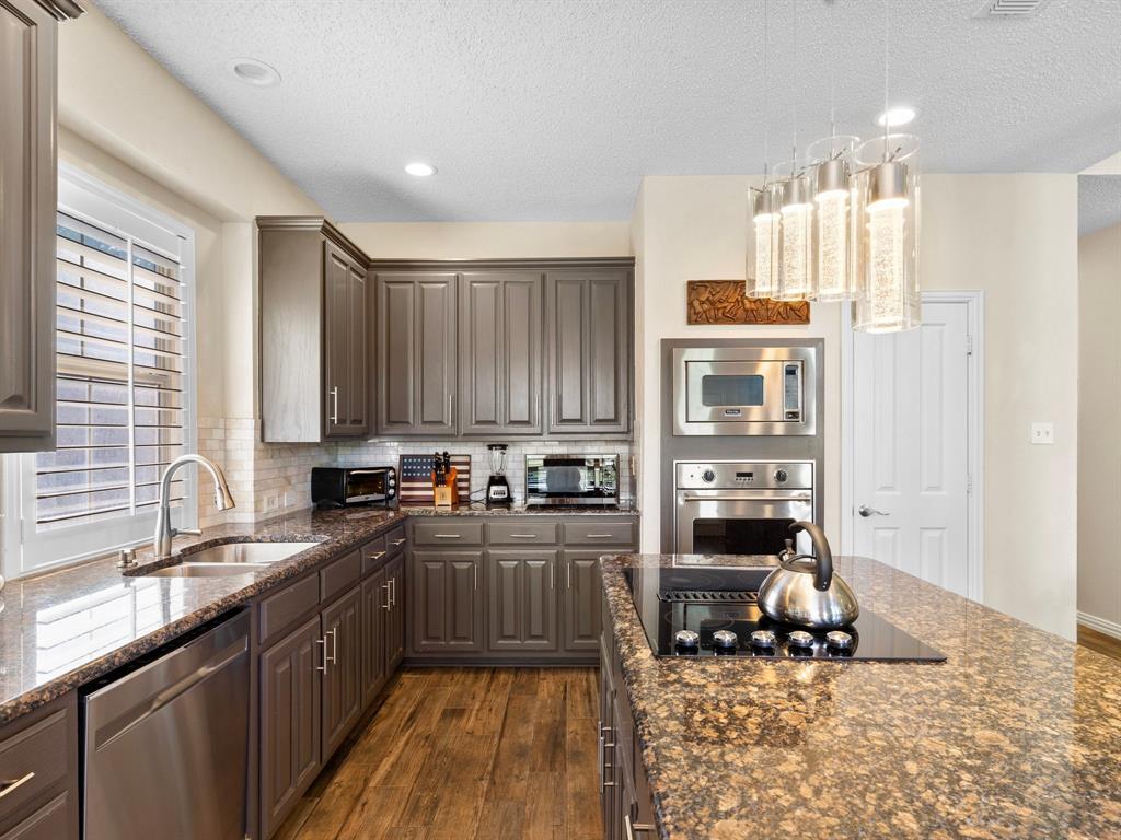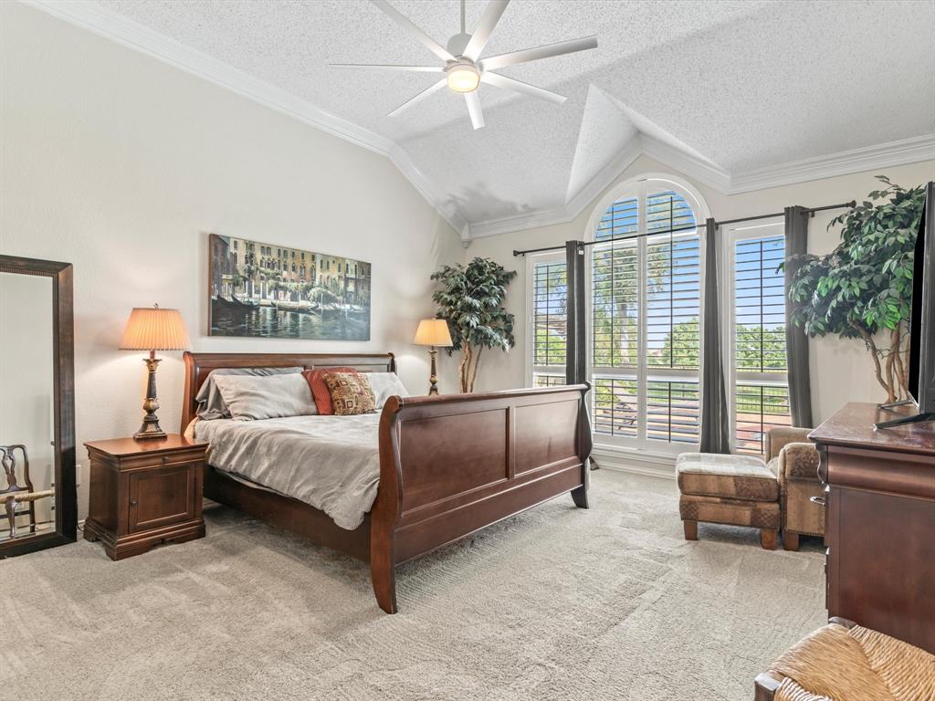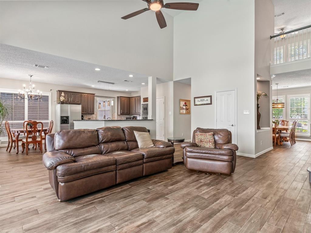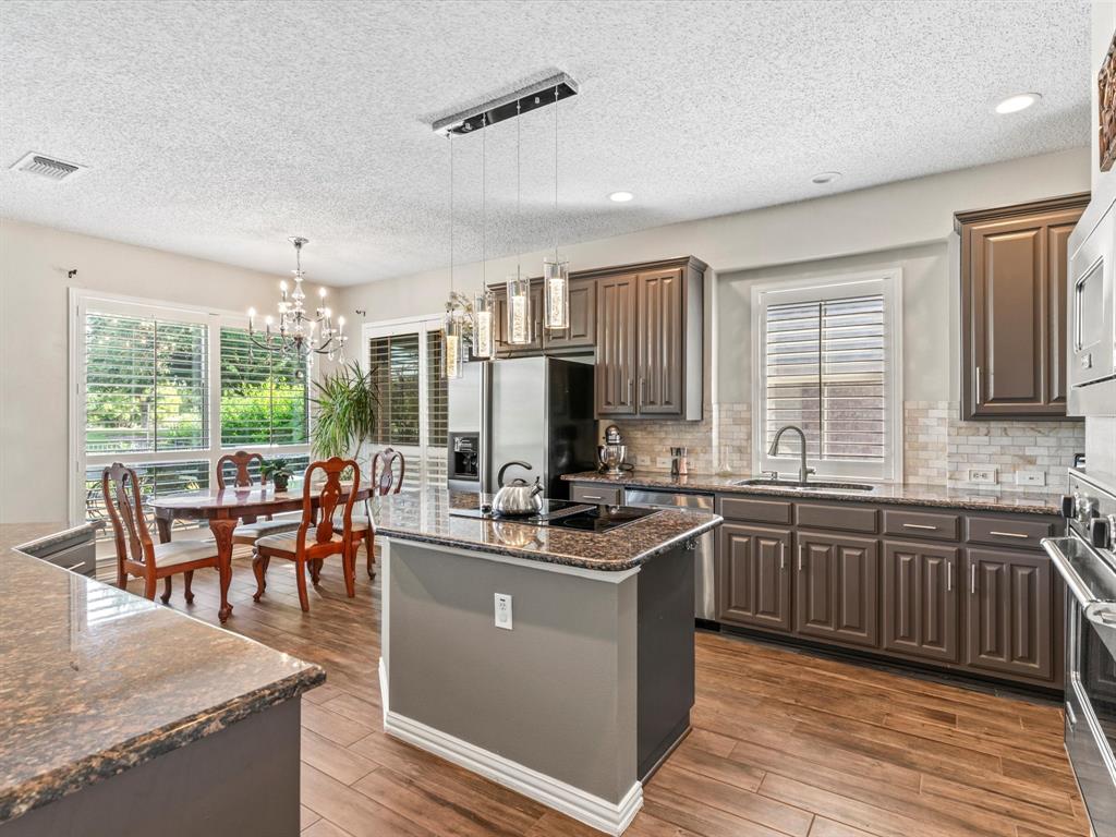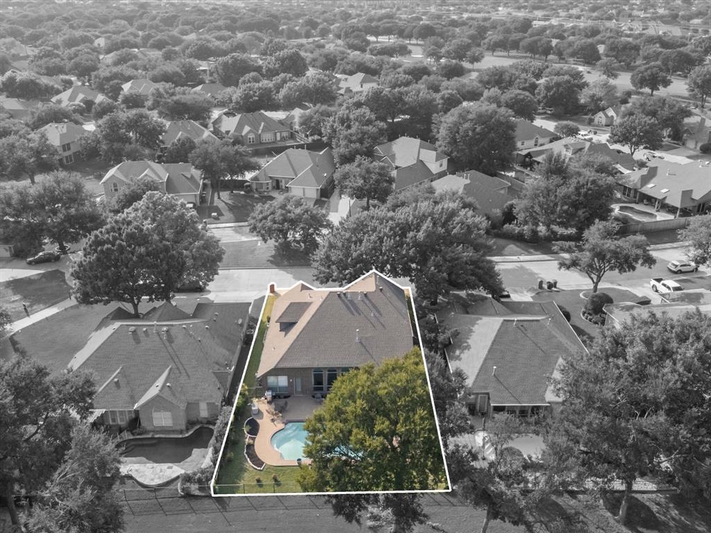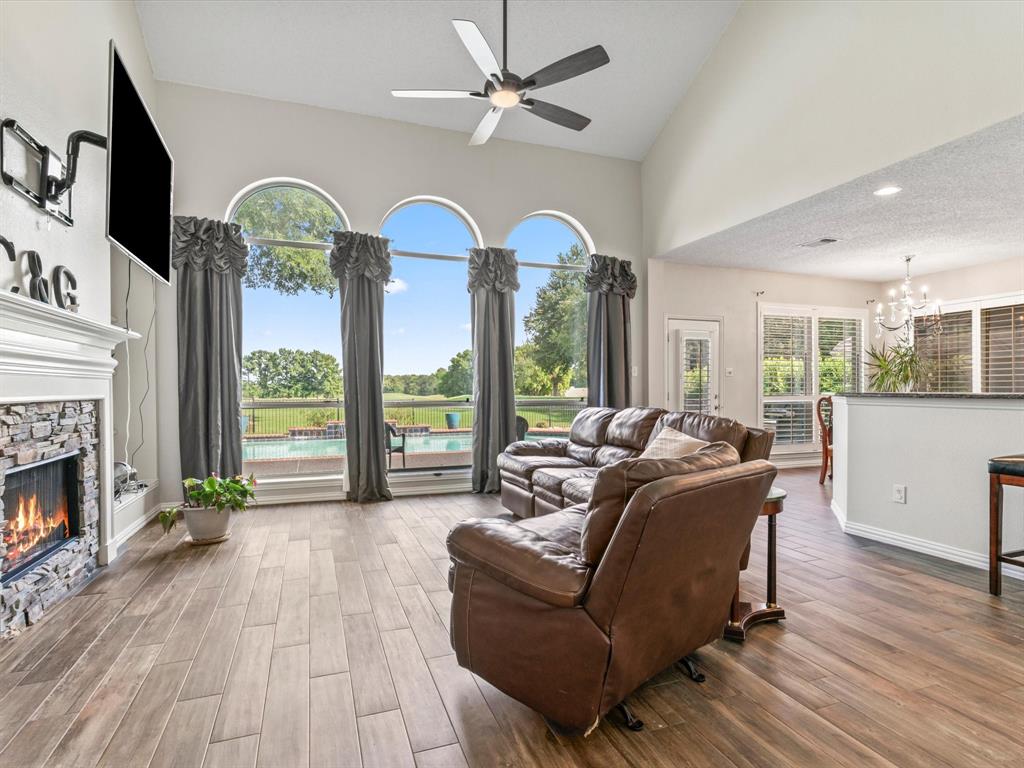 Situated on the 16th tee box of The Golf Club at Fossil Creek with exceptional water views is this 4-bedroom, 3.5-bathroom home that offers both comfort and elegance with thoughtful details throughout. Mature oak trees welcome you to this well cared for and appointed addition. Step inside to find plantation shutters, flexible living and dining spaces, and a light-filled central family room with custom built-ins, a cozy gas fireplace, and expansive views of the golf course. The breakfast room flows seamlessly into the oversized kitchen, featuring granite counters, an abundance of cabinet and counter space, stainless steel appliances including a VIKING oven and microwave, a central island with electric cooktop, and plenty of space to gather. The generously size primary suite is tucked on the first floor with high ceilings and a spa-like bath complete with a Texas-sized walk-in shower, dual sinks, extended vanity, and huge walk-in closet. Upstairs, secondary bedrooms with ceiling fans surround a versatile loft area, perfect as a game or media room. The backyard oasis is designed for entertaining with extended decking and an inviting in-ground pool—all set against the backdrop of the golf course. Additional highlights include a large utility room with space for an extra fridge or freezer, a convenient half bath downstairs, and easy access to highways, shopping, dining, and entertainment. Available for quick possession, make sure to come see it today!