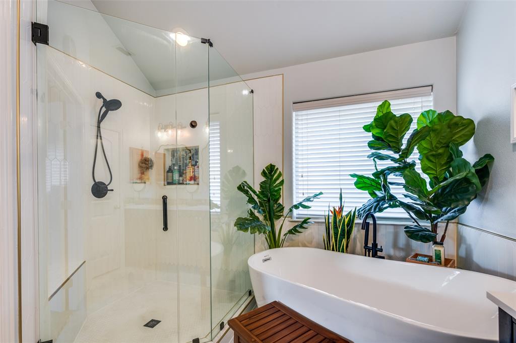 The fully renovated primary bathroom is a true retreat, boasting a soaking tub, custom glass shower with bench, and dual sink vanity. Enjoy peace of mind with major updates completed in the past 5 years, including a new roof, gutters, wood-look tile flooring, stain-resistant carpet in bedrooms, a smart-controlled sprinkler system with drip irrigation, and a freshly painted exterior which adds to this home's exceptional curb appeal.