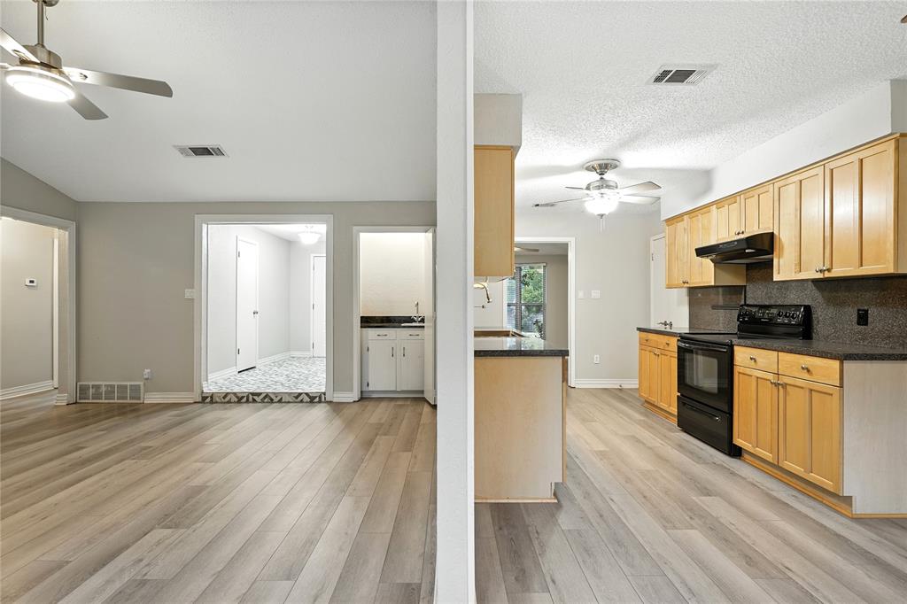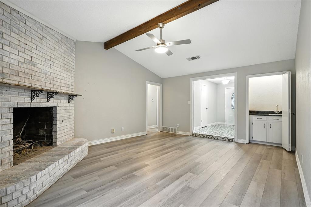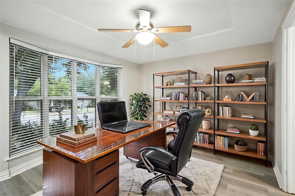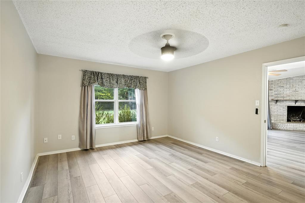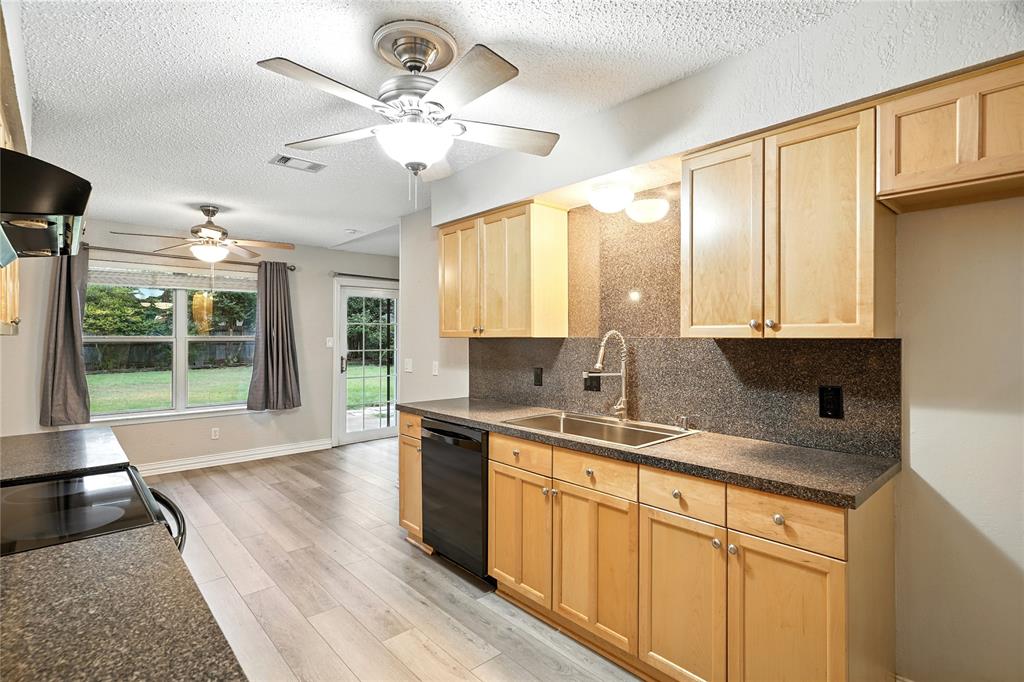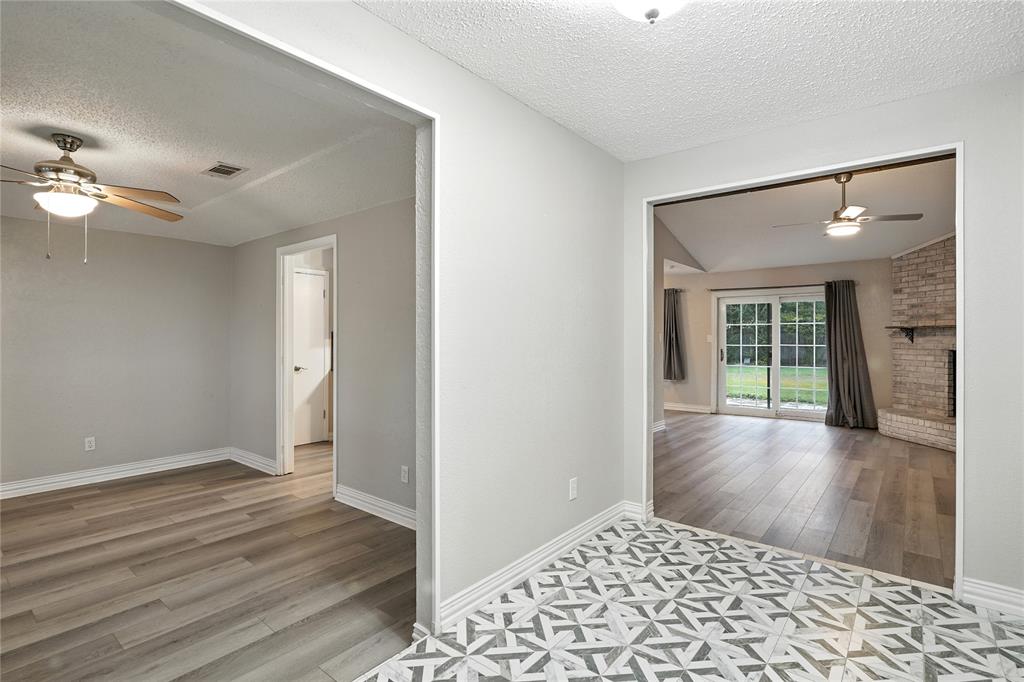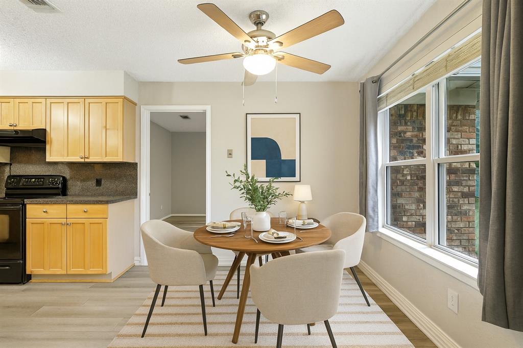 Inside, you’ll find updated flooring (2025), no carpet, a spacious layout, and plenty of natural light. The oversized front entry leads into a versatile flex space that can be used as a living room, dining area, or home office. The cozy den features vaulted ceilings, a gas fireplace with ceramic logs, and access to the backyard through an updated sliding glass door.