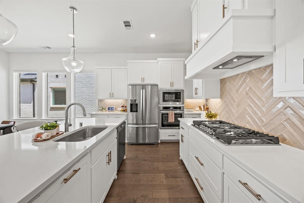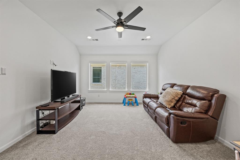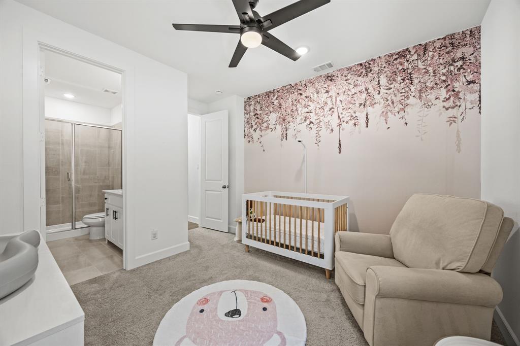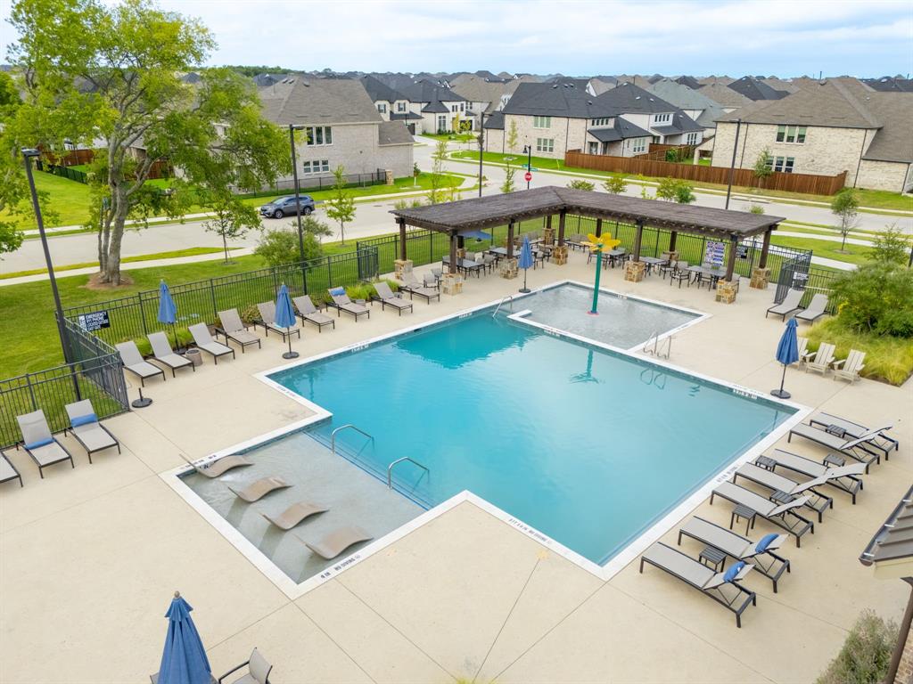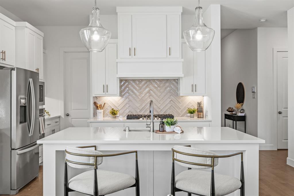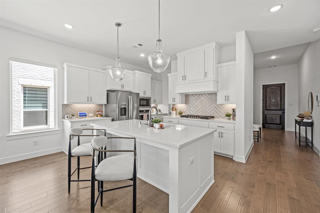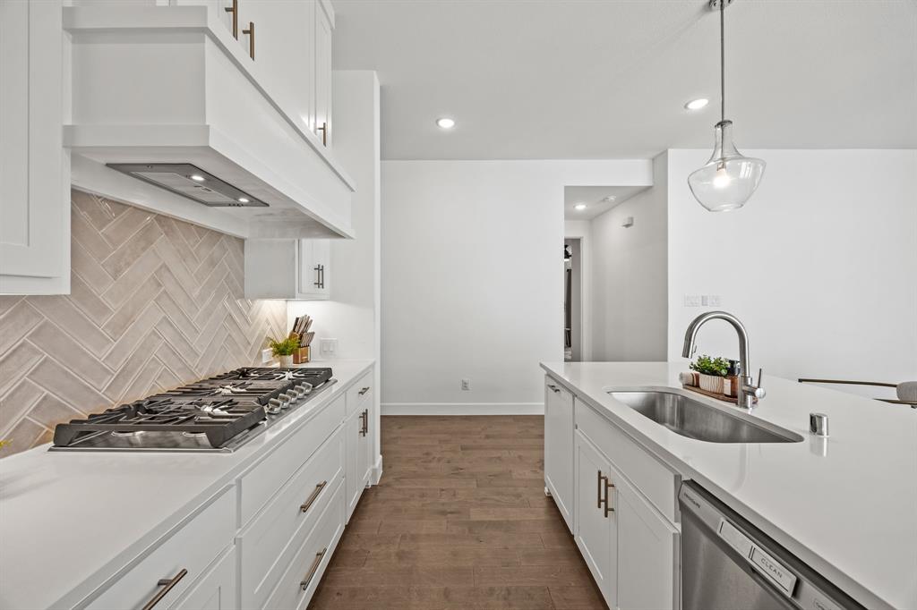 The main level features an open-concept layout with three bedrooms, three full baths, and a private study—ideal for working from home or used as a comfy den or downstairs playroom. The kitchen showcases crisp white cabinetry, a striking herringbone ceramic backsplash, quartz countertops, stainless steel gas appliances, and a spacious walk-in pantry. It flows effortlessly into the light-filled living and dining areas, making entertaining a breeze. Upstairs, you'll find a large game room, a fourth bedroom, and a full bath—perfect for guests, teens, or additional living space. Enjoy access to a community pool and playground, all with a low annual HOA.