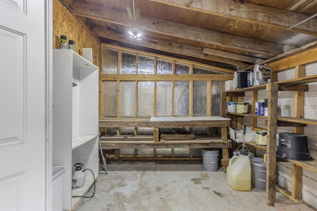 Off the porch, there’s a 10' x 10' storage or workshop space complete with a workbench and ample room for a deep freezer. On the west side, a shed-style roof provides covered space ideal for storing large items, or even parking two vehicles out of the weather.