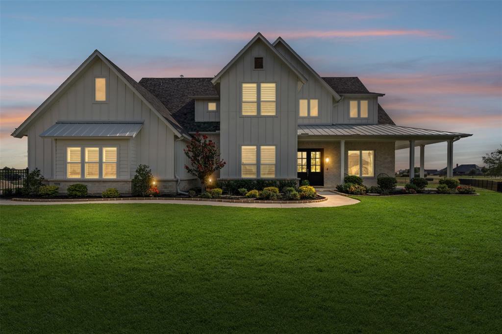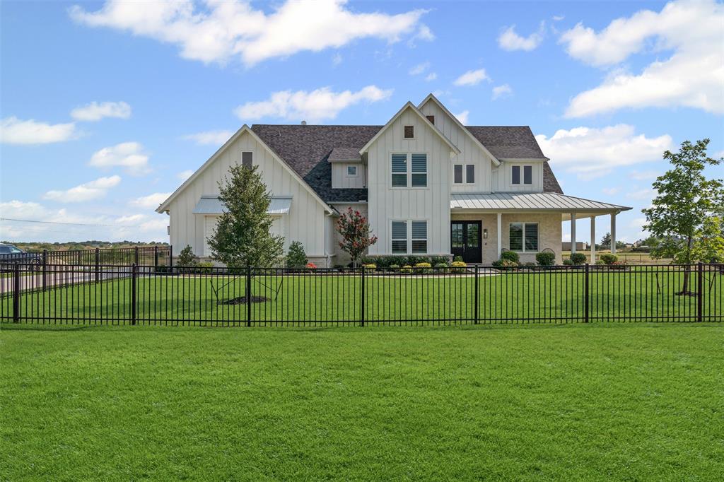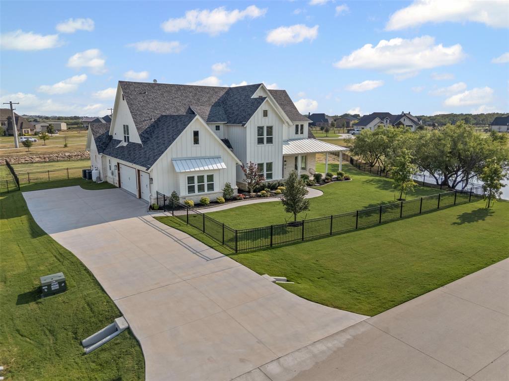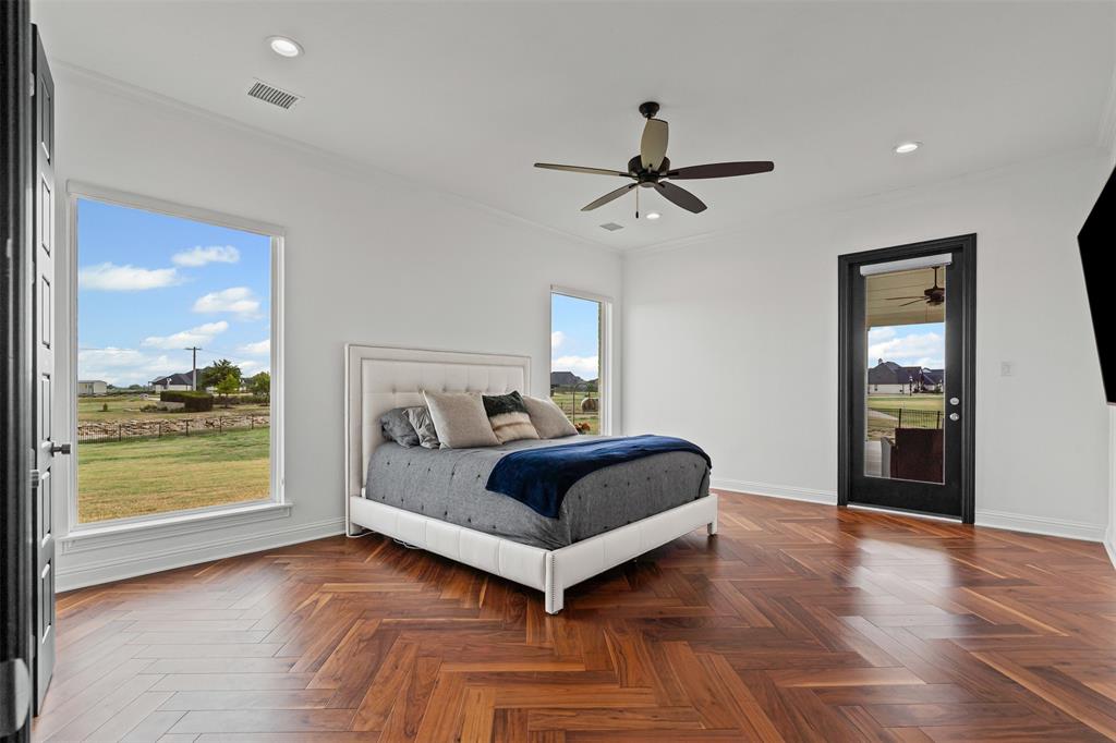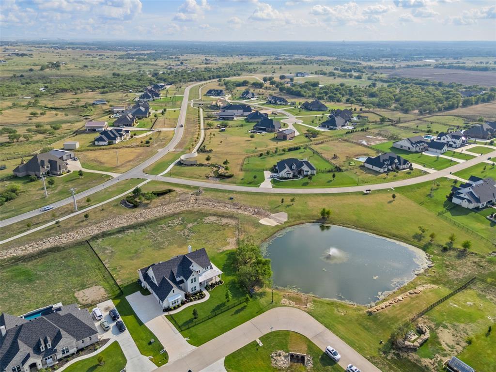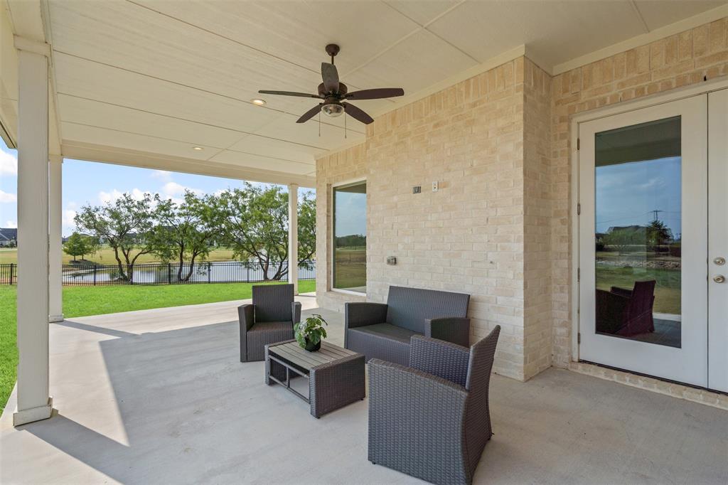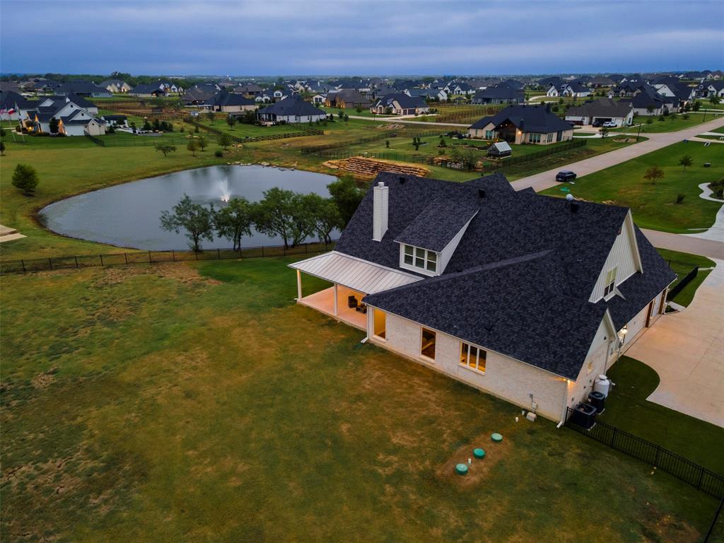 OPEN HOUSE, 2PM - 4PM SATURDAY SEPTEMBER 20TH. Nestled on a one acre lot in the coveted Stardust Ranch community, this stunning home offers the perfect balance of modern luxury and tranquility. Overlooking a sparkling two-acre pond, the home provides unmatched views and unforgettable sunsets, best enjoyed from the expansive wrap-around porch. Inside, floor-to-ceiling windows complemented by automatic shades and elegant plantation shutters fill the home with abundant natural light. The chef-inspired kitchen is a true showstopper, showcasing natural quartzite countertops, a stone backsplash, an oversized island, stainless steel appliances, a five-burner gas cooktop, double ovens, and an abundance of storage including a HUGE walk in pantry. The primary suite is designed for relaxation, with direct patio access, peaceful water views, and a spa-like ensuite bath. Custom herringbone pattern hardwood flooring throughout the owner’s suite (including closet) and the spacious media room adds an elevated, bespoke touch to the home’s refined finishes. A separate downstairs bedroom with a private bath is perfect for guests, while the study, enclosed by French doors, creates a serene retreat for work or creativity. Upstairs, you’ll find a spacious game room, two generously sized bedrooms, a full bath, and convenient walk-in attic storage. This home seamlessly combines elegance, comfort, and breathtaking surroundings, making it a true must see!