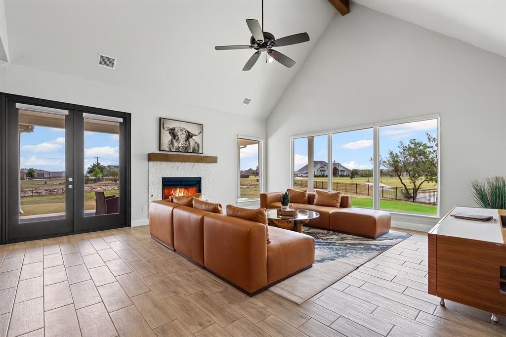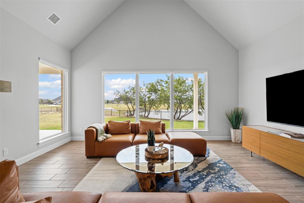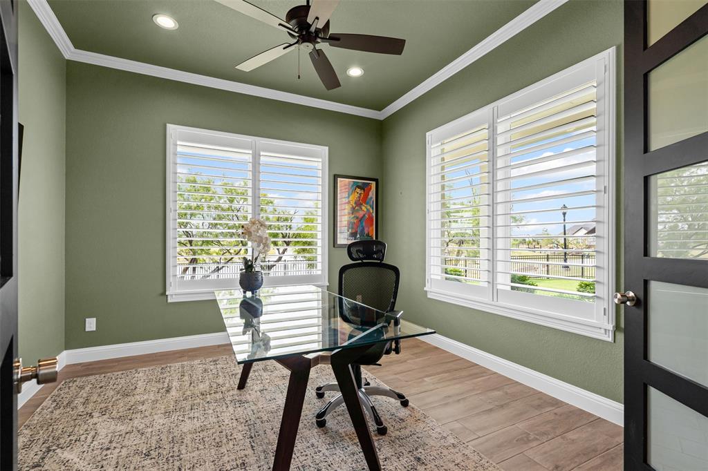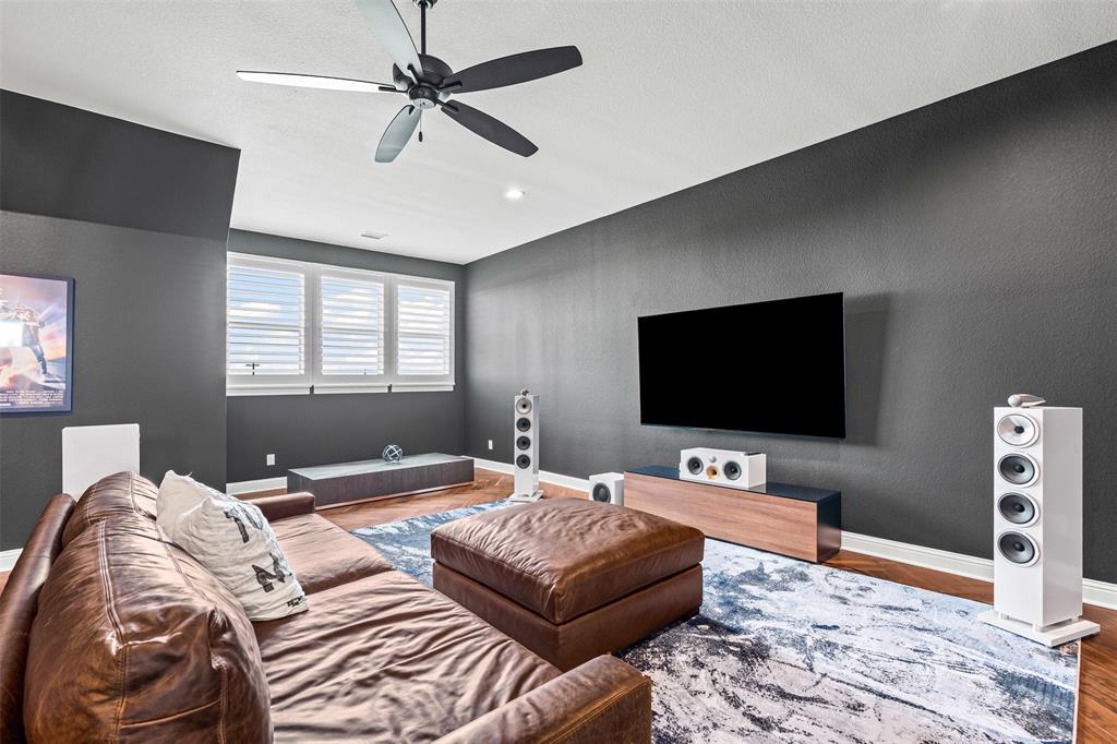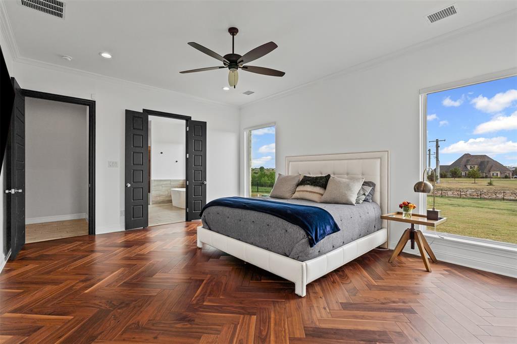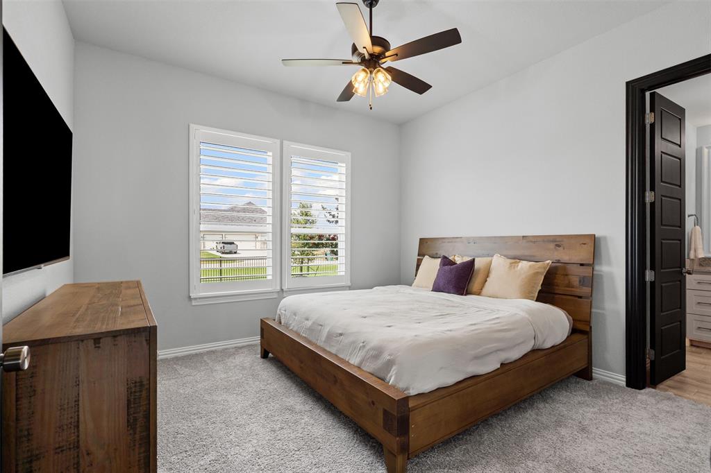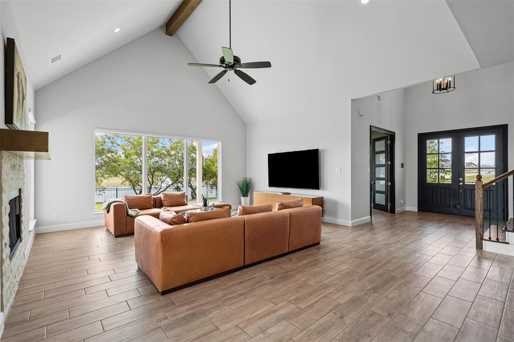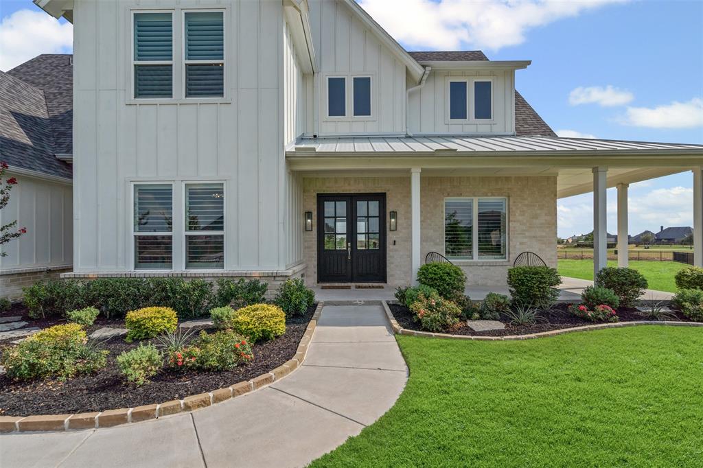 OPEN HOUSE, 2PM - 4PM SATURDAY SEPTEMBER 20TH. Nestled on a one acre lot in the coveted Stardust Ranch community, this stunning home offers the perfect balance of modern luxury and tranquility. Overlooking a sparkling two-acre pond, the home provides unmatched views and unforgettable sunsets, best enjoyed from the expansive wrap-around porch. Inside, floor-to-ceiling windows complemented by automatic shades and elegant plantation shutters fill the home with abundant natural light. The chef-inspired kitchen is a true showstopper, showcasing natural quartzite countertops, a stone backsplash, an oversized island, stainless steel appliances, a five-burner gas cooktop, double ovens, and an abundance of storage including a HUGE walk in pantry. The primary suite is designed for relaxation, with direct patio access, peaceful water views, and a spa-like ensuite bath. Custom herringbone pattern hardwood flooring throughout the owner’s suite (including closet) and the spacious media room adds an elevated, bespoke touch to the home’s refined finishes. A separate downstairs bedroom with a private bath is perfect for guests, while the study, enclosed by French doors, creates a serene retreat for work or creativity. Upstairs, you’ll find a spacious game room, two generously sized bedrooms, a full bath, and convenient walk-in attic storage. This home seamlessly combines elegance, comfort, and breathtaking surroundings, making it a true must see!