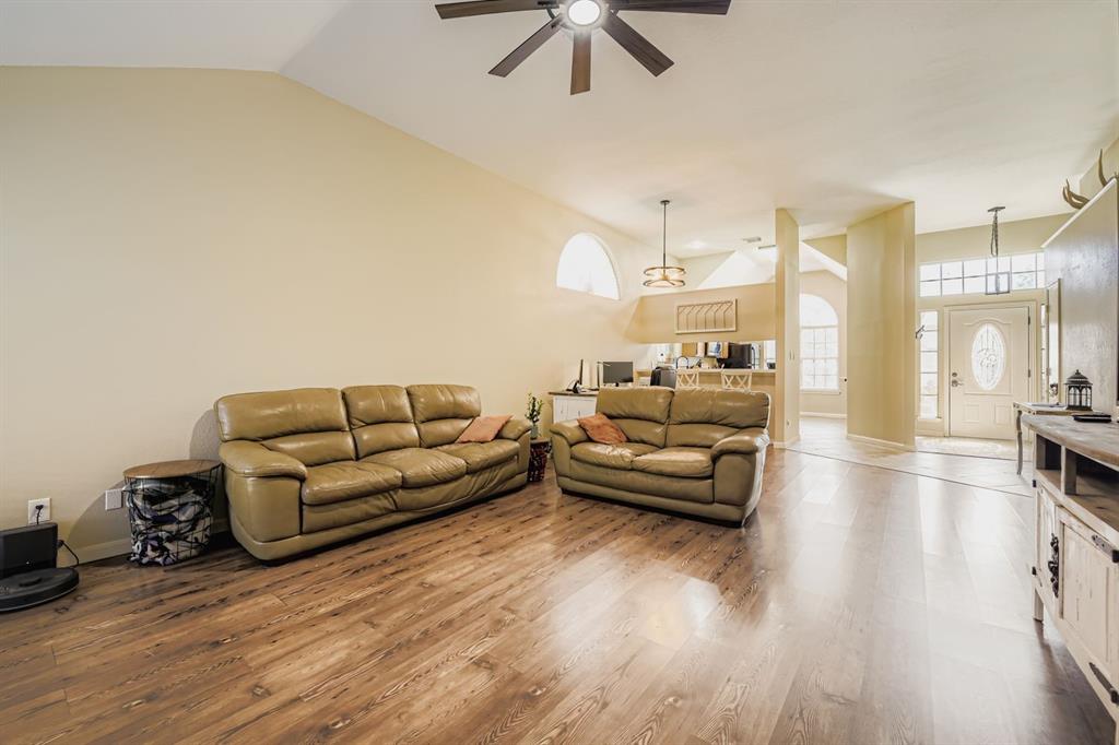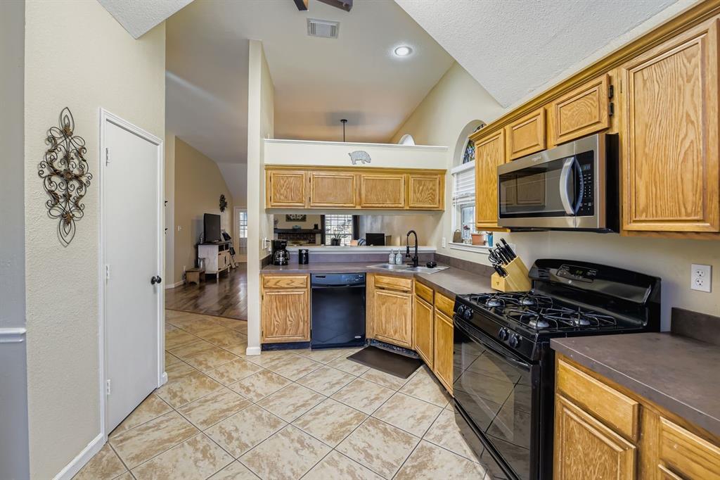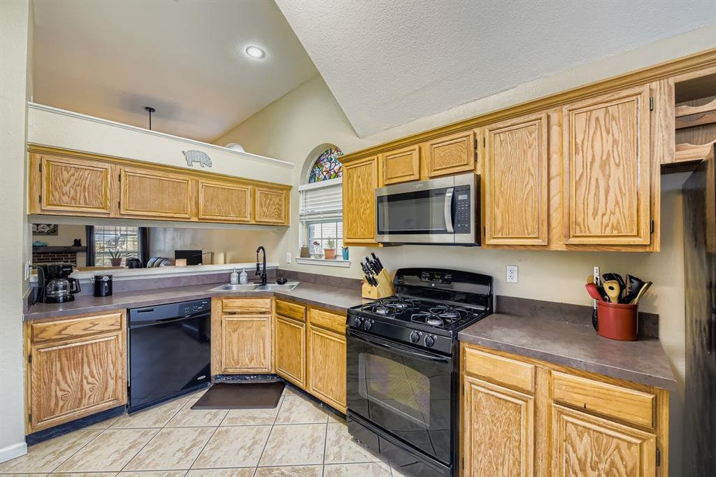The kitchen is bright with recessed lighting, a breakfast nook, a breakfast bar, is perfect for casual dining. The open living and dining area features a cozy wood-burning fireplace, ideal for entertaining. The primary ensuite includes high ceilings, bathroom with dual sinks, a tub-shower combo, and a walk-in closet. Secondary bedrooms are well-sized, and the secondary full bath has an updated shower.