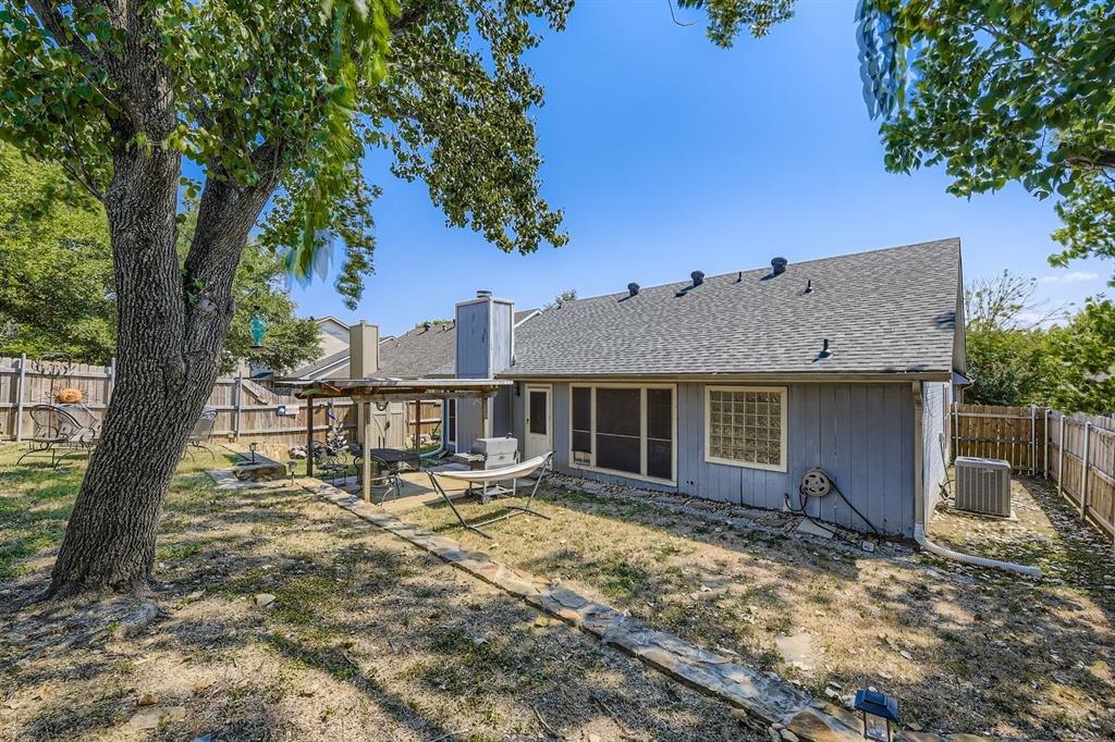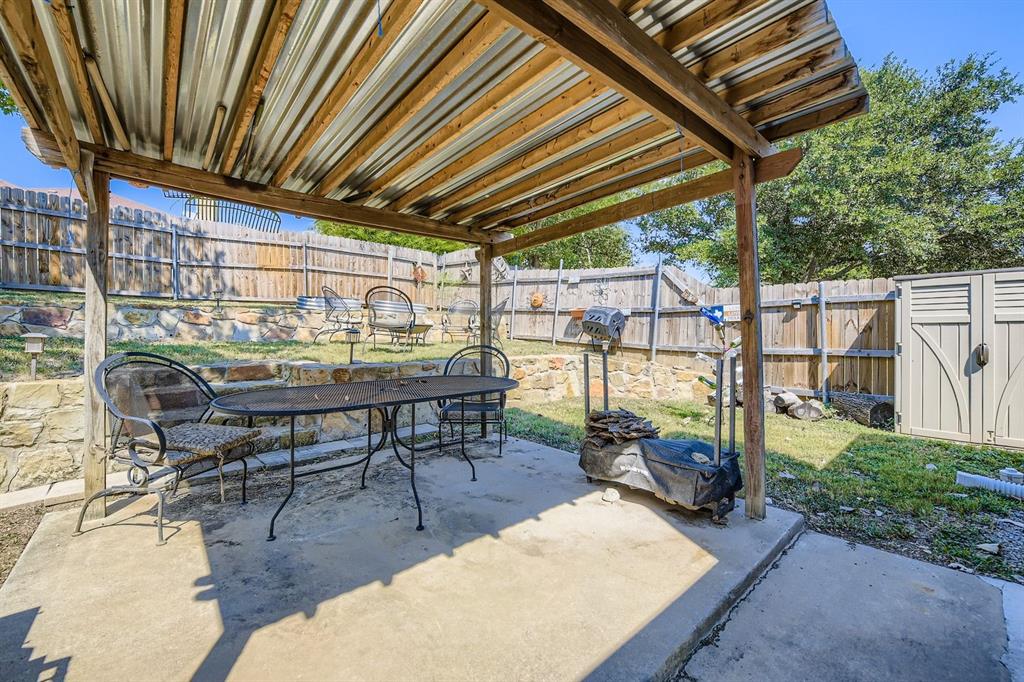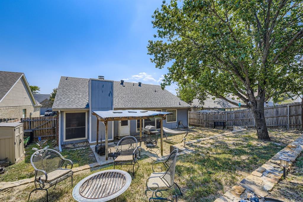 The covered patio with a pergola and fenced backyard is perfect for relaxing or hosting guests.