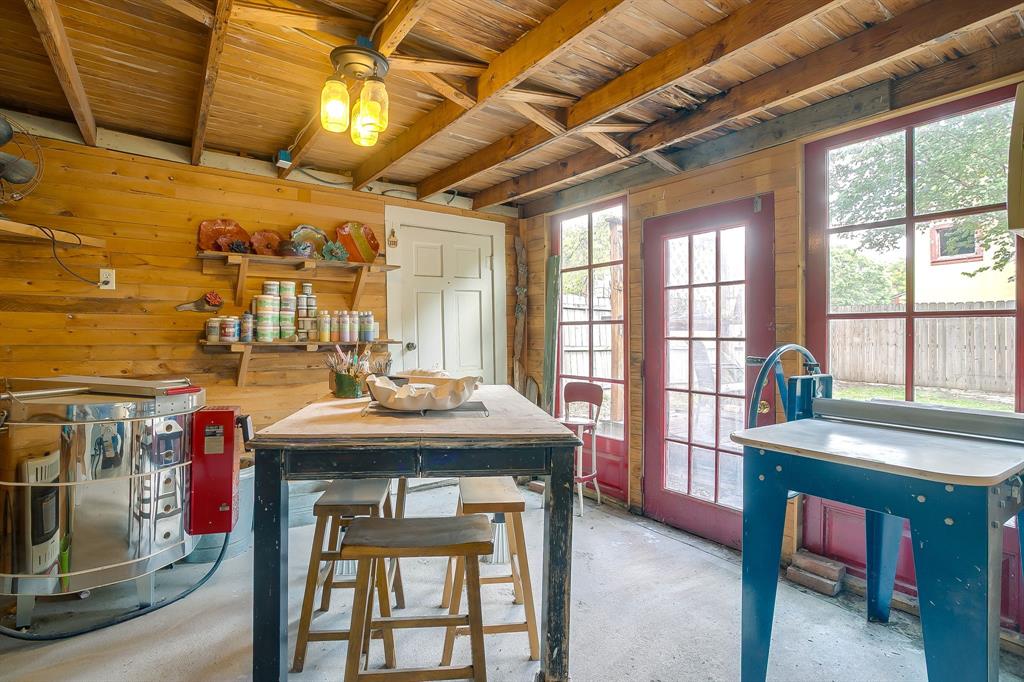 The layout offers plenty of space for dining, entertaining, and everyday living with two living spaces and dining space as well as an eat in kitchen. The front porch welcomes neighbors. A large walk in primary closet is also a feature. A detached studio garage apartment provides an excellent opportunity for guests or additional rental income, while a separate studio space offers flexibility for an art studio, workshop, or home office. The backyard is very private and secluded.