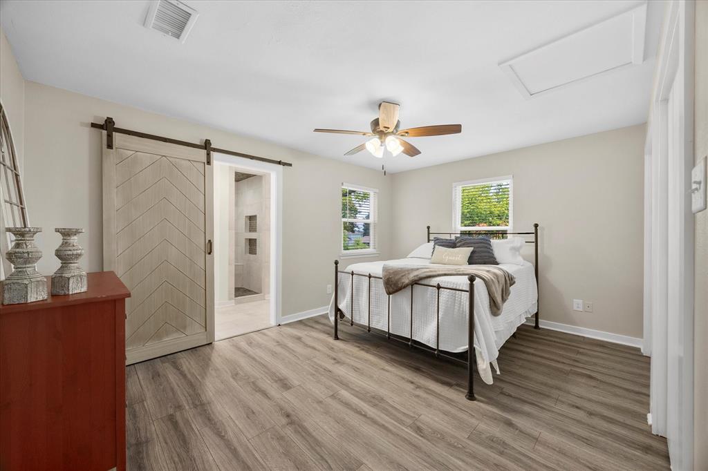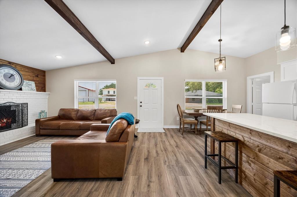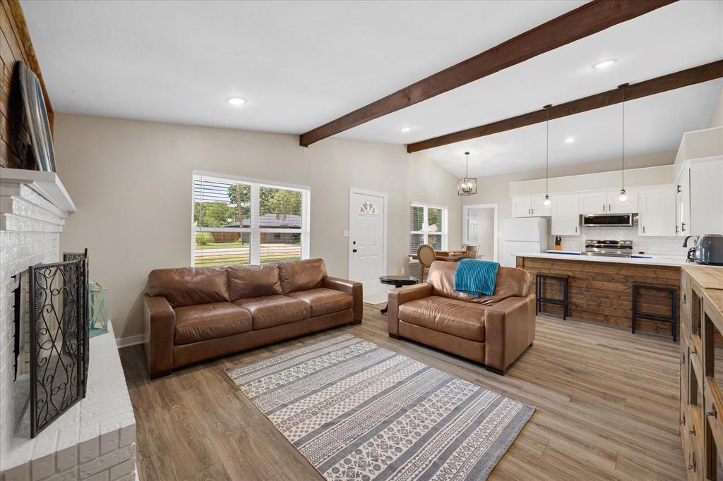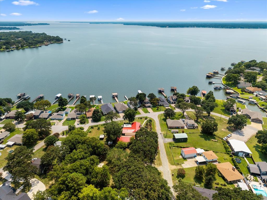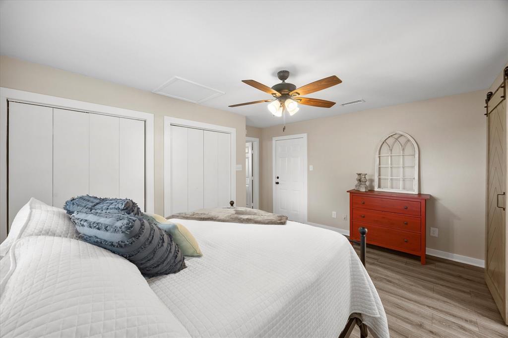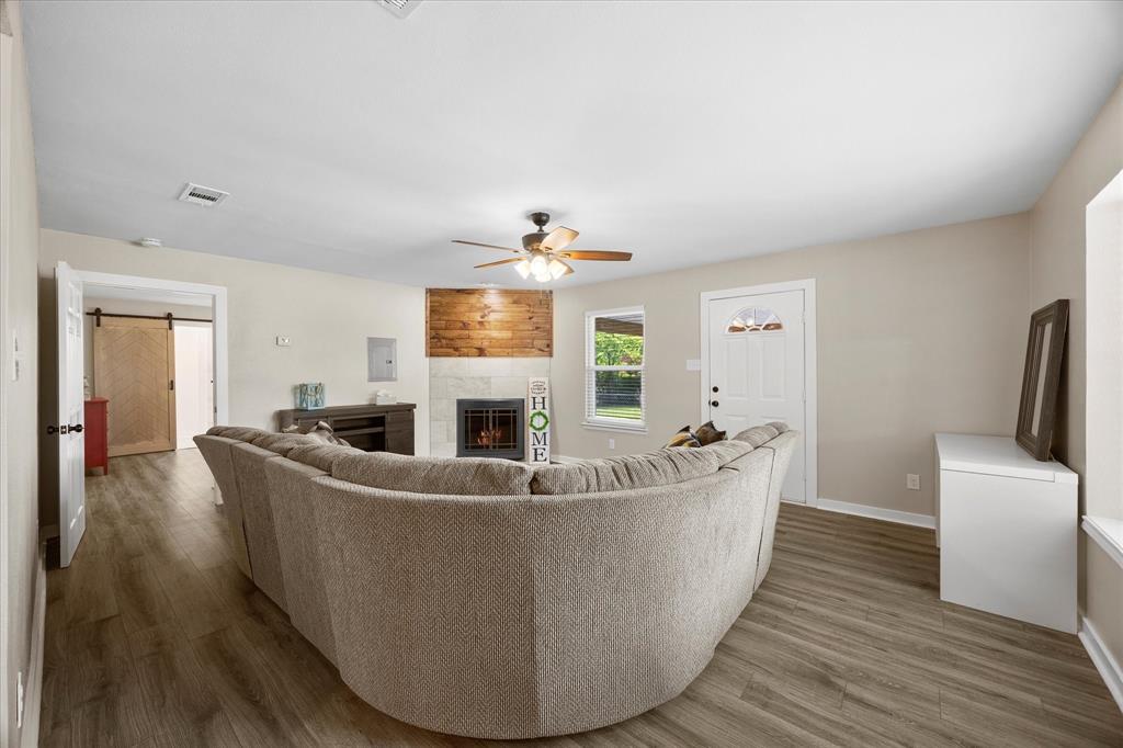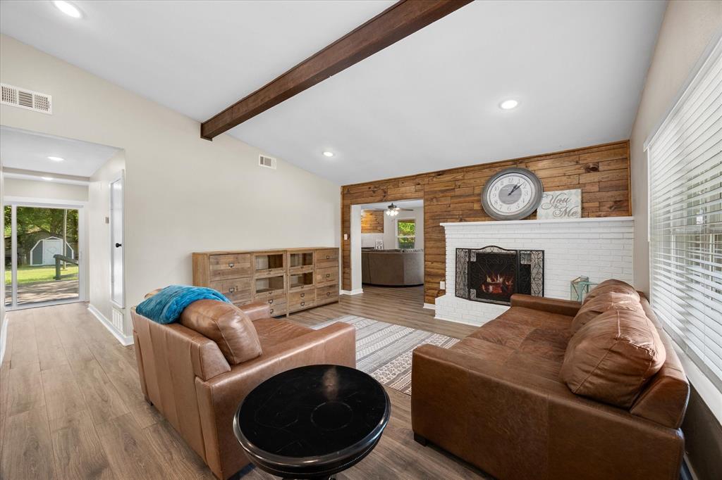 This beautifully updated home offers a warm lake community lifestyle just steps from the water. Set on a double-sized lot with multiple outdoor patios, seating areas, mature trees, and a storage building, it’s the perfect retreat for weekends or full-time living. Inside, designer touches shine with LVP flooring throughout, wood-burning fireplaces, and wood accent details on the kitchen peninsula, feature walls, and dining area. The kitchen blends modern style with charm, featuring white cabinets, wood countertops, subway tile backsplash, new hardware, and a dishwasher. The flexible layout includes dual primary bedrooms, each with private baths, decorative mirrors, walk-in closets, and built-in shelving. The oversized primary suite highlights a sliding barn door entry, a spacious walk-in shower with decorative tile, board-and-ceiling detail, shampoo shelf, and corner bench. The guest bath offers a tiled tub surround, new tub, and linen storage. Additional upgrades include a large utility room, updated water heater, and ample storage throughout. The community enhances the lifestyle with a boat ramp, park, and picnic area, perfect for enjoying lake days, fishing, or gathering with neighbors.