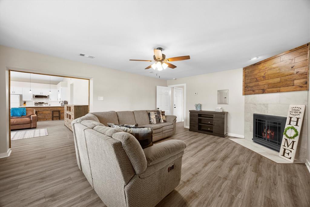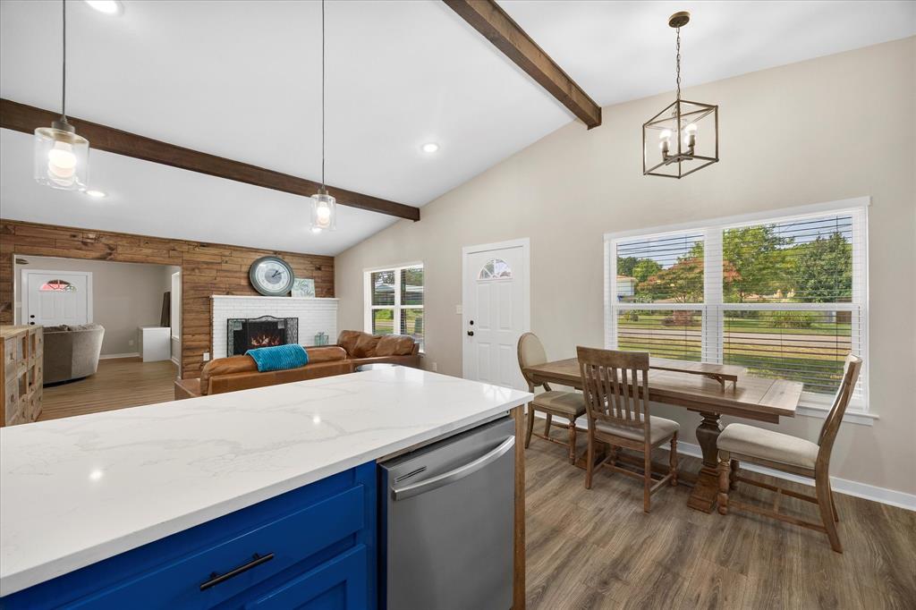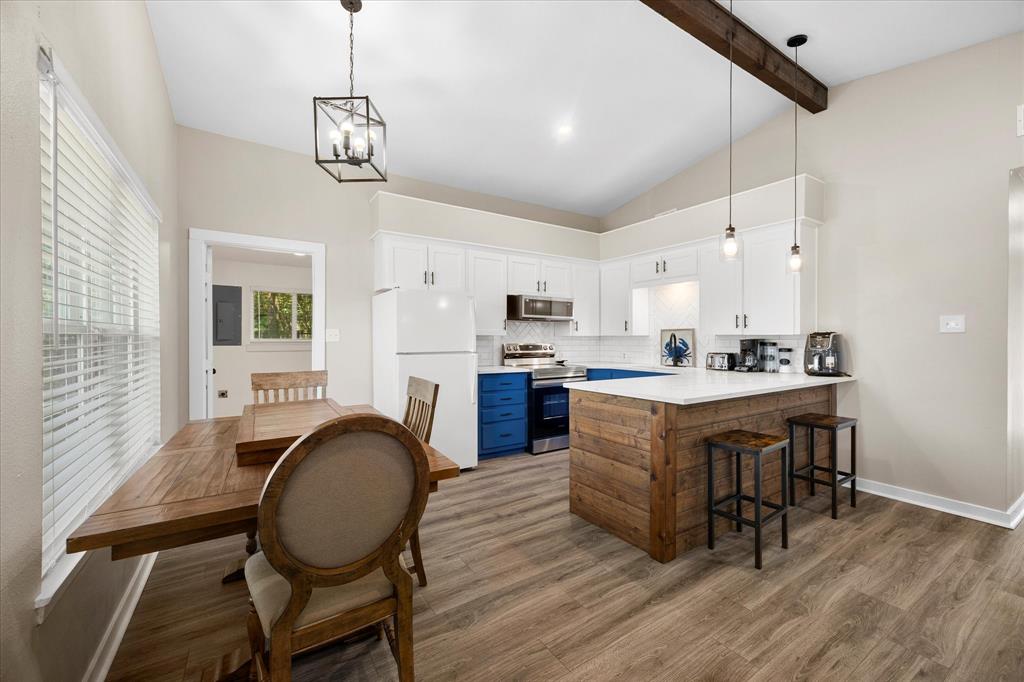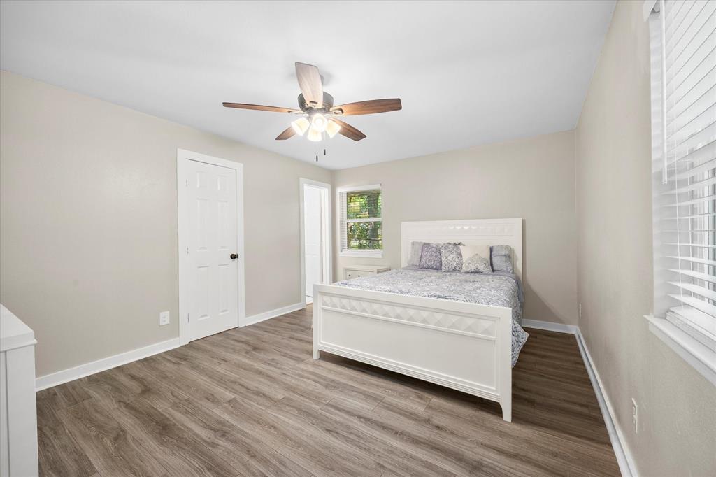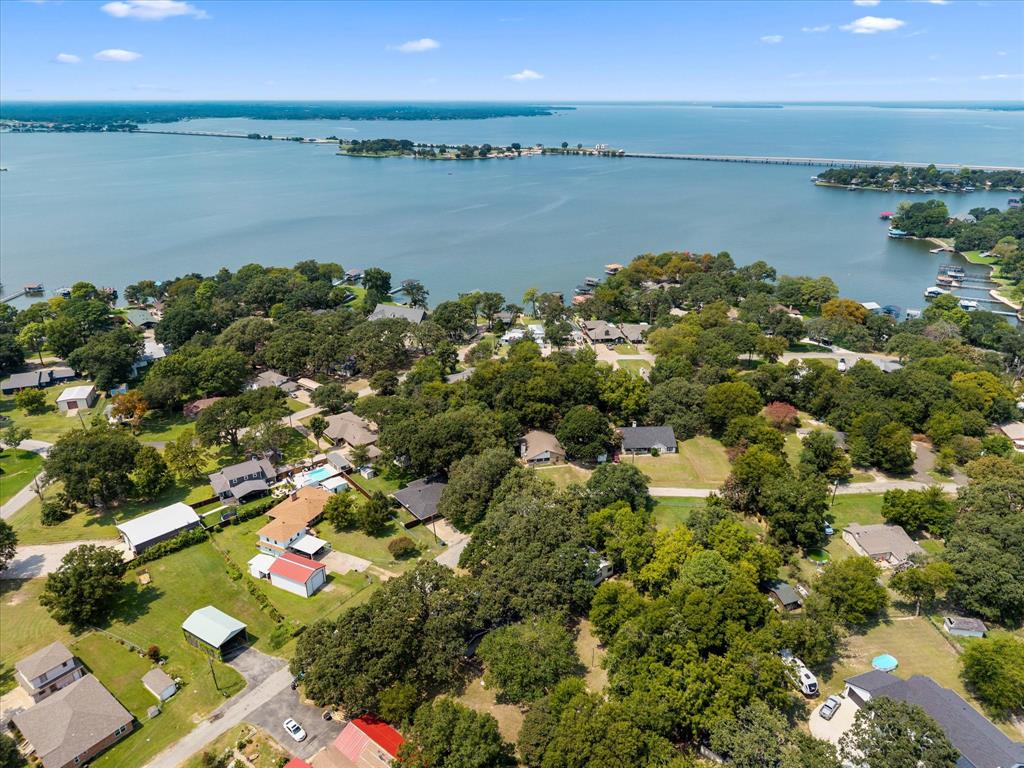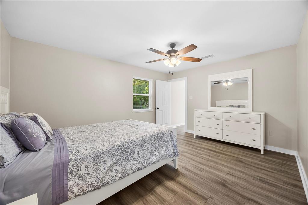 This beautifully updated home offers a warm lake community lifestyle just steps from the water. Set on a double-sized lot with multiple outdoor patios, seating areas, mature trees, and a storage building, it’s the perfect retreat for weekends or full-time living. Inside, designer touches shine with LVP flooring throughout, wood-burning fireplaces, and wood accent details on the kitchen peninsula, feature walls, and dining area. The kitchen blends modern style with charm, featuring white cabinets, wood countertops, subway tile backsplash, new hardware, and a dishwasher. The flexible layout includes dual primary bedrooms, each with private baths, decorative mirrors, walk-in closets, and built-in shelving. The oversized primary suite highlights a sliding barn door entry, a spacious walk-in shower with decorative tile, board-and-ceiling detail, shampoo shelf, and corner bench. The guest bath offers a tiled tub surround, new tub, and linen storage. Additional upgrades include a large utility room, updated water heater, and ample storage throughout. The community enhances the lifestyle with a boat ramp, park, and picnic area, perfect for enjoying lake days, fishing, or gathering with neighbors.