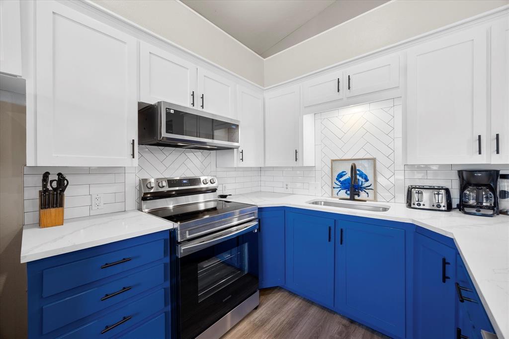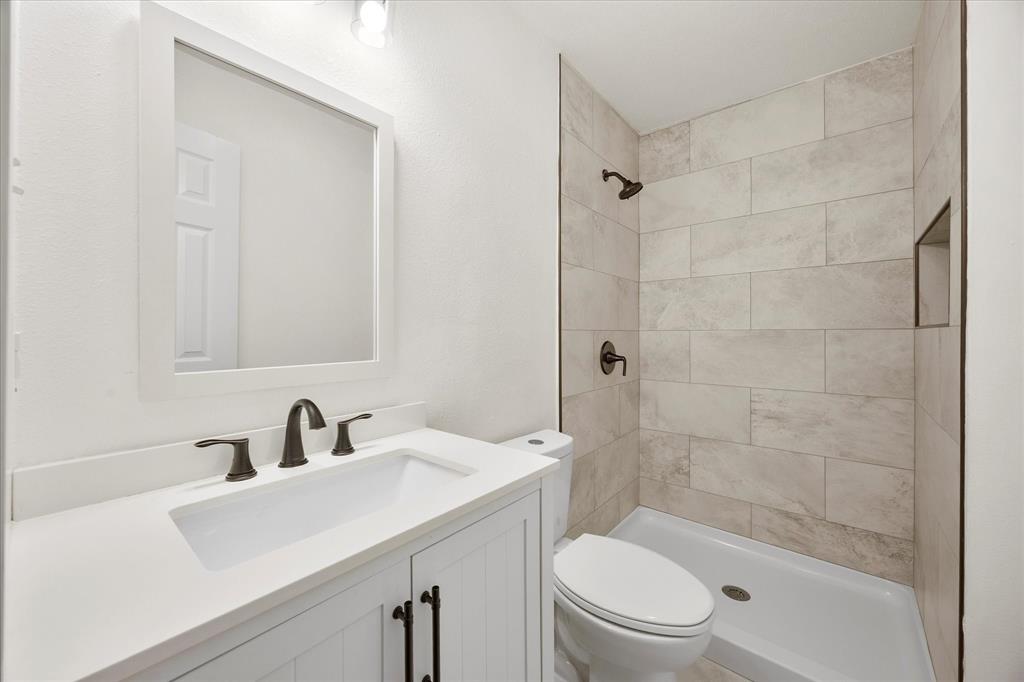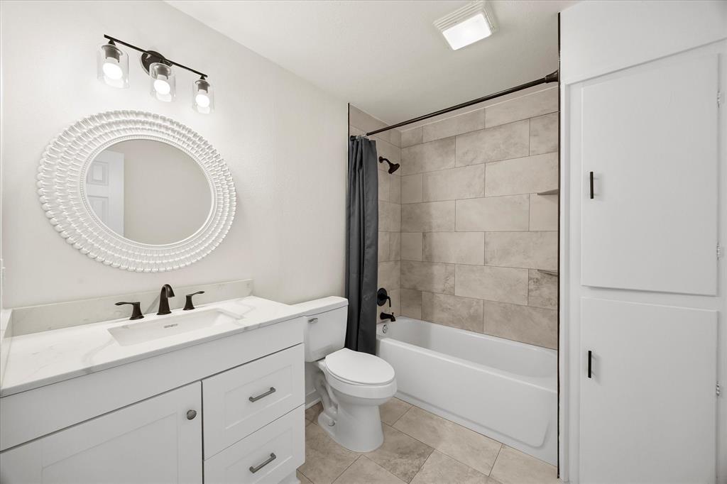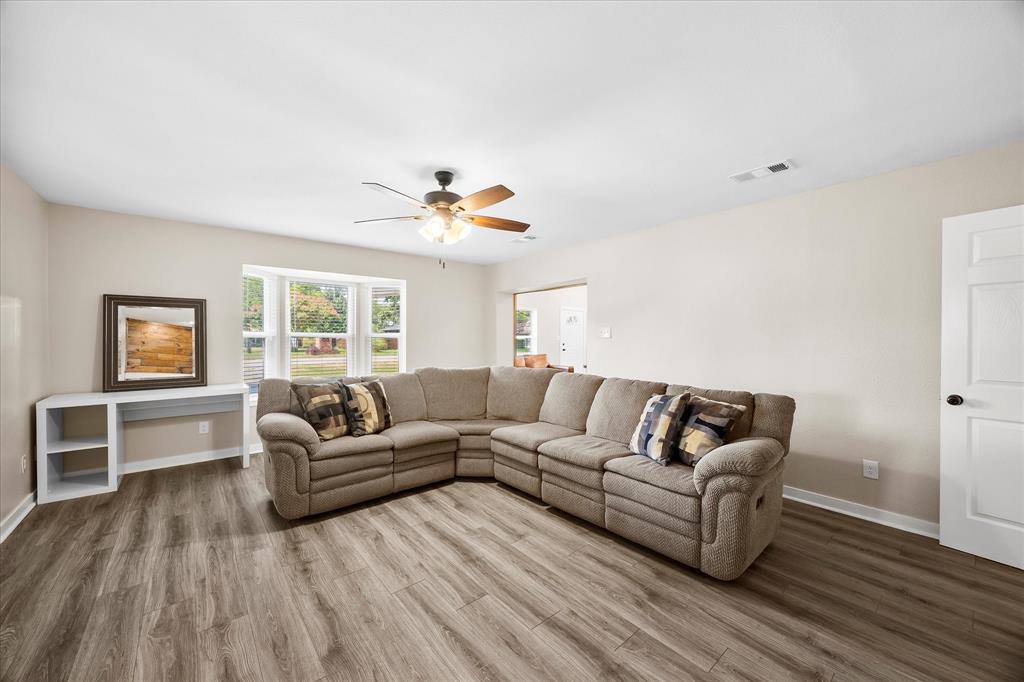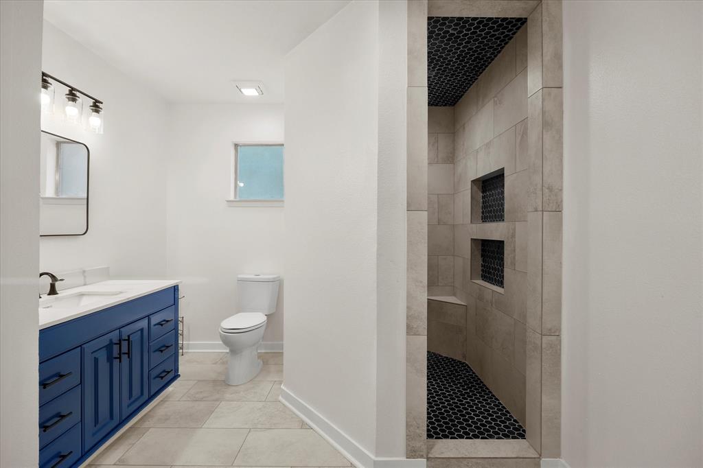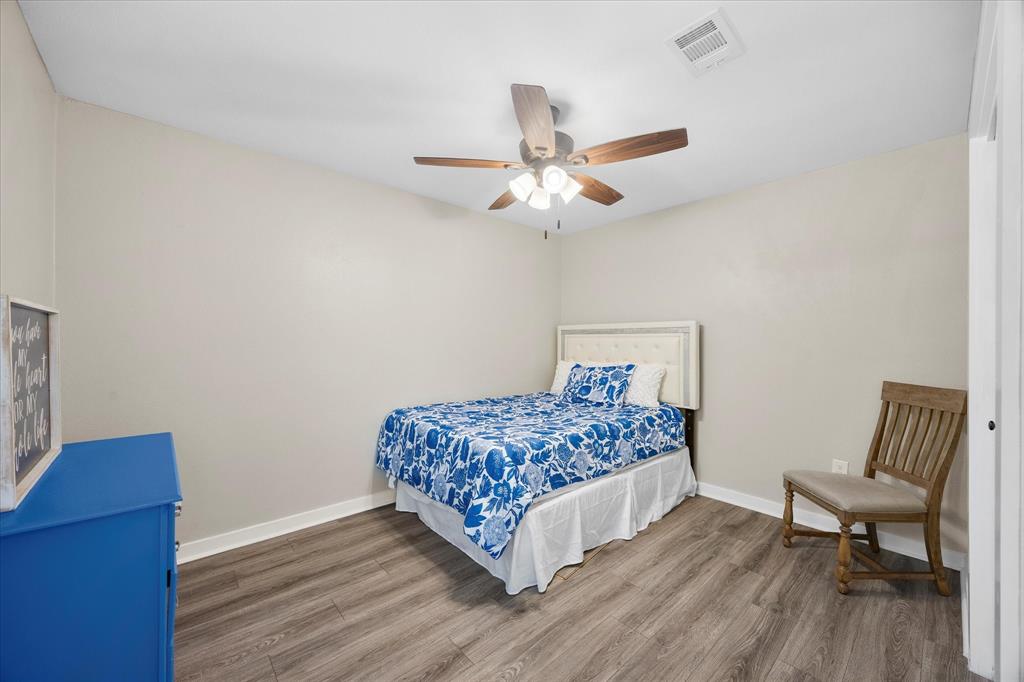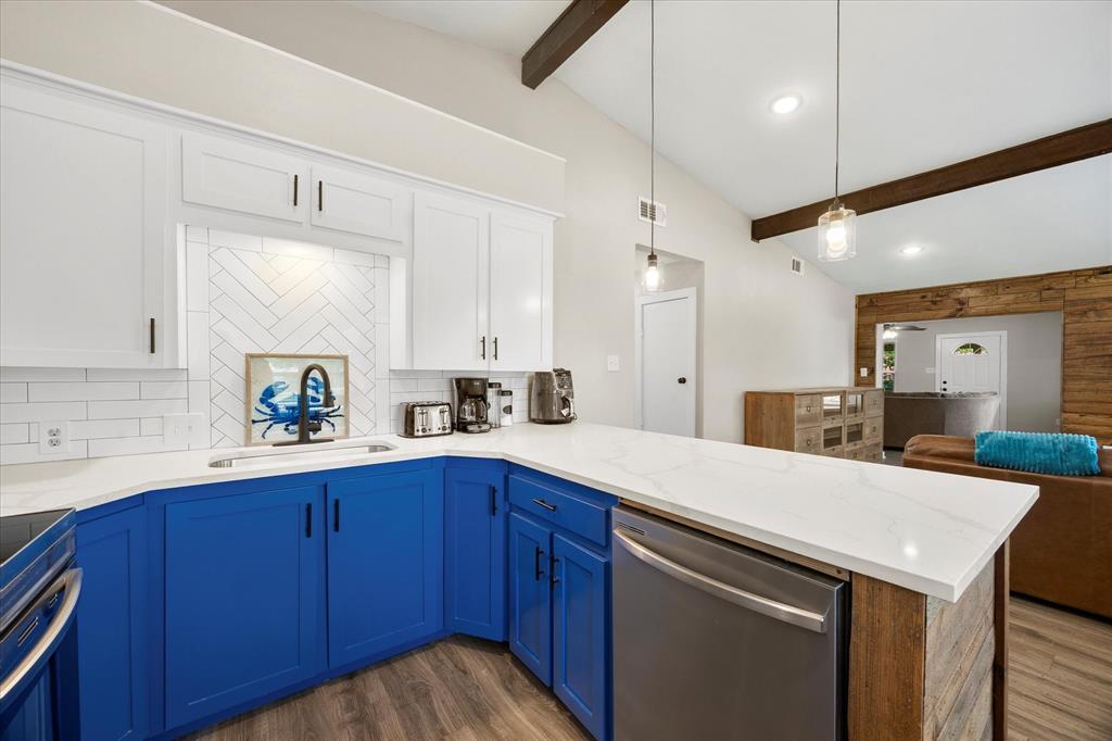 This beautifully updated home offers a warm lake community lifestyle just steps from the water. Set on a double-sized lot with multiple outdoor patios, seating areas, mature trees, and a storage building, it’s the perfect retreat for weekends or full-time living. Inside, designer touches shine with LVP flooring throughout, wood-burning fireplaces, and wood accent details on the kitchen peninsula, feature walls, and dining area. The kitchen blends modern style with charm, featuring white cabinets, wood countertops, subway tile backsplash, new hardware, and a dishwasher. The flexible layout includes dual primary bedrooms, each with private baths, decorative mirrors, walk-in closets, and built-in shelving. The oversized primary suite highlights a sliding barn door entry, a spacious walk-in shower with decorative tile, board-and-ceiling detail, shampoo shelf, and corner bench. The guest bath offers a tiled tub surround, new tub, and linen storage. Additional upgrades include a large utility room, updated water heater, and ample storage throughout. The community enhances the lifestyle with a boat ramp, park, and picnic area, perfect for enjoying lake days, fishing, or gathering with neighbors.