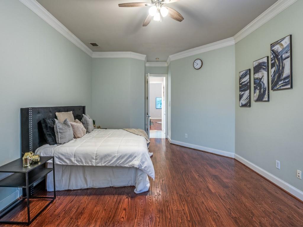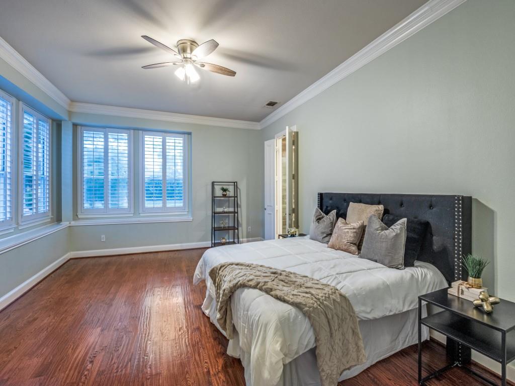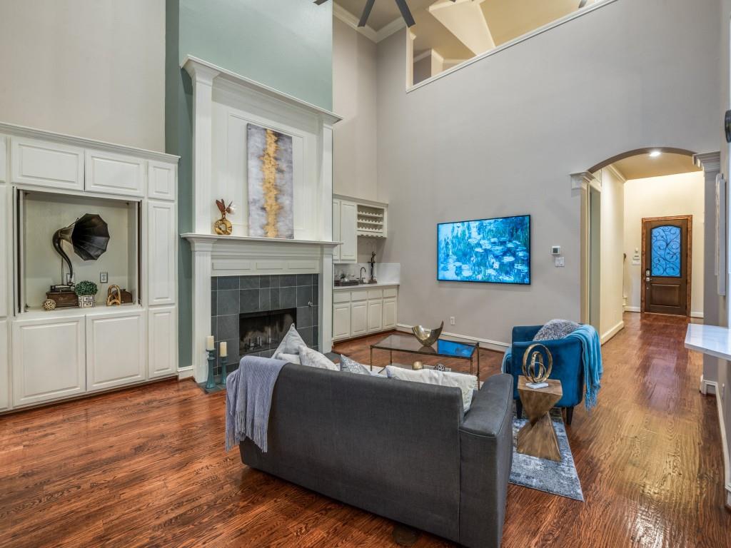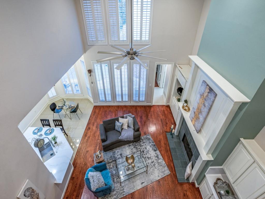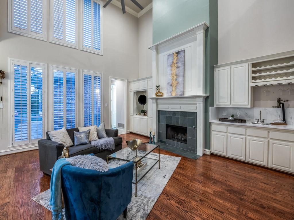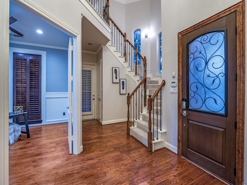 Inside, enjoy upgrades throughout: elegant foyer with winding staircase, hand-scraped wood floors, quartz countertops, stainless steel appliances, plantation shutters, crown molding, and modern fixtures. The bright family room offers built-ins, a wood-burning fireplace, and a quartz wet bar. Kitchen has white cabinets, plenty of storage, and a breakfast nook overlooking the pool.