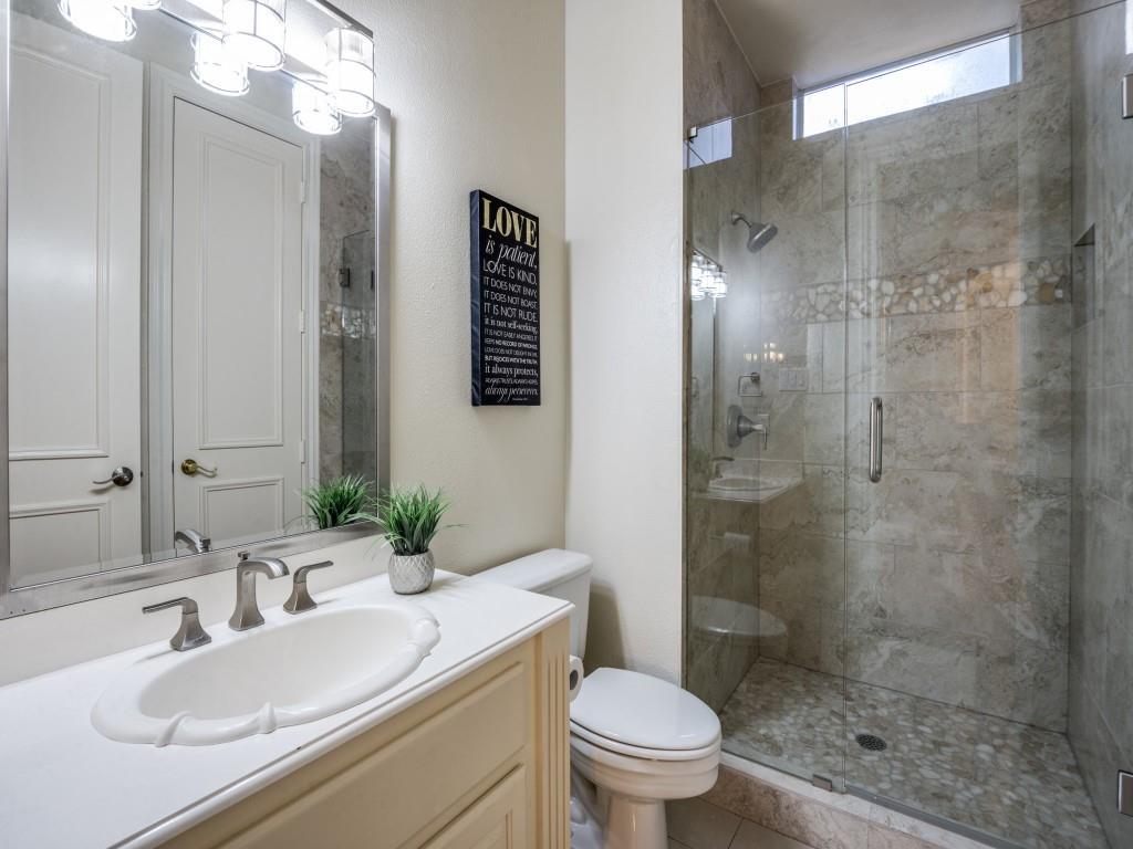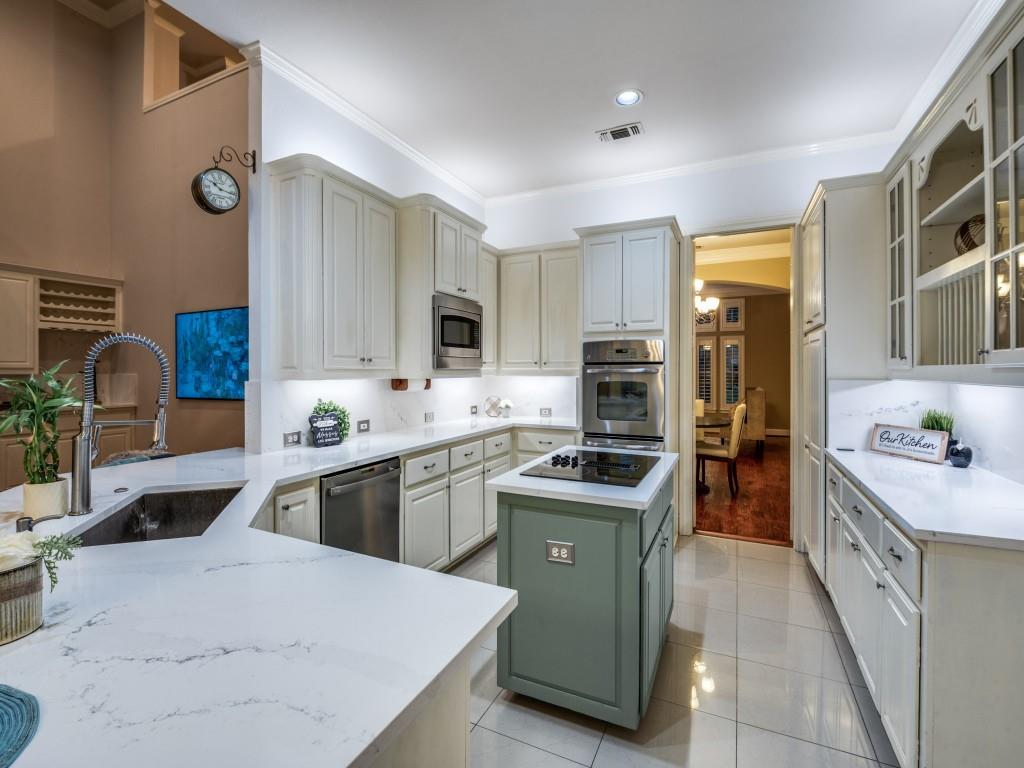 Outside, enjoy the resort-style pool with water features, extended patio, private courtyard, mature oaks, and storage shed.