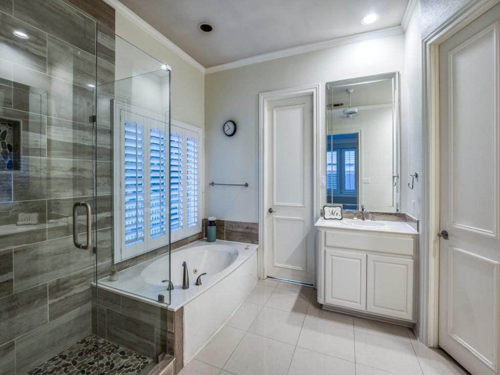 Layout includes 4 bedrooms, 4 full baths, formal living and dining rooms, a study with bath access, and a large game room. The primary suite boasts a frameless glass shower, jetted tub, dual vanities, and custom-built walk-in closet.