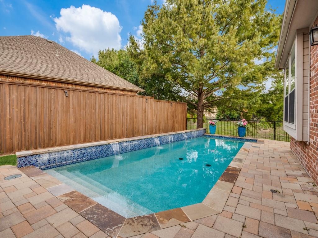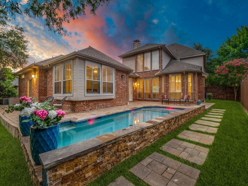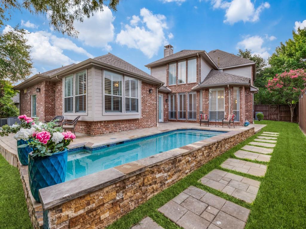 Beautiful home in West Plano, backing to a peaceful greenbelt with a sparkling pool and mature trees—perfect for relaxing or entertaining. Features a porte cochere with electric swing gate, 3-car garage, and wired for EV charging.