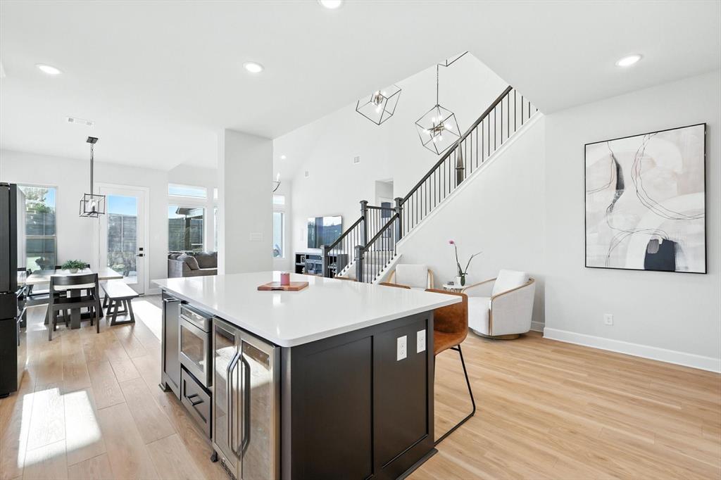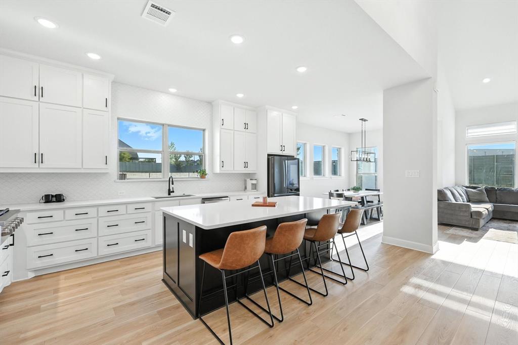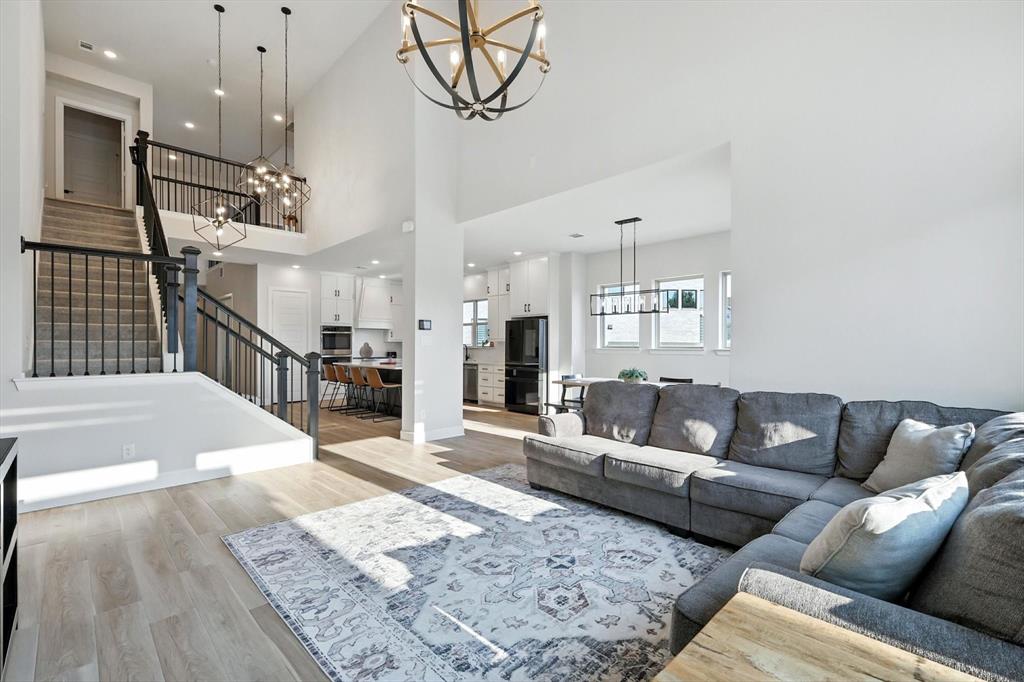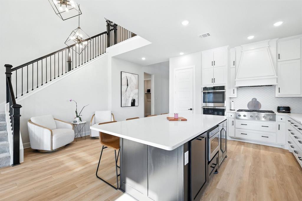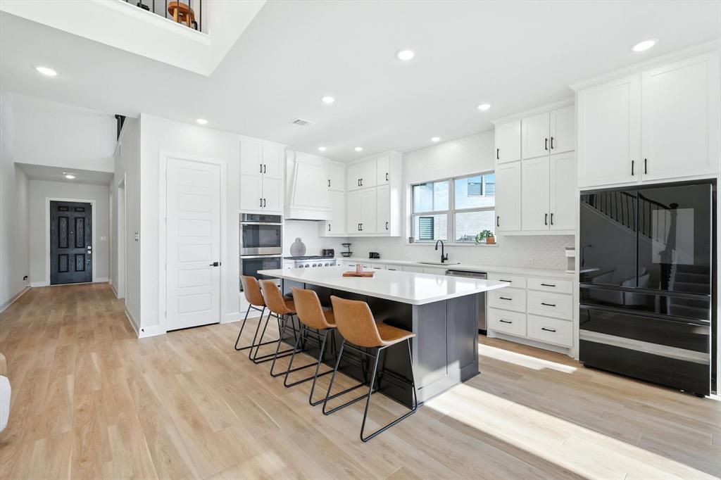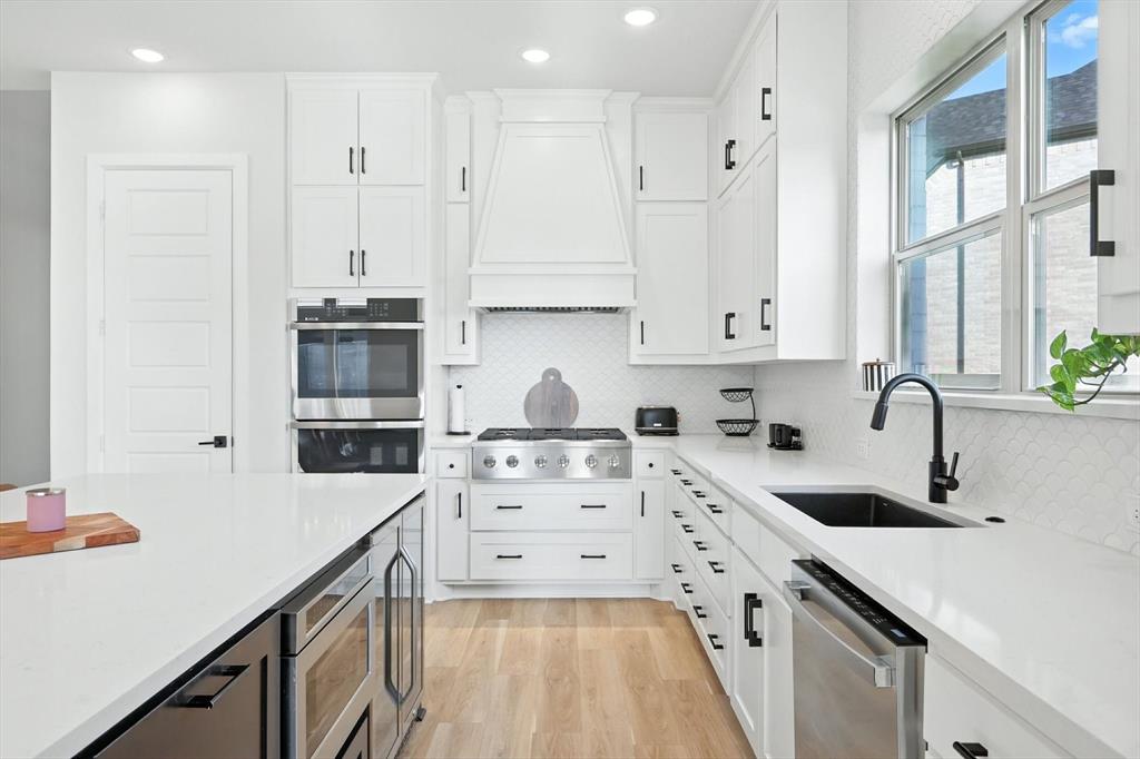 Welcome to this stunning 4 bedroom 4.5 bath home in the highly sought after Harvest neighborhood of Argyle. From the moment you arrive you will notice the charming curb appeal with a stone arch entry and modern design touches that set the tone for what awaits inside. Step into the open foyer where natural light pours through tall windows and high ceilings create a bright and inviting atmosphere. The spacious living room flows seamlessly into the chef inspired kitchen which features a large island, quartz countertops, sleek cabinetry, double ovens, and plenty of storage.