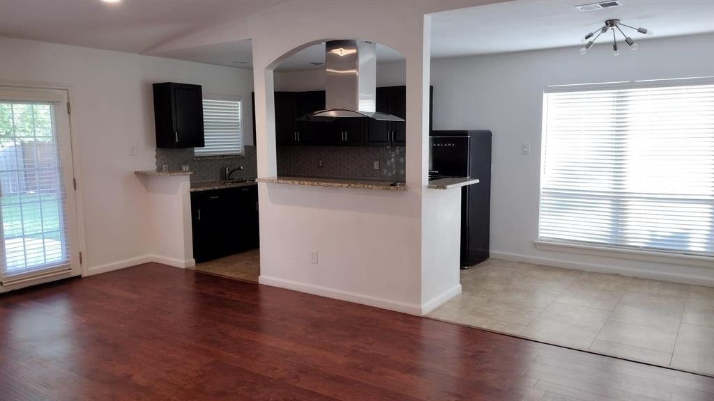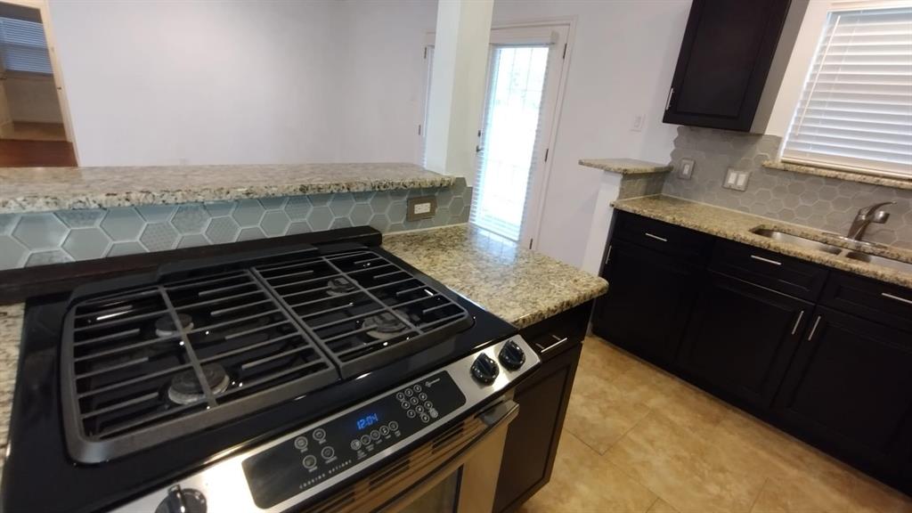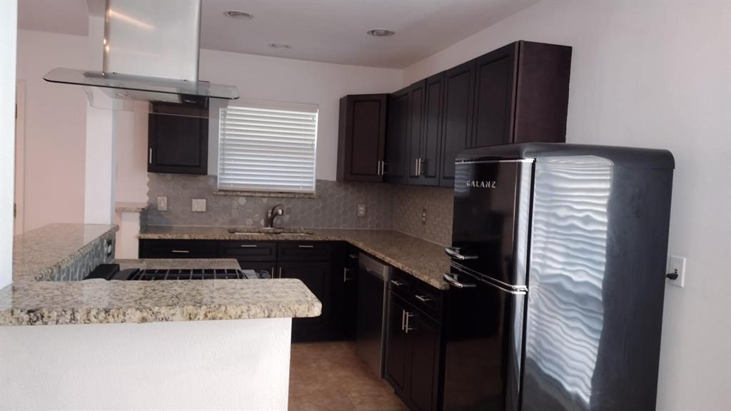 Step inside to a fully renovated kitchen featuring elegant granite countertops, stylish backsplash, and dark wood cabinetry that offers plenty of storage. The open layout connects the kitchen to the living space, making it perfect for both everyday living and entertaining.