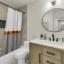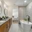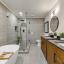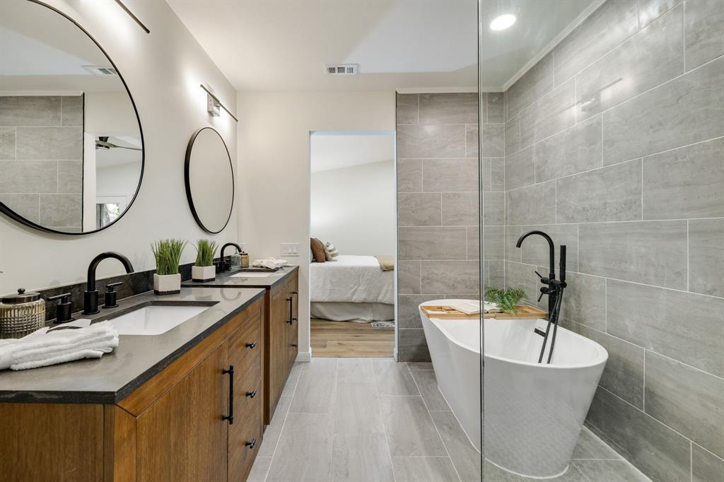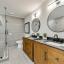 Spa inspired bathrooms with custom free-standing vanities, designer fixtures and frameless glass showers add a touch of elegance to these newly remodeled spaces.