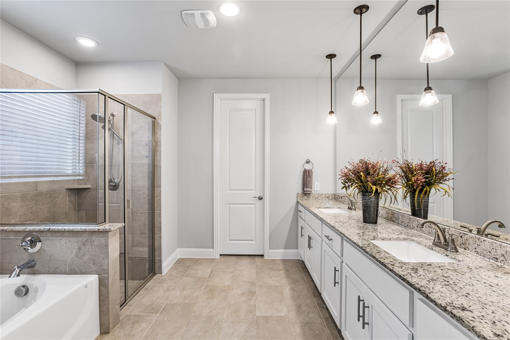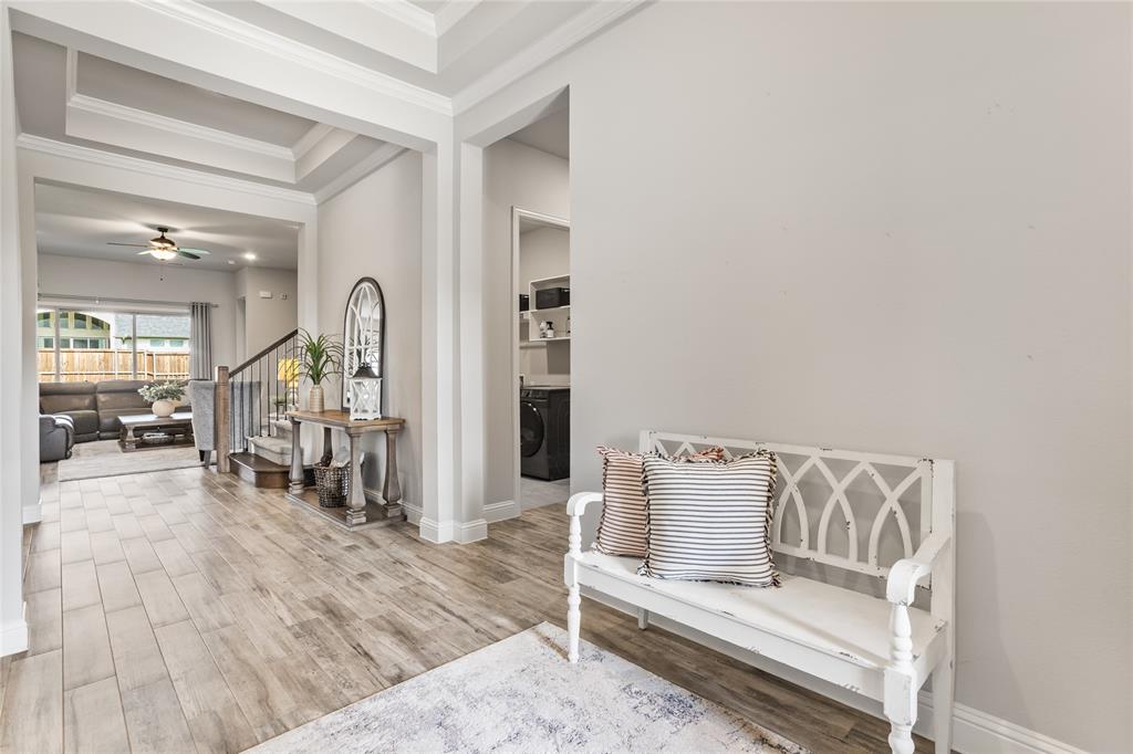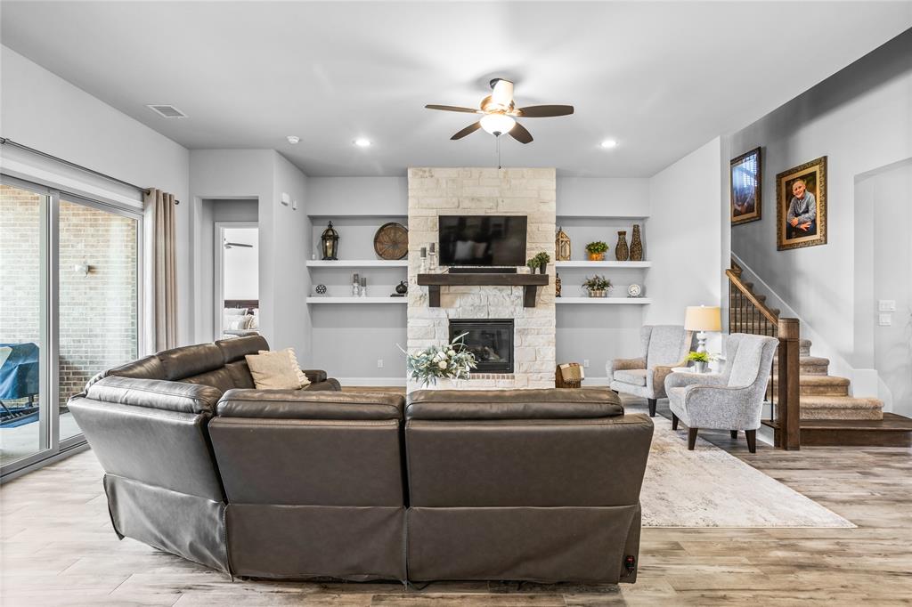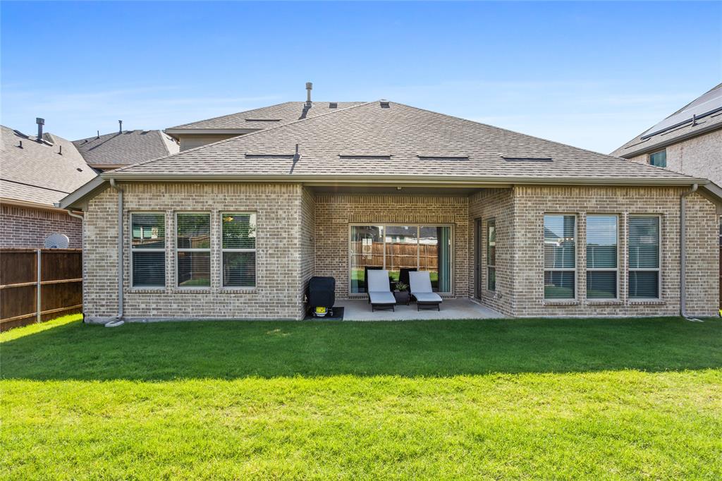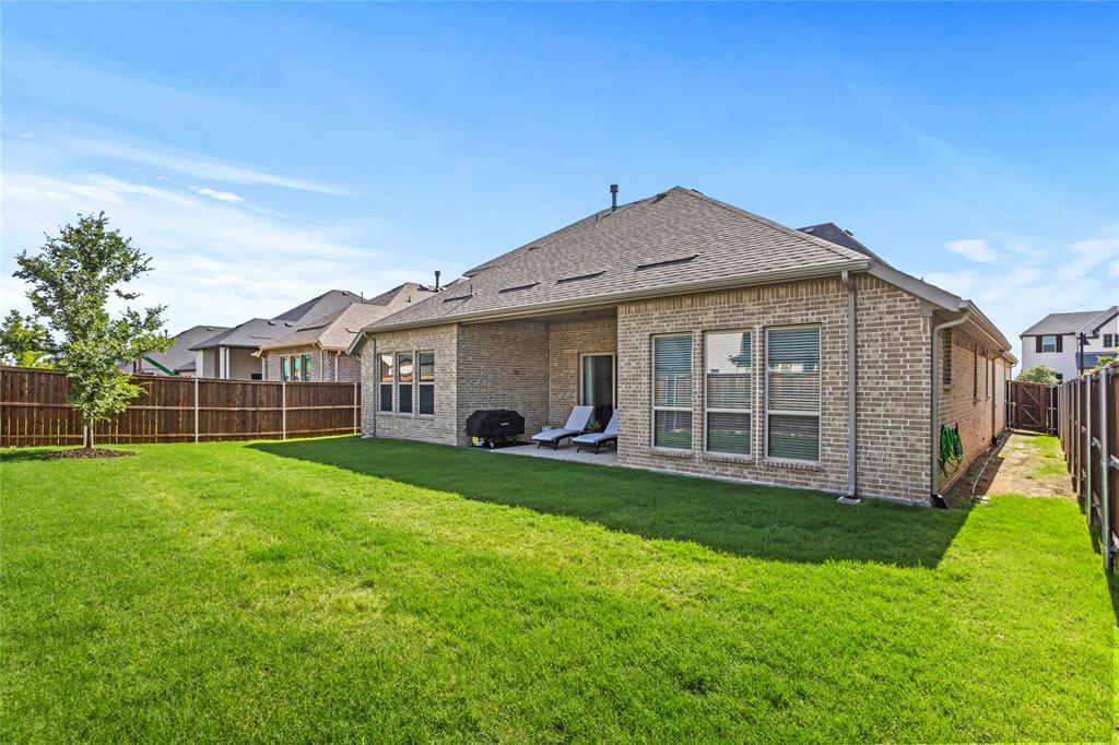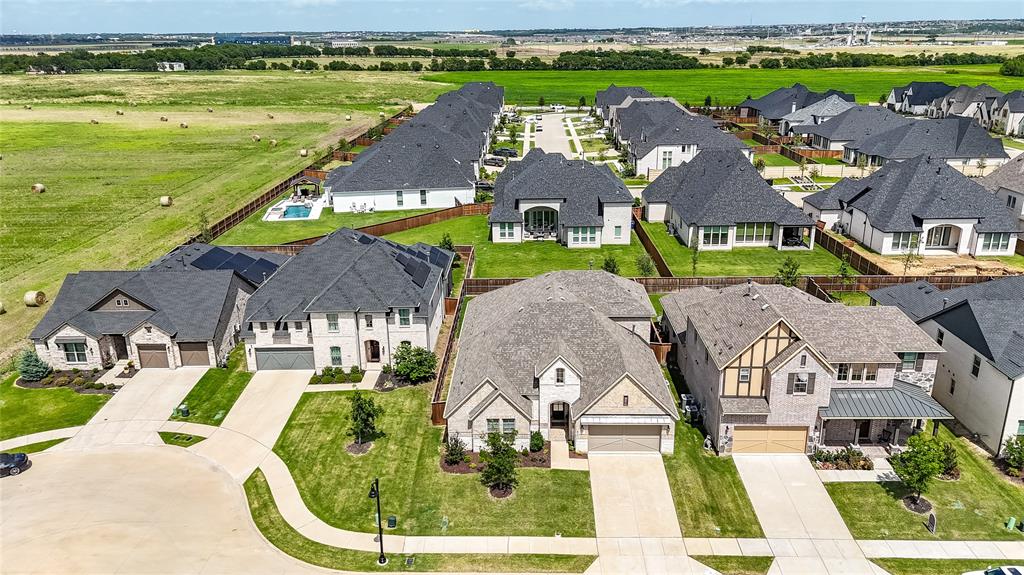 Welcome to this immaculate home nestled in the heart of the master-planned community, Cambridge Crossing in Celina, TX. Situated on a quiet cul-de-sac, this home features a striking brick and stone exterior with professional landscaping and a covered patio, perfect for relaxing or entertaining. Step inside to find a light-filled, open-concept layout with wood look tile flooring, neutral tones, and thoughtful designer touches throughout. The chef’s kitchen is a true centerpiece, featuring an oversized island with granite counters, stylish pendant lighting, an abundance of white custom cabinetry maximizing your kitchen storage space, a pot filler, and a gas cooktop. It opens seamlessly into the dining area and spacious living room, which is anchored by a beautiful stone fireplace and custom built-ins.The primary suite is a peaceful retreat with vaulted ceilings, plush carpet, and a luxurious en suite bathroom offering dual vanities, a large shower, and walk in closet. Additional highlights include a whole house water filtration system, dedicated mudroom, all bedrooms downstairs, and an upstairs with a flexible layout that's ideal for game or media room, a private home office, a playroom or guest space with a private half bath. At the end of the cut de sac enjoy beautiful pasture land and cattle that come visit some evenings in true Texas form. Located in Cambridge Crossing, residents enjoy resort-style amenities including an elegant clubhouse, multiple pools, a fitness center, tennis and pickleball courts, scenic walking trails, playgrounds, and stocked fishing ponds. All within the highly acclaimed Celina ISD and with convenient access to the Dallas North Tollway, nearby shopping, and charming Downtown Celina. This home perfectly blends luxury, comfort, and community living! Schedule your private showing today!