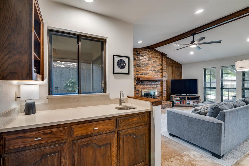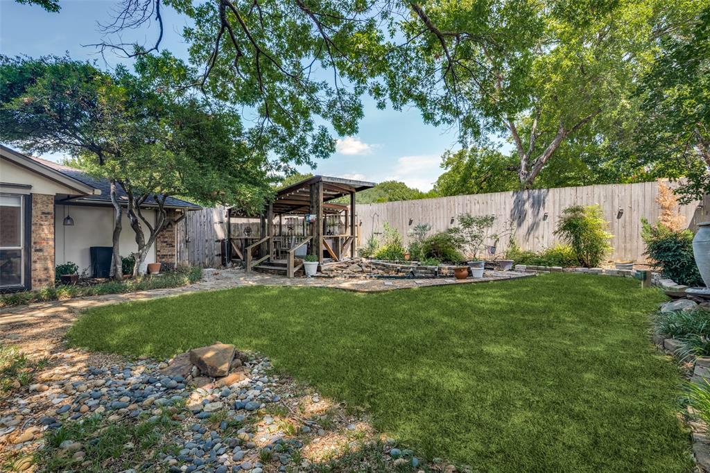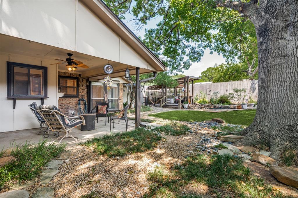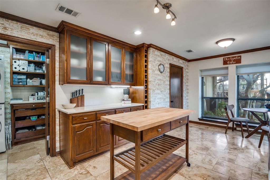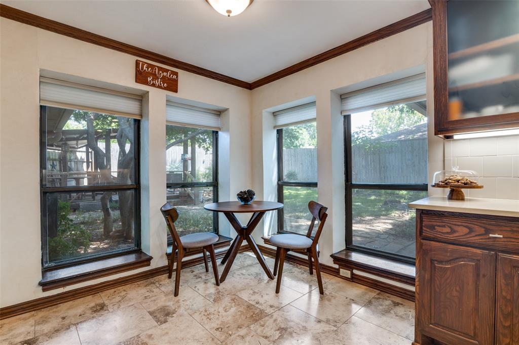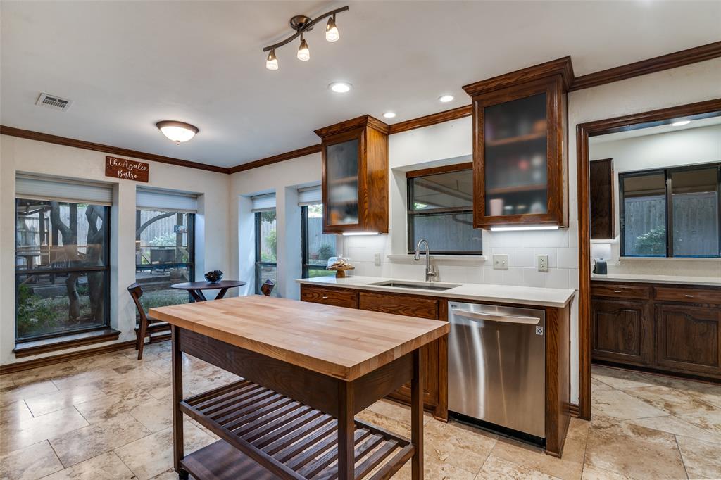 Pull up and immediately and feel the pride of ownership. The charming exterior is framed by stone-edged flower beds, lush plantings, and mature trees. Step inside to enjoy the elegance of travertine tile flooring throughout the living and dining areas where a built-in wet bar creates a seamless space ideal for gatherings. Remodeled kitchen features a farm sink, custom cabinetry, pull-outs and decorative glass front cabinets, an island, quartz countertops with recessed and under-counter lighting and a cozy breakfast nook bathed in natural lighting overlooking private backyard oasis. The outdoor space has a covered patio and cabana ideal for outdoor entertaining. The spacious primary bedroom with wood floors features a remodeled ensuite with custom cabinets, double sinks, walk in shower and two closets! The additional bedrooms can flex as guest rooms, office, or playroom. Laundry room has full-size stackable WD with custom cabinetry and pull-out shelving for so much storage! Refrigerator, washer & dryer can stay! With NO HOA, proximity to a lovely neighborhood park, and quick access to major highways, this Garland residence offers both convenience and character- an ideal blend for buyers seeking comfort and ease. This is a must see! Remodel info attached