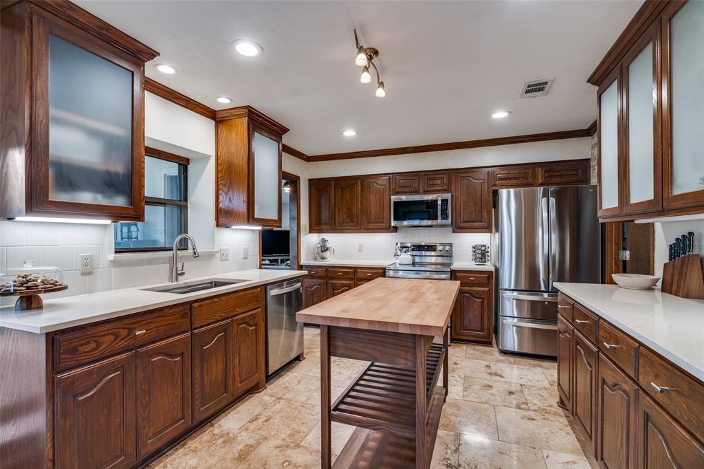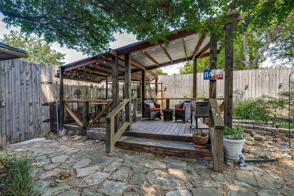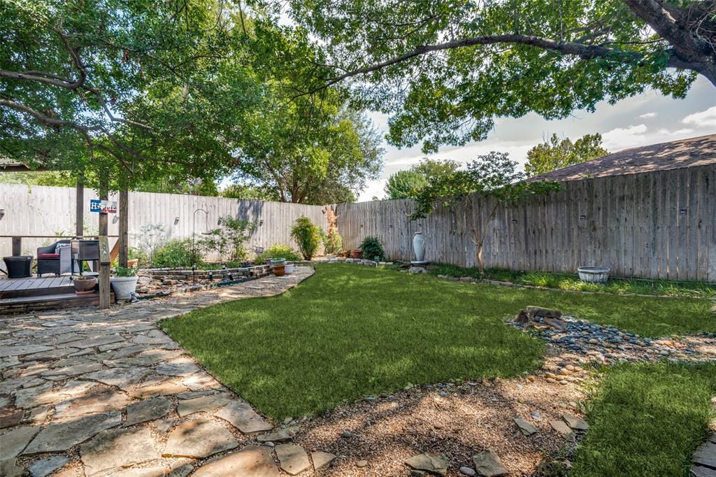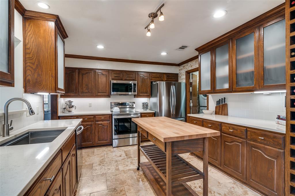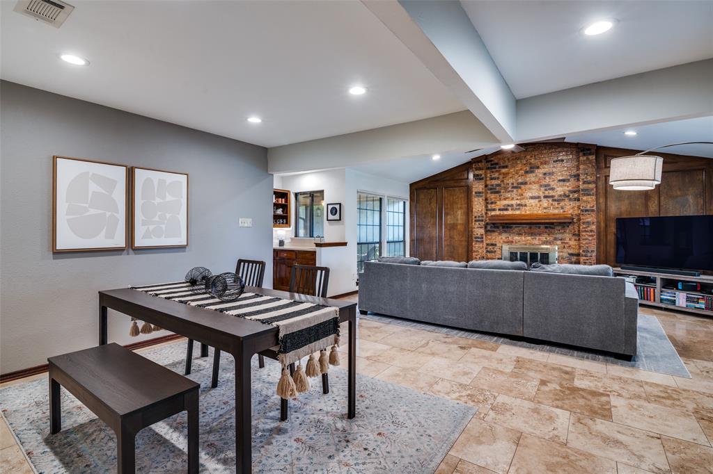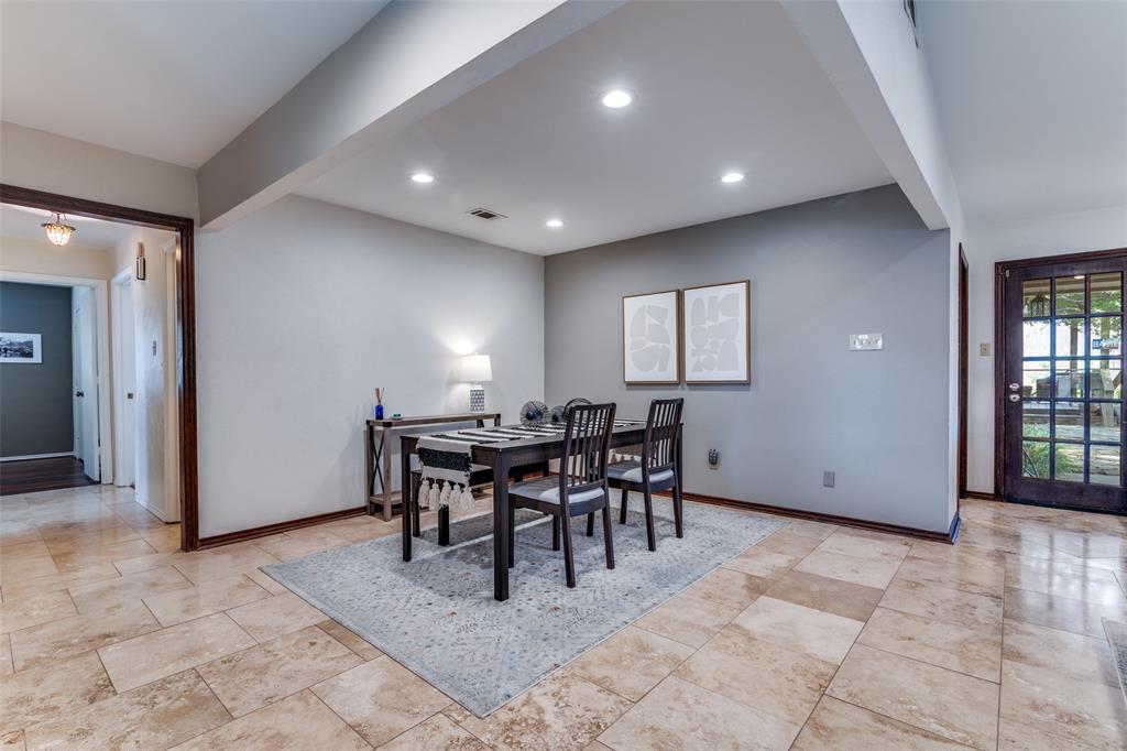 Pull up and immediately and feel the pride of ownership. The charming exterior is framed by stone-edged flower beds, lush plantings, and mature trees. Step inside to enjoy the elegance of travertine tile flooring throughout the living and dining areas where a built-in wet bar creates a seamless space ideal for gatherings. Remodeled kitchen features a farm sink, custom cabinetry, pull-outs and decorative glass front cabinets, an island, quartz countertops with recessed and under-counter lighting and a cozy breakfast nook bathed in natural lighting overlooking private backyard oasis. The outdoor space has a covered patio and cabana ideal for outdoor entertaining. The spacious primary bedroom with wood floors features a remodeled ensuite with custom cabinets, double sinks, walk in shower and two closets! The additional bedrooms can flex as guest rooms, office, or playroom. Laundry room has full-size stackable WD with custom cabinetry and pull-out shelving for so much storage! Refrigerator, washer & dryer can stay! With NO HOA, proximity to a lovely neighborhood park, and quick access to major highways, this Garland residence offers both convenience and character- an ideal blend for buyers seeking comfort and ease. This is a must see! Remodel info attached