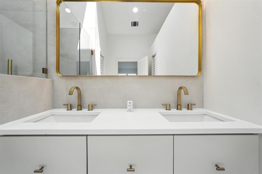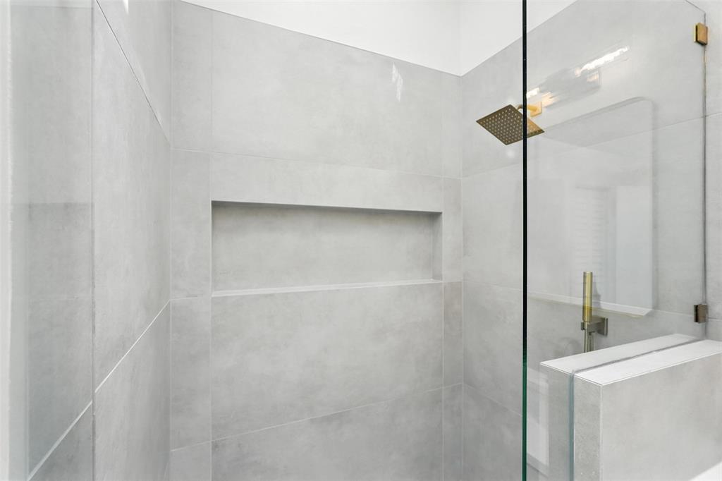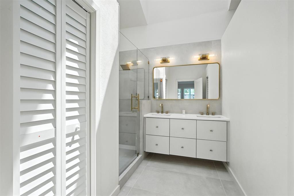 The primary suite is a luxurious retreat with a spacious walk-in closet and spa-inspired bath showcasing oversized 24x48 designer tile, a walk-in glass shower with a rainfall-style shower head, floating double vanity, and sleek gold fixtures. The second bathroom has also been fully updated with contemporary finishes and direct patio access.