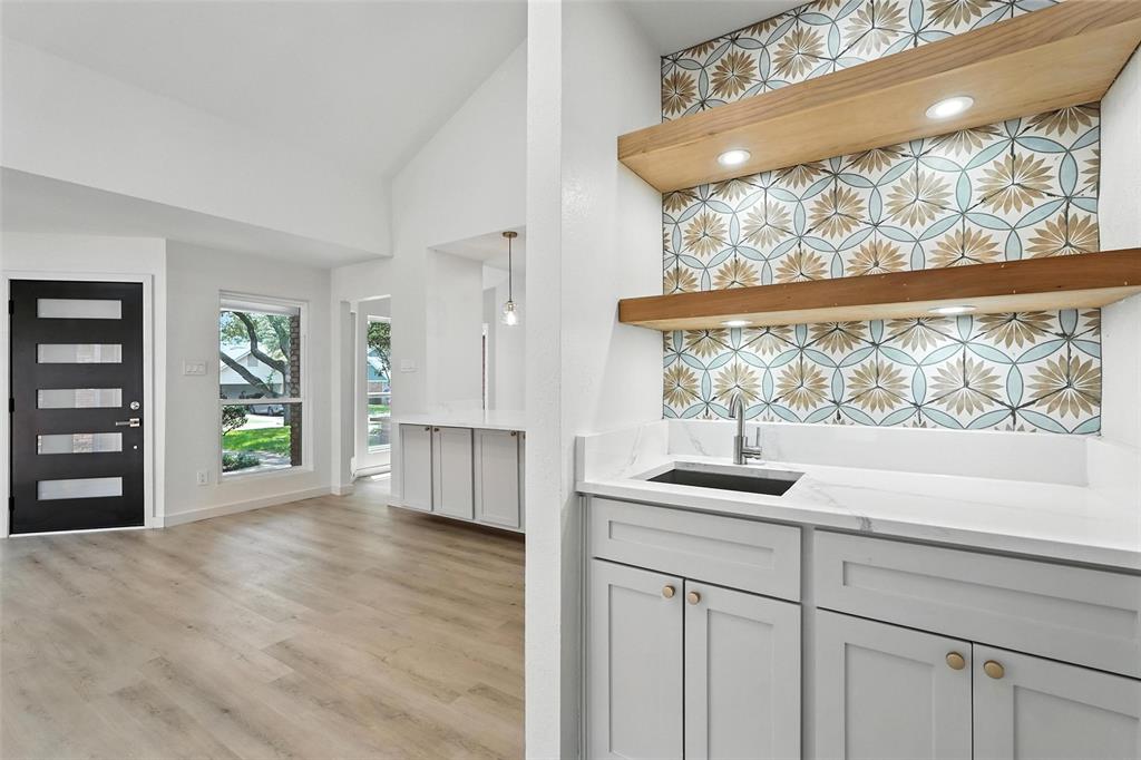 Wet bar with open shelving, accent tile, and LED lighting — perfect for entertaining