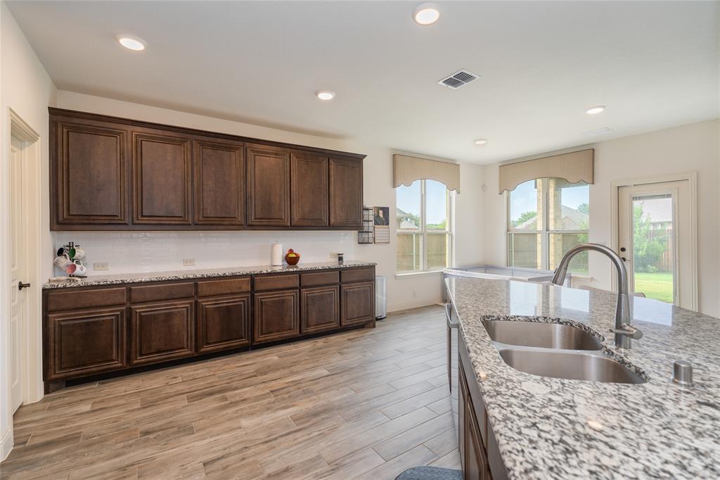 The gourmet kitchen is the heart of the home, featuring granite countertops with a tile backsplash, ample cabinetry and counter space, stainless steel appliances, a gas range, a pantry, and a large island with a breakfast bar. An eat-in dining area and formal dining room provide plenty of space for entertaining.
