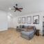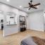 The recessed entry door, thoughtfully set back from the street for added privacy and reduced noise, opens into a spacious living room highlighted by stunning wood-look ceramic tile in a herringbone pattern that flows throughout the main living areas. The open layout connects seamlessly to the eat-in kitchen, complete with a pass-through breakfast bar and direct access to the backyard through sliding glass doors.