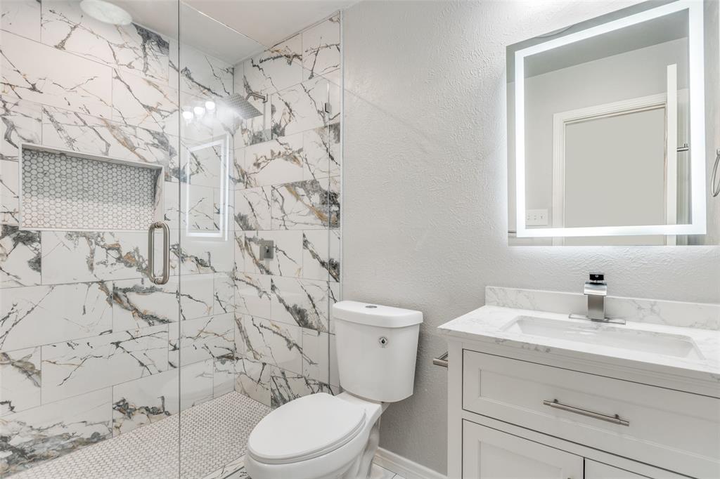 The primary suite offers a walk-in closet and a remodeled en-suite bath with a powered vanity mirror and separate shower. The home also includes a garage door opener for added convenience.