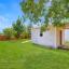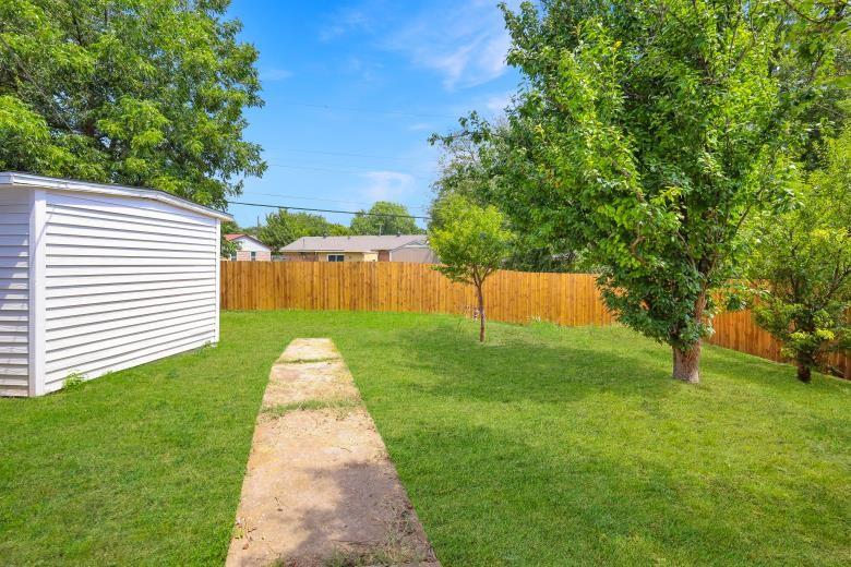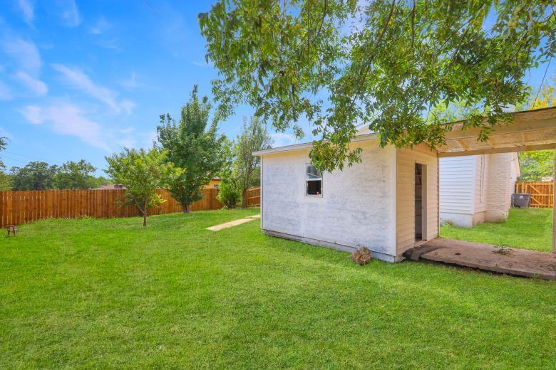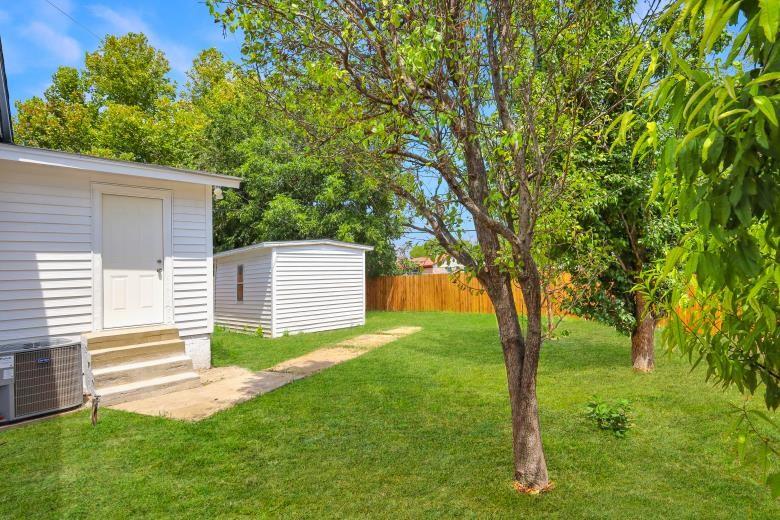 The large, fenced backyard features mature fruit trees, a garden area, and a versatile workshop or storage space.
